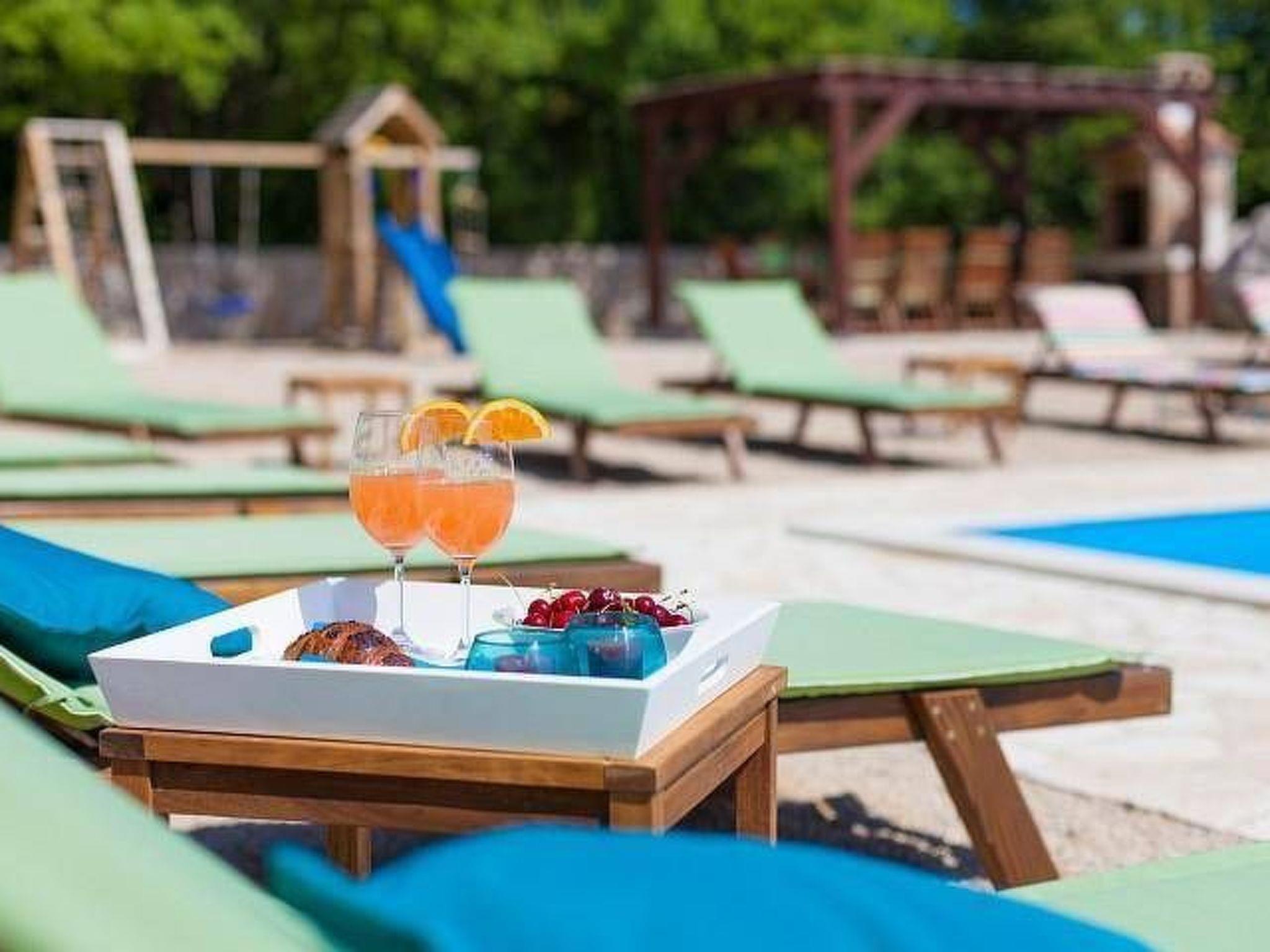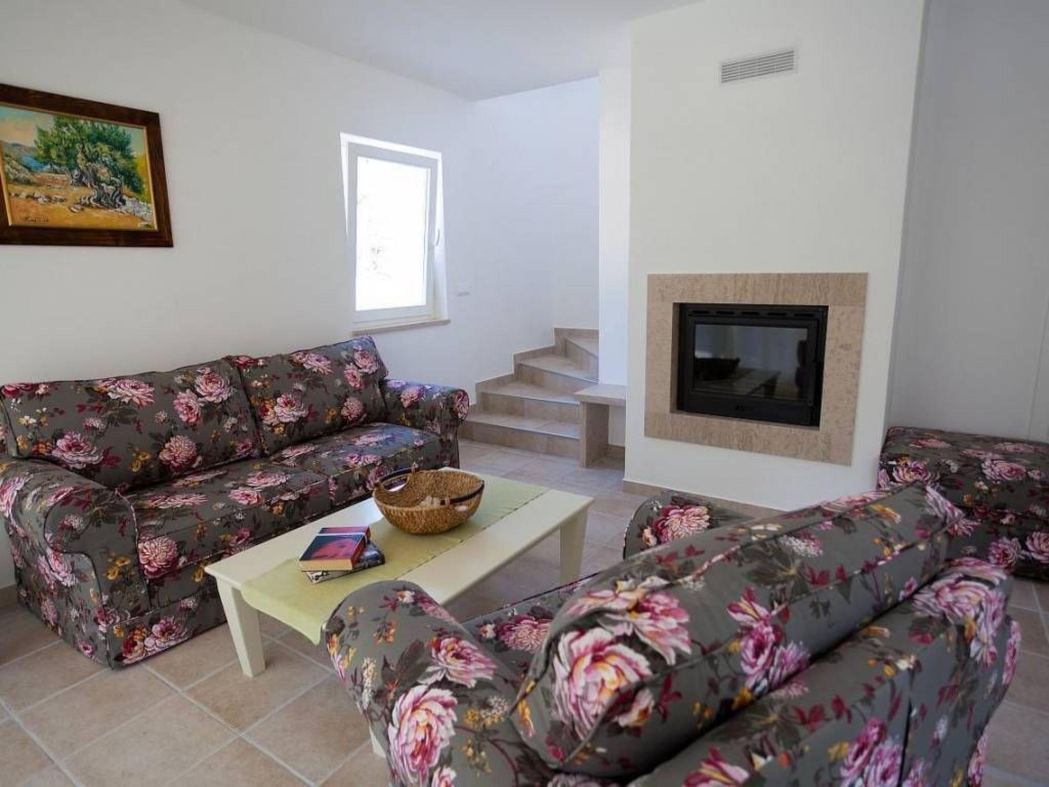 Enclosed, newly built (2013) holiday villa with a private pool, an outdoor shower, a traditional stone grill on the roofed terrace, a children’s playground and three self-contained holiday apartments next to each otherThis exclusive holiday villa is in the peaceful little village of Kras in the middle of the sunny island of Krk, providing luxurious accommodation for a relaxing holiday far away from tourist noise. The holiday villa was newly built just recently in 2013 and is therefore equipped with all the necessary modern amenities for a comfortable stay, including air conditioning (cooling and heating) in all rooms. It comprises three modern and tastefully furnished holiday apartments next to each other, each with its own separate entrance. As the three apartments, each of 100m², can only be booked together, the villa is particularly suitable for a large family or a group of friends who would like to retain some privacy on their holiday together. The holiday apartments are on two floors and have an identical layout and furnishing, each with a light and airy living and dining room with an integrated, open kitchen, two bedrooms and two spacious daylight bathrooms. The ground floor has a living room flooded with daylight, providing a comfortable sofa and armchair, a coffee table and a wide, digital flatscreen TV with satellite channels. The open fireplace built into the wall exudes a cosy atmosphere and provides pleasant warmth on cooler evenings. Right next to it there is the white built-in kitchen with only the latest appliances, including a dishwasher, a ceramic hob with an elegant extractor fan, an electric oven, a fridge with a freezer compartment, a microwave, a kettle and a coffee machine. The ground floor also has one of the two bathrooms, this one with a spacious shower cubicle, a washbasin with a big wall mirror, a hairdryer, bidet, toilet and washing machine. Wide stone stairs lead upstairs to the bedrooms and the second bathroom. One of the two bedrooms has a double bed measuring 160 x 200cm, while the second has two single beds measuring 90 x 200cm, which can also be joined together as a double bed. Both bedrooms are furnished with bedside tables and reading lamps, as well as cupboards with plenty of storage space for your clothing and luggage. The bathroom on this floor is fitted the same as the ground-floor bathroom, but instead of the shower cubicle it has a bath with a shower attachment, and no washing machine. Plenty of bed linen and towels are provides and the reliable wireless Internet connection in the apartment is free of charge. Big glass sliding doors in the living room open directly onto your sunny terrace with a wooden table and chairs for leisurely holiday breakfasts and other meals. From there you can access the 8 x 4m private pool with comfortable sun loungers. Children will enjoy the playground with a swing and slide. The roofed terrace has a traditional stone grill, inviting you to enjoy long meals together under a starry sky. A car is recommended during your stay. There are plenty of secure parking spaces right in front of the holiday villa on the enclosed site. If you do not wish to travel without your pet then it is also welcome here. Your holiday villa is only about 500 metres from the centre of the little village of Kras with its shops, colourful markets and gastronomy. It is about 8km to the nearest beach with crystal clear water. There are many cycling and hiking trails in the immediate vicinity, for exploring the multifaceted island.