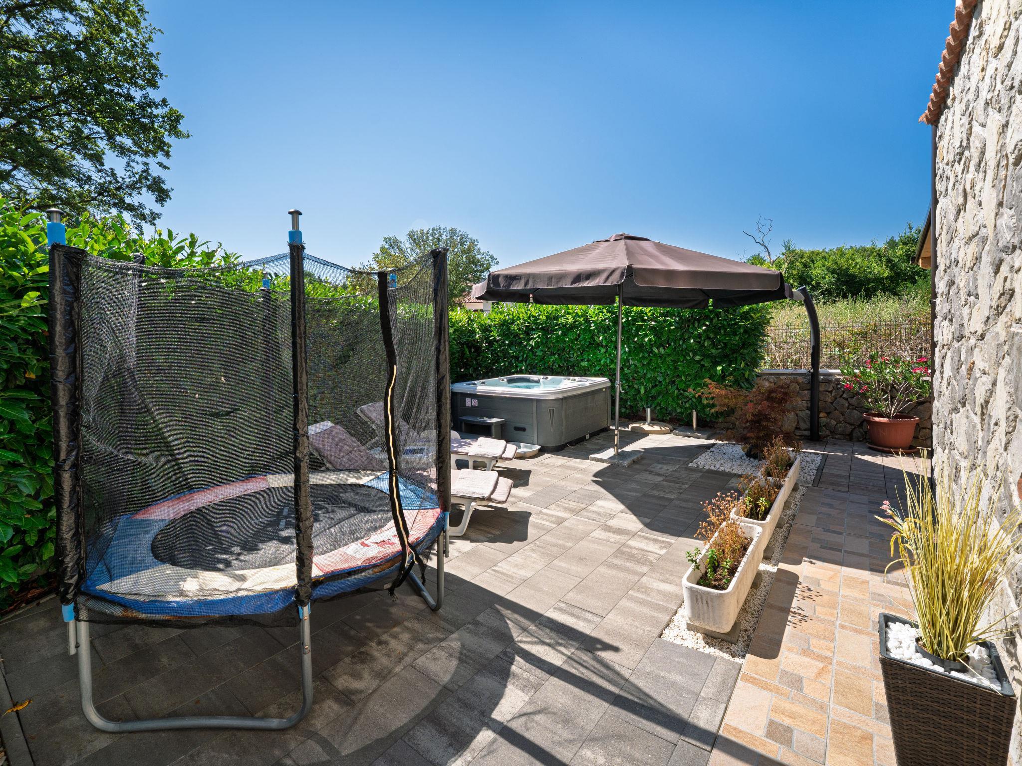 Gornja Hlapa 2 km from Dobrinj: Cosy semi-detached house "Villa Agnes", 3 storeys. 3 km from the centre of Soline, 5 km from the centre of Klimno, 12.5 km from the centre of Malinska, in a quiet, sunny position, 2.5 km from the sea, 2.5 km from the beach, in a cul-de-sac. Private: property 360 m2 (fenced), garden 270 m2 with flowers and trees, swimming pool angular (12 m2, depth 120 cm, seasonal availability: 01.May. - 30.Sep.) with internal staircase. Outdoor shower, hot tub, garden furniture, barbecue, pool maintenance by the owner/gardener. In the house: internet access, table football, washing machine. Parking (for 2 cars) at the house on the premises. Shop 950 m, supermarket 11 km, restaurant 950 m, bus stop 5.2 km, pebble beach 2.5 km, concrete beach 2.5 km. Marina 17 km, walking paths from the house 200 m, cycle lane 250 m, children's playground 2.3 km. Nearby attractions: Wakeboard Cable Krk 17 km, Diving club 17 km, Biserujka cave 8 km, Franciscan monastery island Košljun 17 km, The Frankopan castle Krk 16 km. Groups of teenagers on request only.