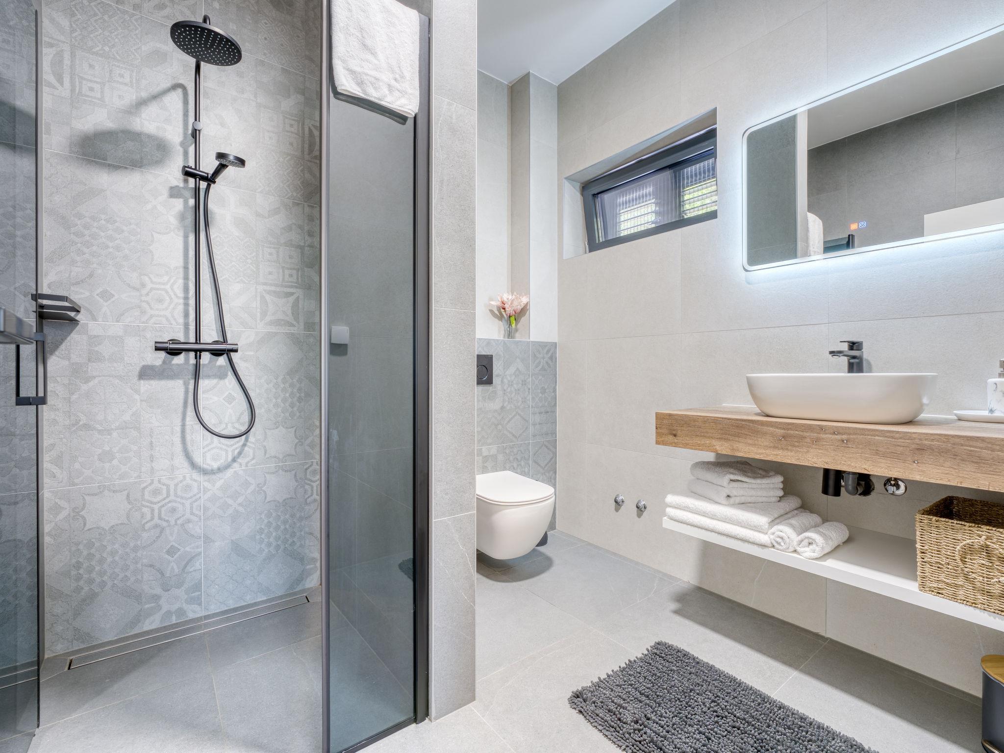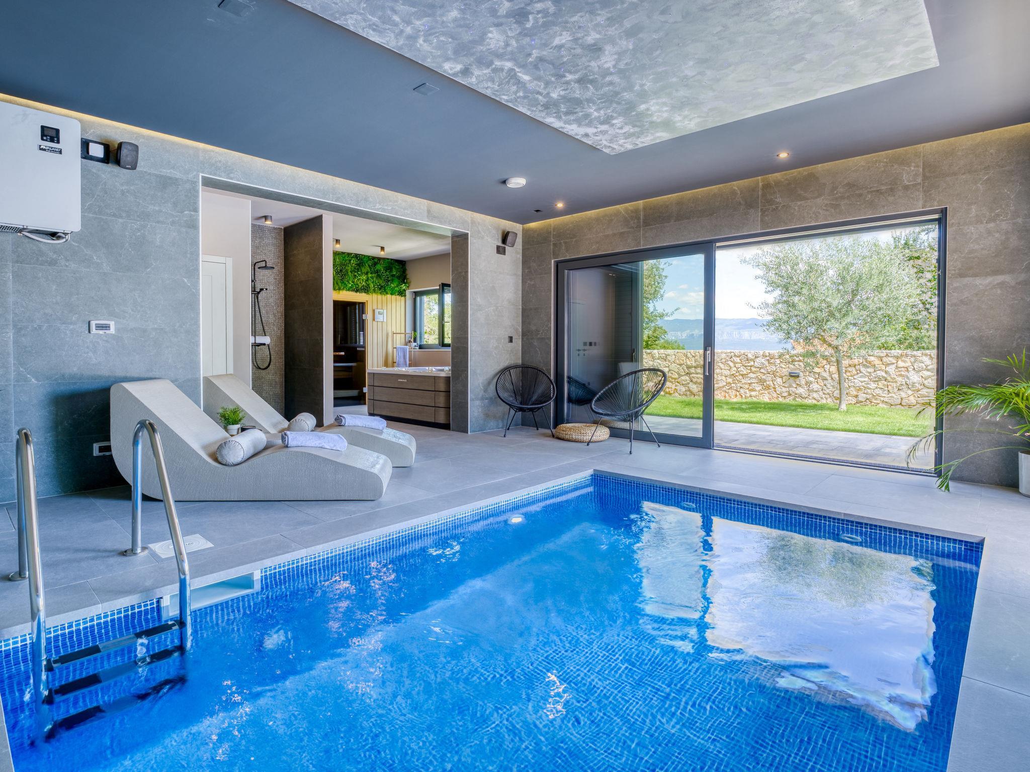 Klanice: Beautiful villa "Le Maris", 3 storeys, built in 2023. 4 km from the centre of Dobrinj, 6 km from the centre of Malinska, in a quiet, sunny, elevated position, 3.5 km from the sea, 3.5 km from the beach, in a cul-de-sac. Private: property 800 m2 (fenced), well-kept garden with lawn, swimming pool, indoor pool heated (8 m2, depth 130 cm, seasonal availability: 01.Jan. - 31.Dec.). Outdoor shower, table tennis, badminton, barbecue, pool maintenance by the owner/gardener. In the house: internet access, sauna, fitness room, hot tub (all included), trampoline, roof terrace, central heating system, air conditioning, washing machine, tumble dryer. Parking (for 3 cars) at the house on the premises. Shop 200 m, supermarket 6 km, restaurant 2 km, bus stop 5 km, sandy beach "Cižici" 3.5 km. Groups of teenagers on request only. Please note: airfield 15 km from the property. Private: swimming pool (30m2, depth: 1,50m ,angular, heated, available 01.04.- 15.10.).