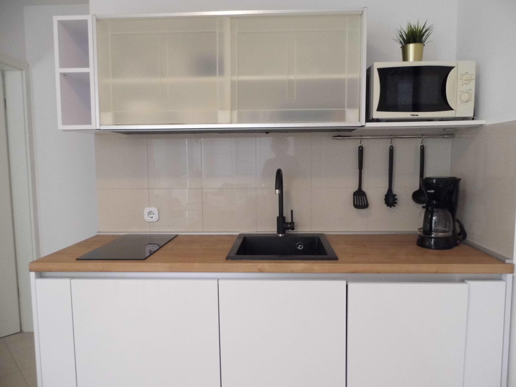 further is kitchen nice modern with electric stove, dishwasher, coffee machine, microwave, fridge with freezer, table and chairs for all.