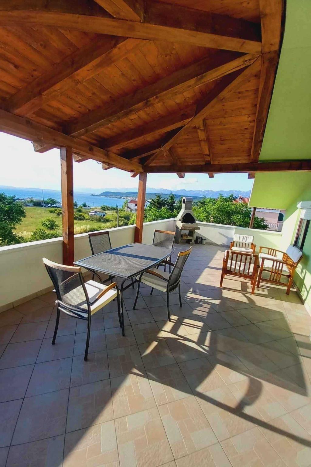 This family run apartment is ideal for 4 persons but it can accomodate up to 5 persons. Apartment has two bedrooms: one with double bed (160x2), and the other bedroom with double bed (140x2) and 1 single bed. There's a sofa in the living room, kitchen fully equipped with dishwasher, oven, kettle, coffee machine, microwave, fridge with freezer...Apartment is situated on the first floor, it has spacious terrace (30 sqm) with amazing sea view and own grill. Also, apartment has it's own entry. Pool (33 sqm), separated Whirpool (5 persons), and sunbathing place (with loungers and parasols) are shared with one more apartment. Hosts are also living in the house, and ready to help if needed.