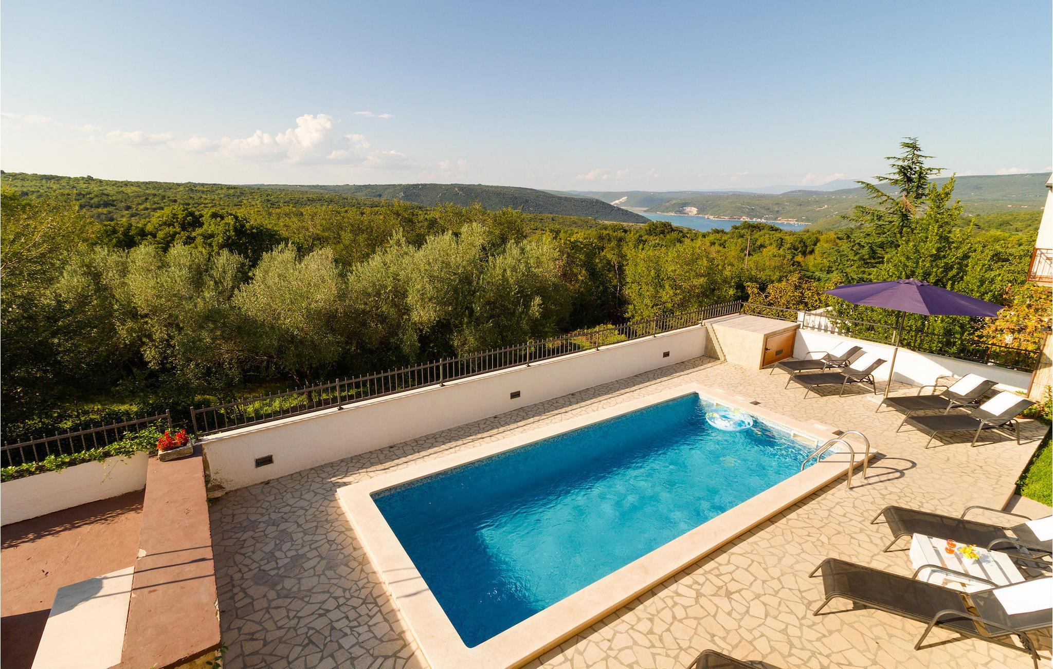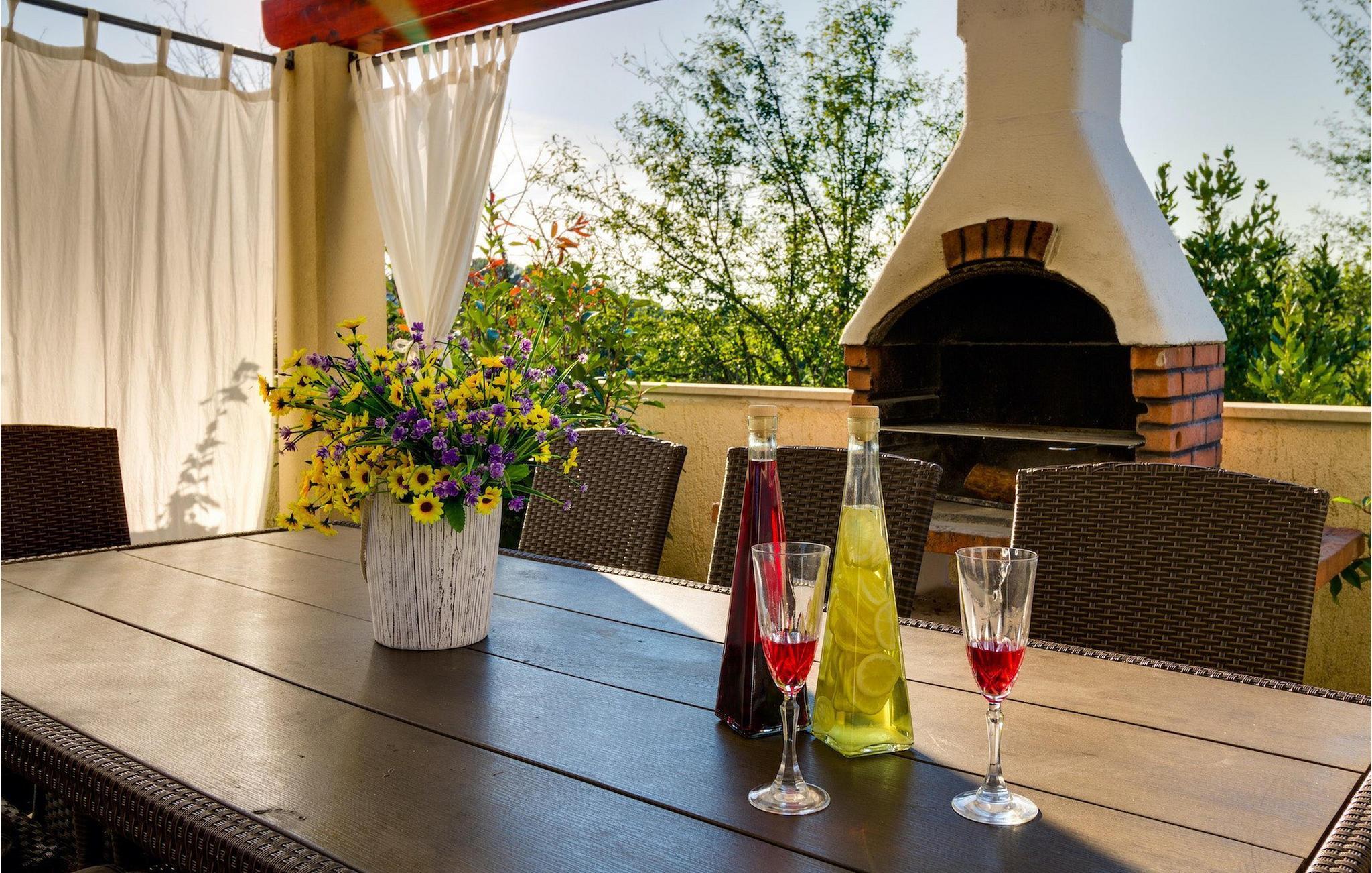 Der Außenbereich umfasst einen komplett eingezäunten Garten mit Pool, wo Sie entspannen und die Sonne Istriens genießen können. Auf der Terrasse steht ein Essbereich im Freien mit Holzkohlengrill zur Verfügung. Hier können Sie leckere Mahlzeiten zubereiten oder einfach ein Glas guten istrischen Weins genießen.