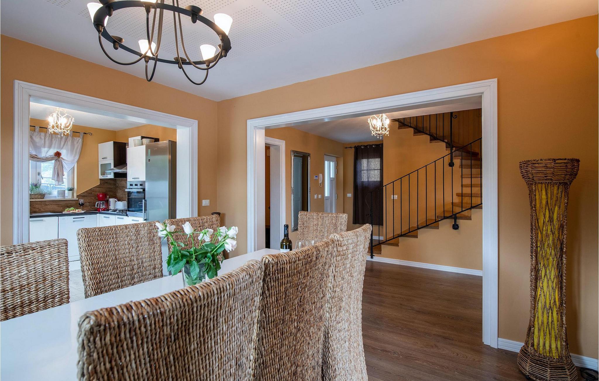 Mit insgesamt 3 Schlafzimmern kann diese moderne, geräumige Villa 8 Gäste beherbergen. Das Erdgeschoss besteht aus einer komplett ausgestatteten Küche, einem Essbereich für 8 Personen, einer separaten Toilette und einem Wohnzimmer mit charmanten Holzbalken und Details, die dem ganzen Raum eine gemütliche Atmosphäre geben. Im Obergeschoss befinden sich 3 elegant ausgestattete Zimmer, zwei davon mit einem Extrabett. Die Zimmer verfügen über jeweils ein privates Badezimmer und ein Zimmer hat sogar ein Balkon mit einem fantastischen Blick auf die Umgebung.