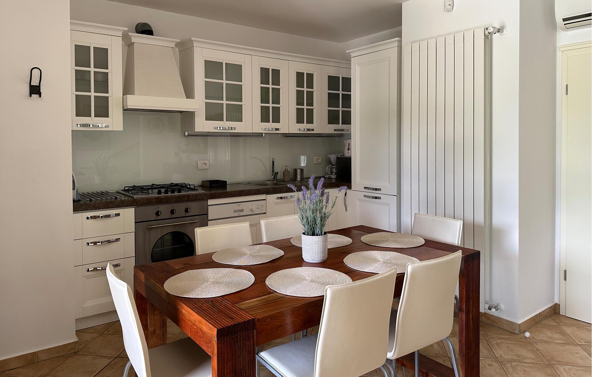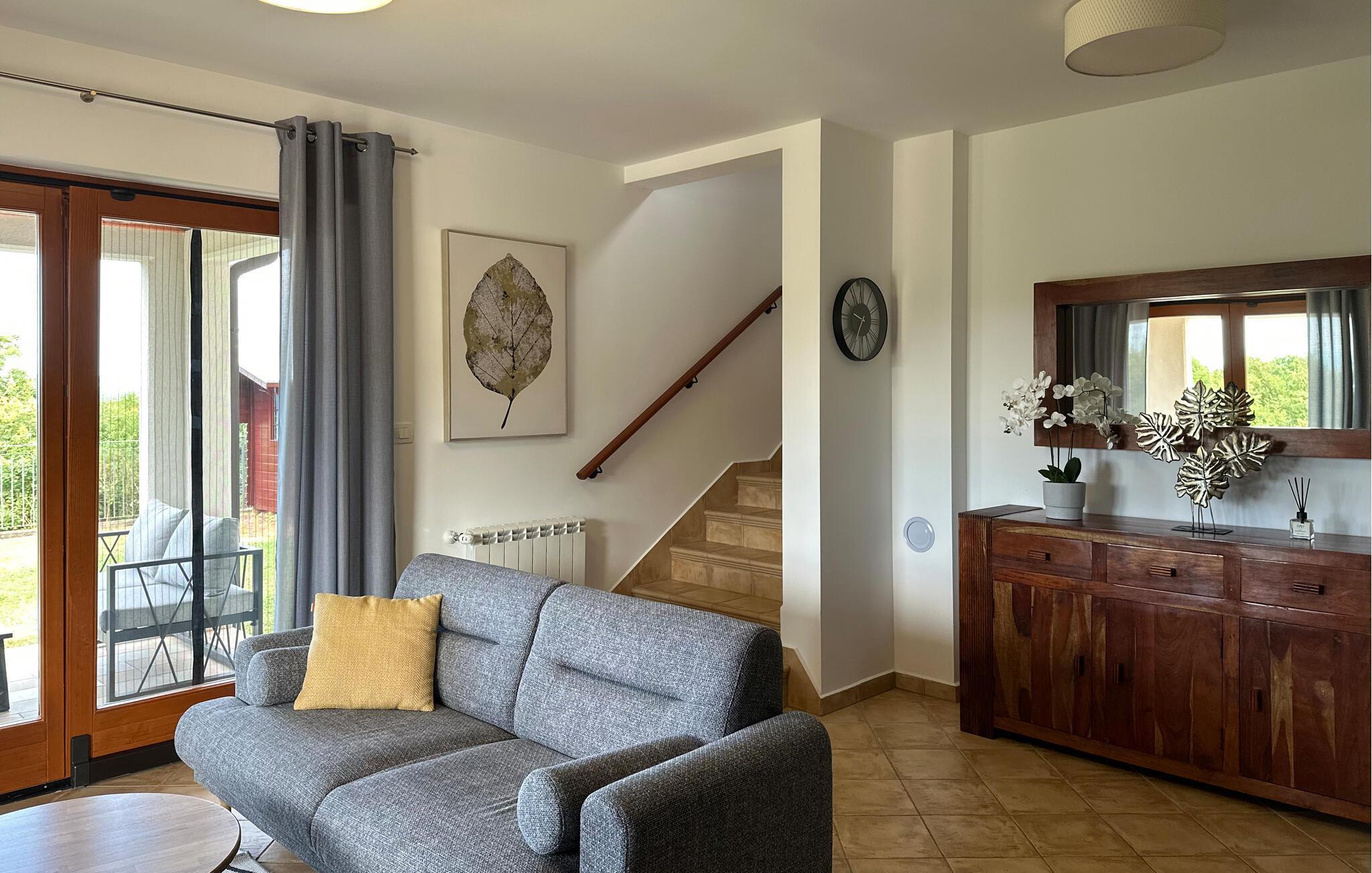 Dieses geräumige Ferienhaus verwöhnt Sie mit einem behaglich eingerichteten Wohnbereich und hochwertig möblierten Räumlichkeiten. Bereiten Sie gemeinsam köstliche Mahlzeiten in der modernen, bestens ausgestatteten Küche zu und genießen Sie diese am großen Esstisch mit Blick ins Grüne. Verbringen Sie gesellige Abende auf der gemütlichen Sofalandschaft und streamen Sie Ihre Lieblingsfilme oder spielen Sie lustige Gesellschaftsspiele im hellen Wohnbereich.