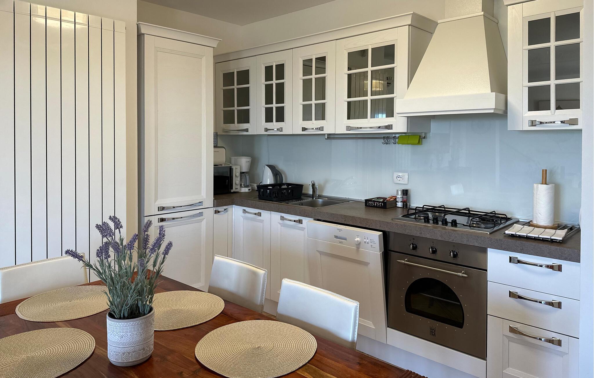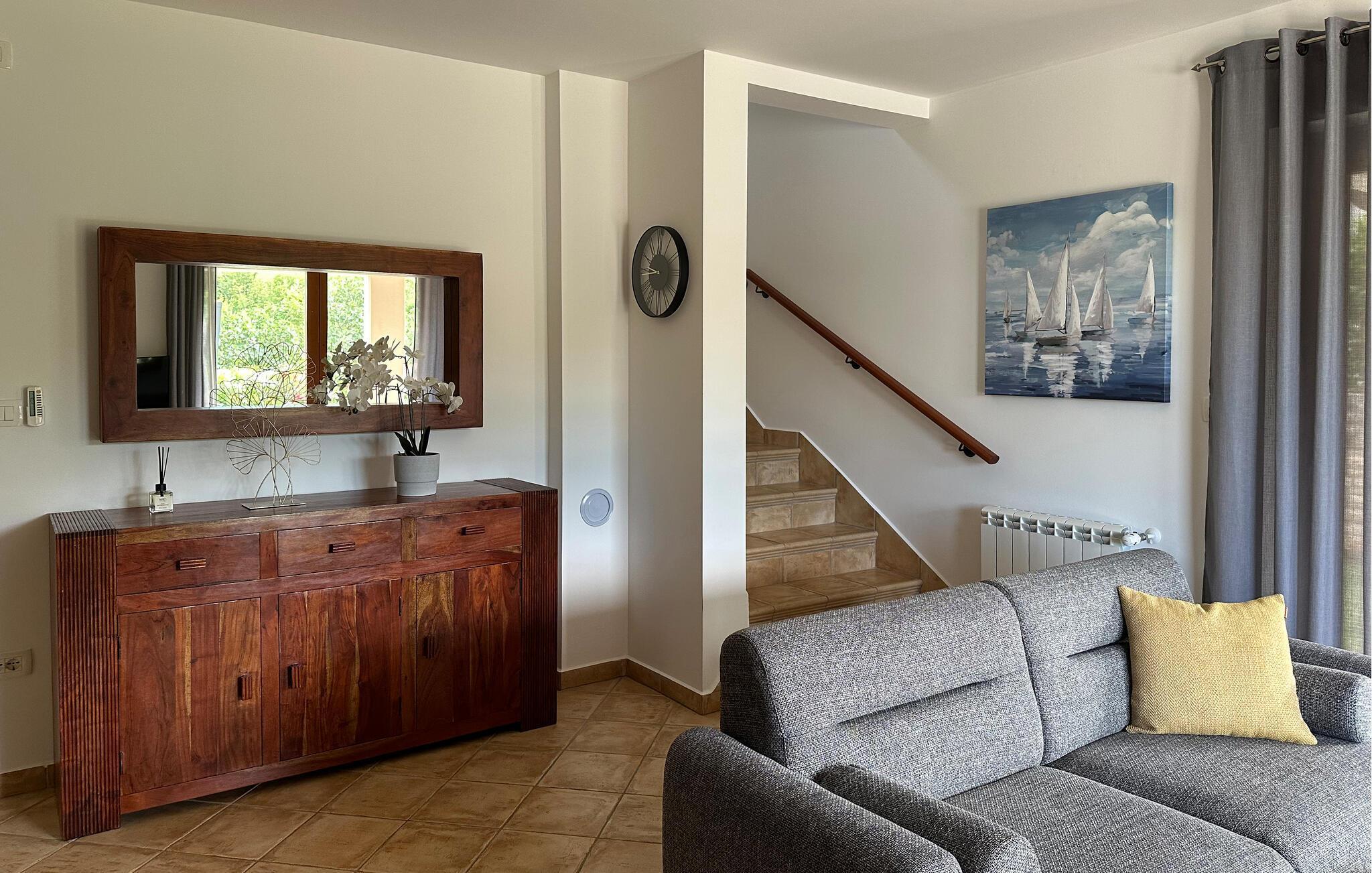Dieses geräumige Ferienhaus verwöhnt Sie mit einem behaglich eingerichteten Wohnbereich und hochwertig möblierten Räumlichkeiten. Bereiten Sie gemeinsam köstliche Mahlzeiten in der modernen, bestens ausgestatteten Küche zu und genießen Sie diese am großen Esstisch mit Blick ins Grüne. Verbringen Sie gesellige Abende auf der gemütlichen Sofalandschaft und streamen Sie Ihre Lieblingsfilme oder spielen Sie lustige Gesellschaftsspiele im hellen Wohnbereich.