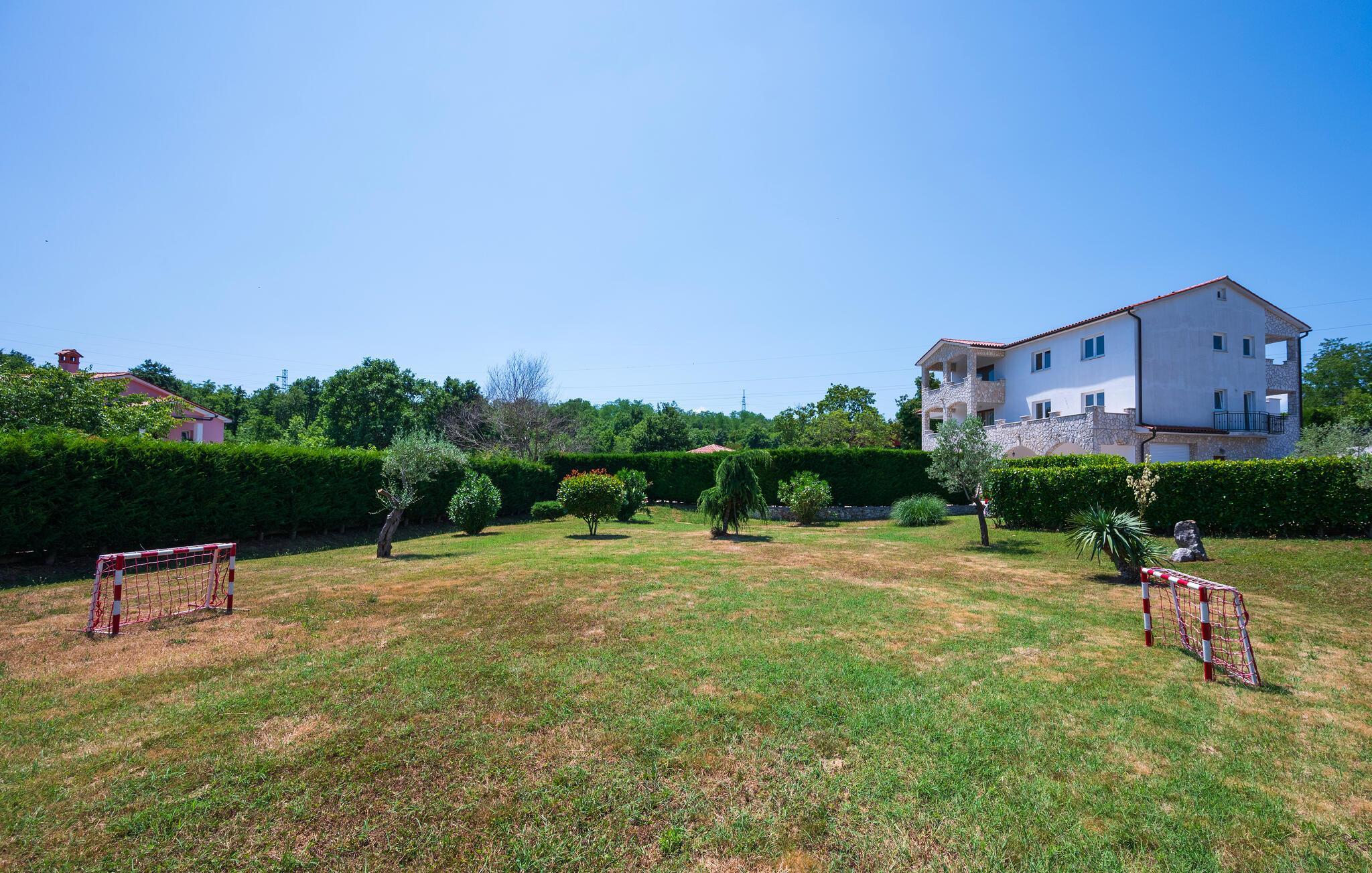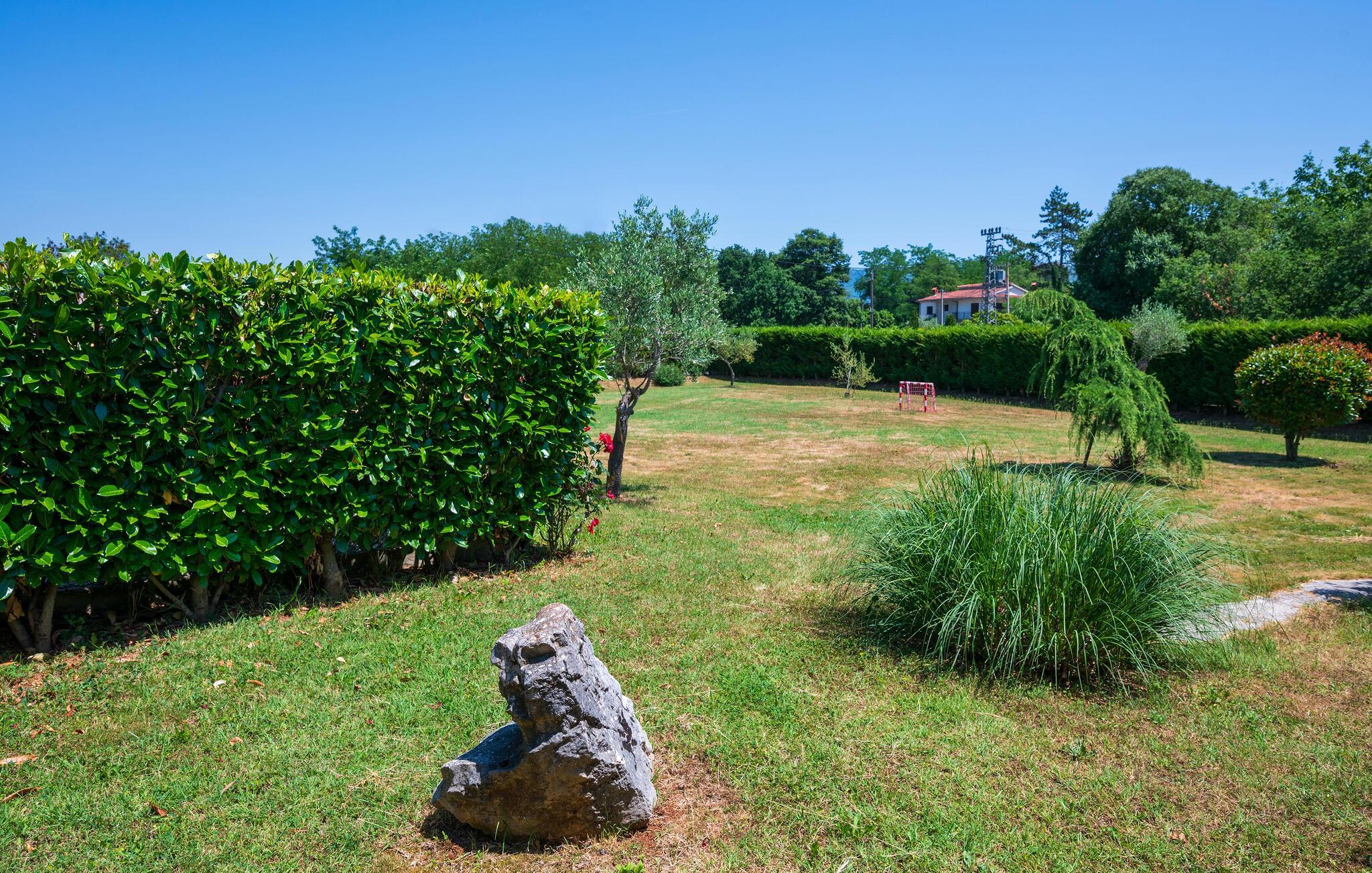 Verbringen Sie einen erholsamen Urlaub in einem ruhigen istrischen Dorf, fernab vom Alltagstrubel. Dieses geräumige Ferienhaus bietet die idealen Voraussetzungen für entspannte Tage mit der Familie oder mit Freunden. Das Ferienhaus besteht aus zwei stilvoll eingerichteten Wohneinheiten im Erdgeschoss mit separaten Eingängen. Entspannen Sie im freundlich gestalteten Wohnzimmer mit direktem Zugang zum Garten oder bereiten Sie gemeinsam Mahlzeiten in der praktischen Küche zu. Genießen Sie gesellige Abende am Esstisch oder vor dem rustikalen Kamin und vergnügen Sie sich auch beim Tischfußball, Dart oder Tischtennis.