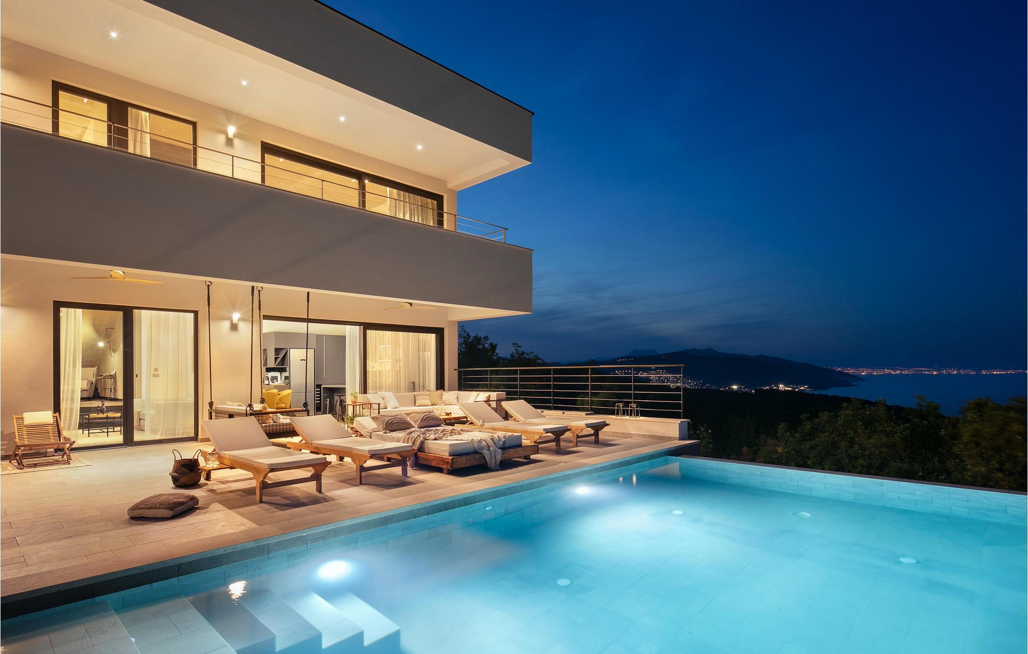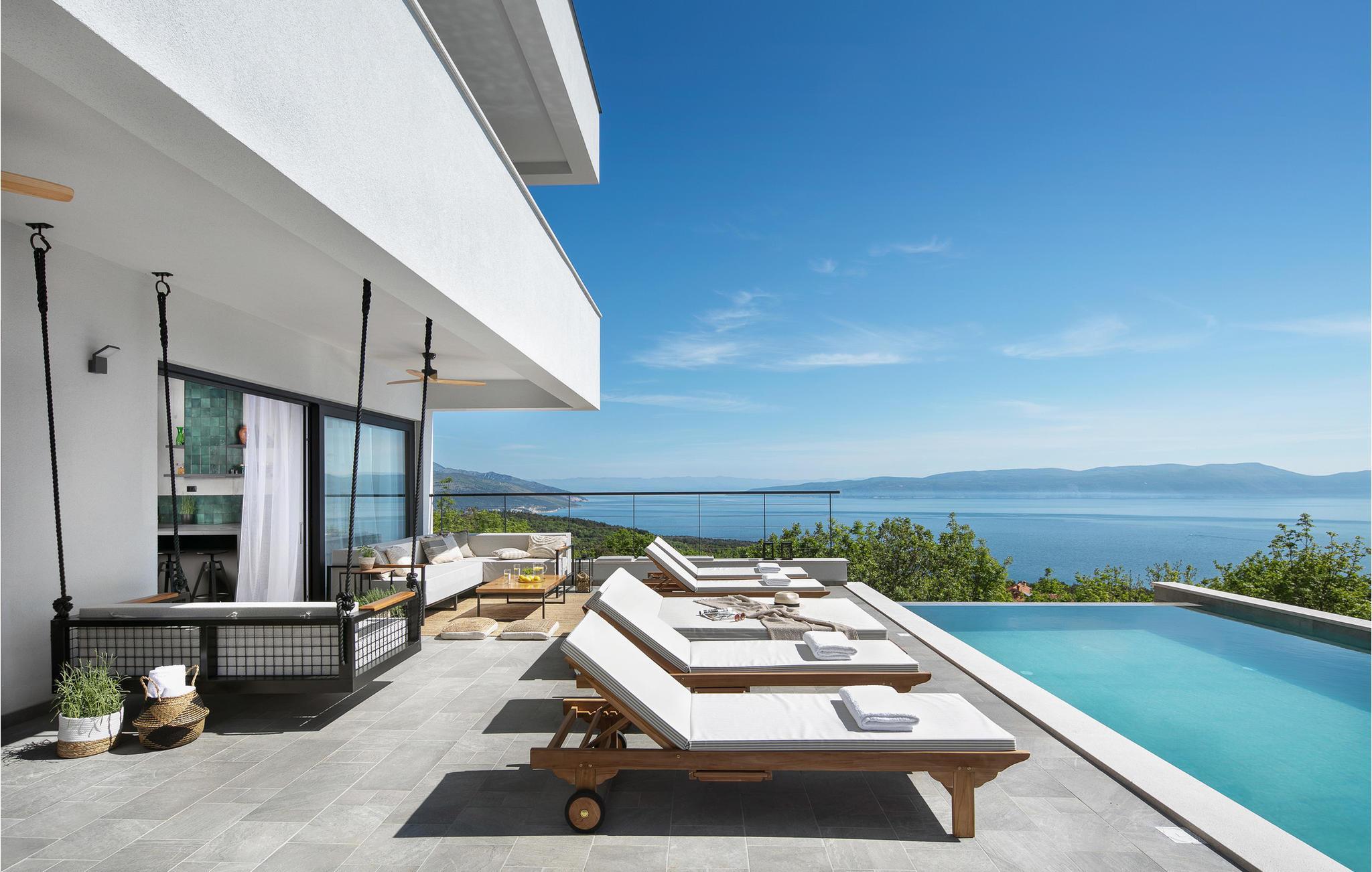 Die Villa The View befindet sich in Istrien in der Stadt Crni und stellt echten Luxus für jeden Gast dar, der einen perfekten Urlaub in Ruhe und Frieden sucht. Wenn Sie unbedingt dem hektischen Lebensstil entfliehen möchten und sich und Ihrer Familie das Beste vom Besten gönnen möchten, dann ist Villa The View genau das Richtige für Sie! Sobald Sie die Villa betreten, werden Sie von der wunderschön eingerichteten Inneneinrichtung überzeugt sein, in der Moderne und Zeitgenössische kombiniert werden, und der Meerblick von jedem Zimmer aus wird Ihnen den Atem rauben! Es wurde im Jahr 2023 erbaut und bietet 396 m2 Wohnfläche, während die Gesamtfläche der Immobilie 827 m2 beträgt. Der nächste Kiesstrand Sv. Der Yachthafen ist 2 km entfernt. Diese vollklimatisierte Villa bietet Platz für maximal 8 Personen, die in 4 Schlafzimmern untergebracht werden, von denen sich eines im Erdgeschoss und die restlichen drei im Obergeschoss befinden. Zwei Schlafzimmer verfügen über ein Doppelbett (200x210 und 180x200) und die restlichen beiden Zimmer verfügen über jeweils zwei Einzelbetten, die zu einem Doppelbett (180x200) zusammengestellt werden können. Außerdem verfügen alle 4 Zimmer über ein eigenes Badezimmer: 3 mit Dusche und 1 mit Badewanne. Jedes Zimmer verfügt über eine eigene Terrasse mit Sitzgelegenheiten, auf der Sie Ihren Morgenkaffee trinken oder die Zeitung lesen können. Im Erdgeschoss haben Sie dank der modernen und voll ausgestatteten Küche mit Bar und zwei Barhockern die Möglichkeit, Mahlzeiten für Familie und Freunde zuzubereiten. Direkt neben der Küche befindet sich ein Esszimmer mit Esstisch, daneben gibt es einen direkten Ausgang zur Außenterrasse. Das Wohnzimmer ist ein idealer Ort für abendliche Zusammenkünfte und das Ansehen von Lieblingsfilmen oder -serien. Es enthält ein Sofa, einen Sessel, einen Couchtisch, Hocker, einen romantischen Kamin und einen Fernseher. Die Außenterrasse bietet das Beste: einen Blick auf die Adria, während Sie in einem beleuchteten Pool von 36 m2 und einer Tiefe von 1,45 Metern baden. Der Pool ist in der Vor- und Nachsaison beheizt. Auf der Liegewiese neben dem Pool stehen Ihnen 8 Liegestühle zur Verfügung, wo Sie die Sonnenstrahlen genießen und Körper und Geist ausruhen können. Natürlich gibt es auch Sitzgelegenheiten im Freien und einen kleinen Tisch auf der Terrasse. Außerdem gibt es eine Sommerküche, einen Gasgrill im Freien und einen Esstisch im Freien mit 8 Sitzplätzen. Von hier aus können Sie Sommerabende genießen und einen freien Blick auf das Meer, die Städte Rijeka und Rabac sowie die Insel Cres genießen. Liebhaber eines köstlichen Tropfens Wein werden vom Weinkeller begeistert sein, wo sie in guter Gesellschaft Billard spielen können. Ebenso werden sich Kinder über das Spielzimmer freuen, in dem es eine PlayStation 4 gibt, und sie haben auch Zugang zu Netflix- und Disney Plus-Kanälen. In der Villa können Sie Darts und Billard spielen. Zu den zusätzlichen Inhalten, die während des Aufenthalts zur Verfügung stehen, gehören eine Waschmaschine, ein Trockner und ein Bügeleisen. Außerdem gibt es 1 separate Toilette, einen Futterspender und ein Kinderbett, was eine große Hilfe sein wird, wenn die Kleinsten mit in den Urlaub kommen. Der Innenhof der Villa The View bietet 4 private Parkplätze und ein Ladegerät für ein Elektroauto. Nur 8 km von der Villa entfernt, auf einem Hügel, liegt Labin, eine mittelalterliche Stadt voller Schönheit und unberührter Natur, wo Sie von der Festung der Stadt aus einen herrlichen Blick auf Rabac, Cres und die Umgebung von Labin genießen können. Gehen Sie in kleinen, eleganten Geschäften einkaufen und erfrischen Sie sich auf der Terrasse eines der Cafés oder Restaurants. Willkommen in Istrien, einem echten kleinen Paradies auf Erden, das Sie nie mehr verlassen und schon im nächsten Jahr wiederkommen möchten!