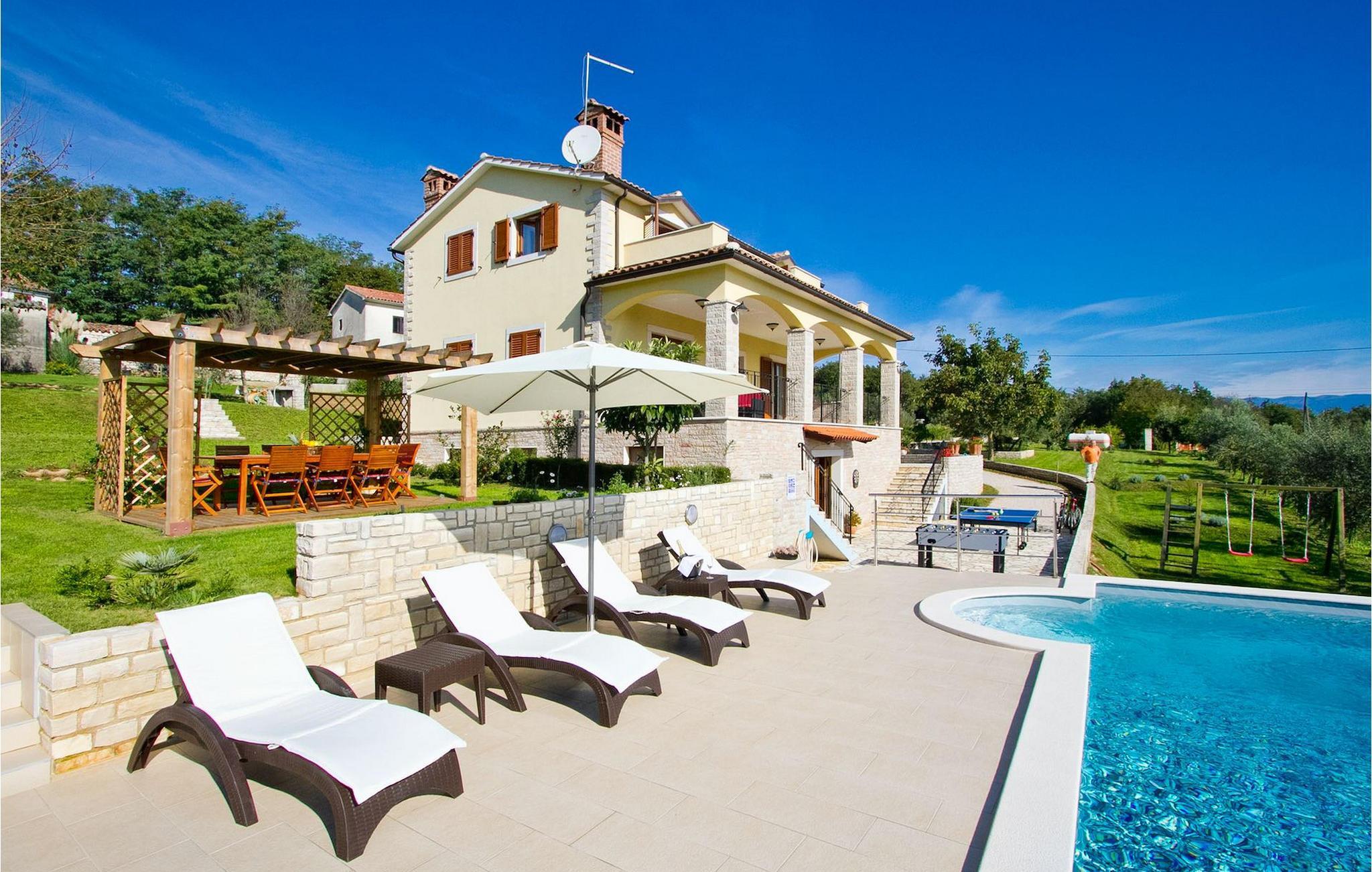 Diese schöne moderne Villa, die sich in einem kleinen und ruhigen Dorf befindet, kann bis zu 10 Personen beherbergen. Diese Villa mit einem atemberaubenden Blick auf die umliegenden Hügel, Weinberge und Olivenhaine, befindet sich inmitten eines großen privaten Gartens. Im Garten finden Sie einen Tisch und Stühle für Mahlzeiten im Freien, einen Steingrill, Liegestühle, Sonnenschirme und Schaukeln für Kinder. Das gesamte Anwesen mit einem 32 m2 großem Privatpool ist ausschließlich zu Ihrer alleinigen Nutzung. Die Villa verfügt über 4 Schlafzimmer und 3 Badezimmer verteilt auf 3 Ebenen. Im Innenbereich wurde alles liebevoll dekoriert. Im Erdgeschoss gibt es einen großen Speisesaal mit Kamin und Küche, ein Schlafzimmer mit Doppelbett und einer Toilette. Auf der ersten Etage gibt es einen offenen Essbereich mit einer zusätzlichen, gut ausgestatteten Küche und ein Wohnzimmer mit Zugang zu der großen überdachten Terrasse mit atemberaubender Aussicht. Es gibt auch ein Schlafzimmer mit einem Doppelbett und einem Badezimmer. Auf der dritten Etage gibt es zwei Schlafzimmer, eines mit Einzelbett. Jedes hat ein eigenes Bad und Zugang zur Terrasse mit herrlichem Ausblick.