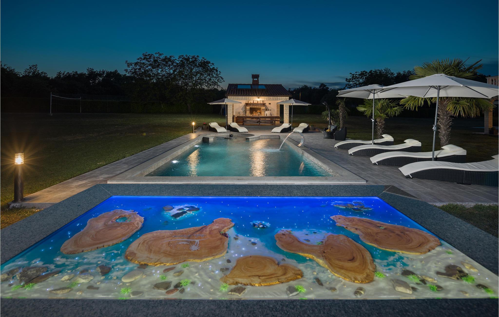 Mediterrane Atmosphäre, umfangreiche Wellnesseinrichtungen und ein beheizter Pool empfangen Sie hier. In diesem Ferienhaus haben Sie zwei komfortable Ferienwohnungen, die über Außentreppen verbunden sind. Für besonders angenehme Stunden im Freien steht ein beheizter Pool zu Verfügung. Herrlich zum Faulenzen und Entspannen im Inneren wie im Freien, denn es herrscht viel Platz. Das umgebende Grundstück ist sehr weitläufig.Genießen Sie Wellness hier mit Sternenhimmel über dem Whirlpool, Lichteffekten, Dampfbad, finnischer Sauna und Infrarotsauna sowie mit einer herrlichen Kaltwasserdusche. Sie machen in einem Ambiente Urlaub, das aus einer Mischung aus modernen und rustikalen Elementen besteht und eine ideale Urlaubsbasis für zwei gemeinsam urlaubende Familien ist. In der Nähe vom Haus liegt der bekannte Ferienort Rabac mit vielen Cafés und Souvenirläden und einer schönen Promenade. Neben dem Pool befindet sich eine Sommerküche mit Grill. Zum Aktivsein können Sie Billard, Tischtennis und Darts spielen. Es gibt auch einen Kinderspielraum. In der Nachbarschaft finden Sie Spazierwege und ein kleines Wäldchen, der Wald gehört dem Eigentümer. Eine Besonderheit sind der Golfplatz (Driving Range) mit einer Fläche von 10.000 m², drei überdachten Aufschlagplätzen zu den gesetzten Zielen weisend und die dazugehörende Golfausrüstung (Sack, Bälle, Schläger und Ständer). Die Umgebung können Sie mit vier Ihnen zur Verfügung stehenden Fahrrädern erforschen. Der Vermieter gibt Ihnen gerne Tipps, wo einheimische Produkte wie Wein, Likör und Honig zu besorgen sind.