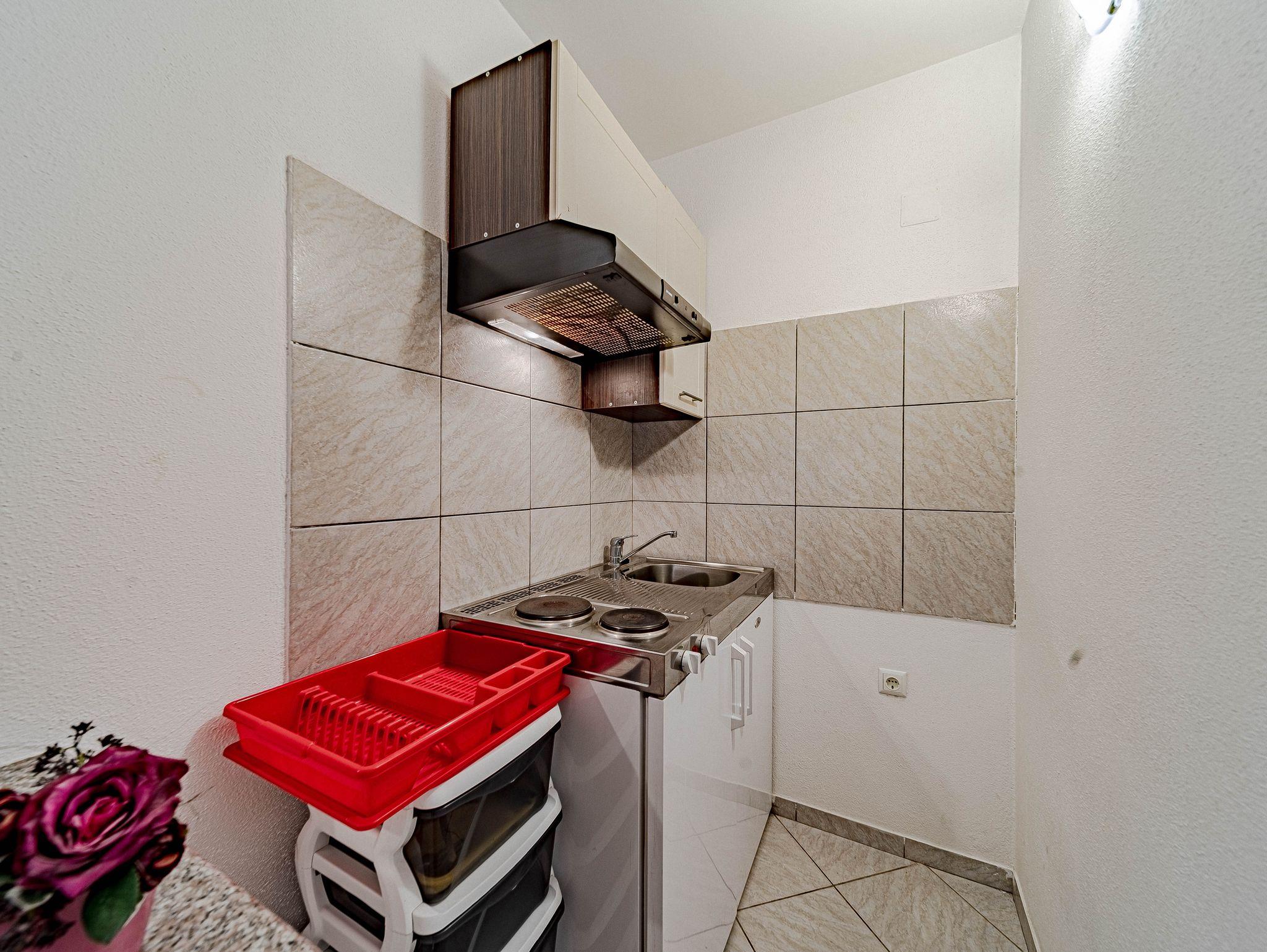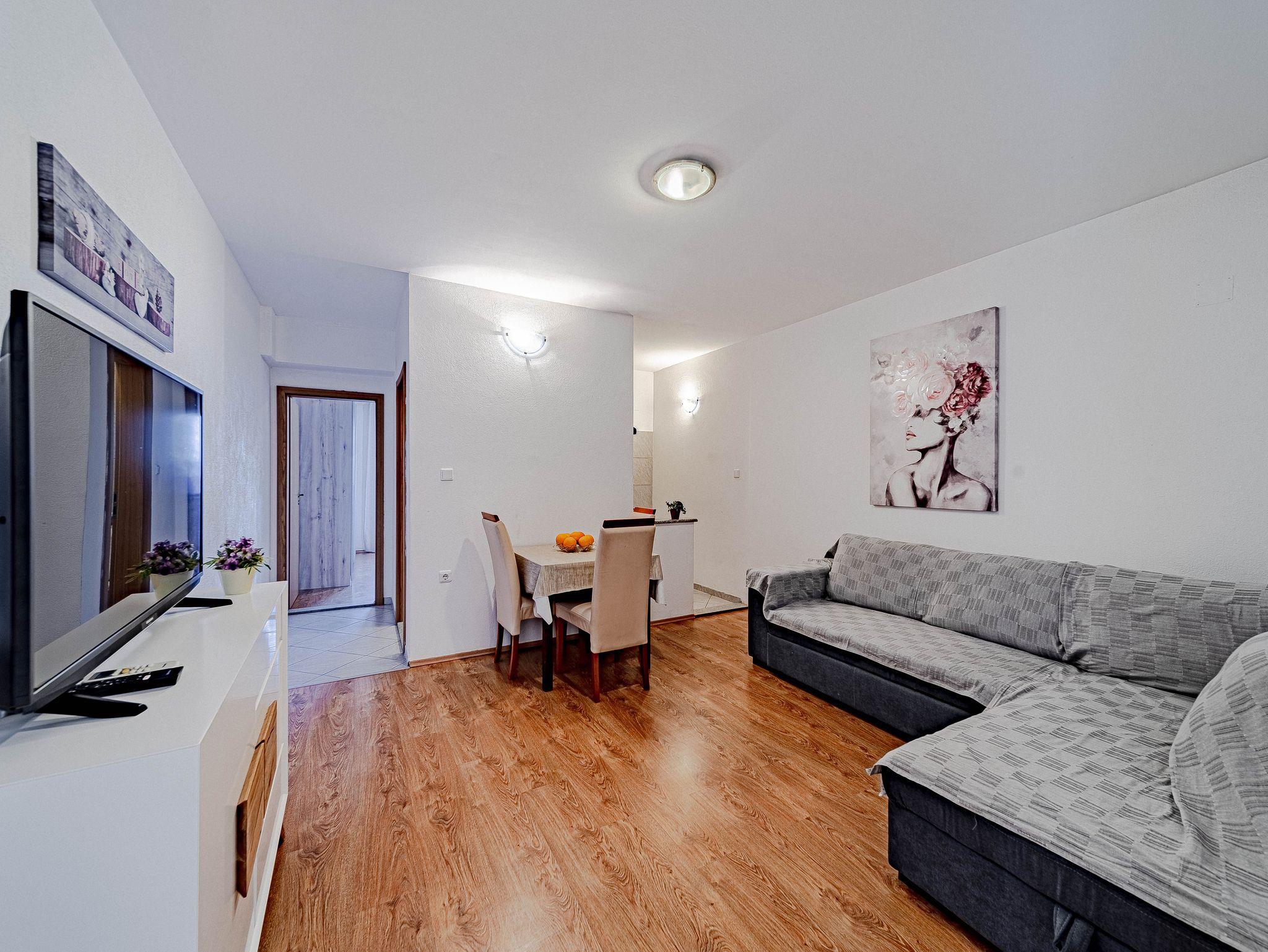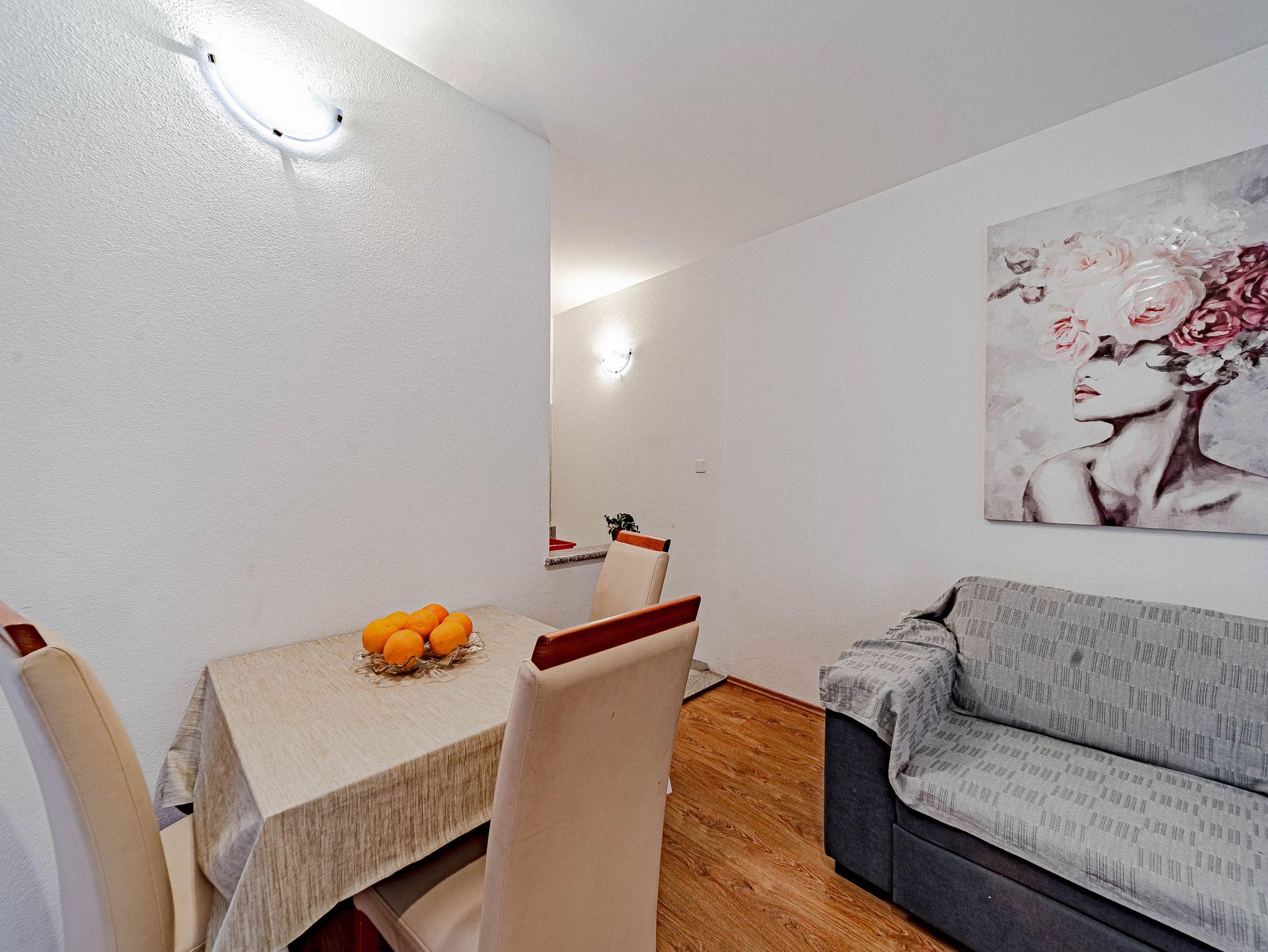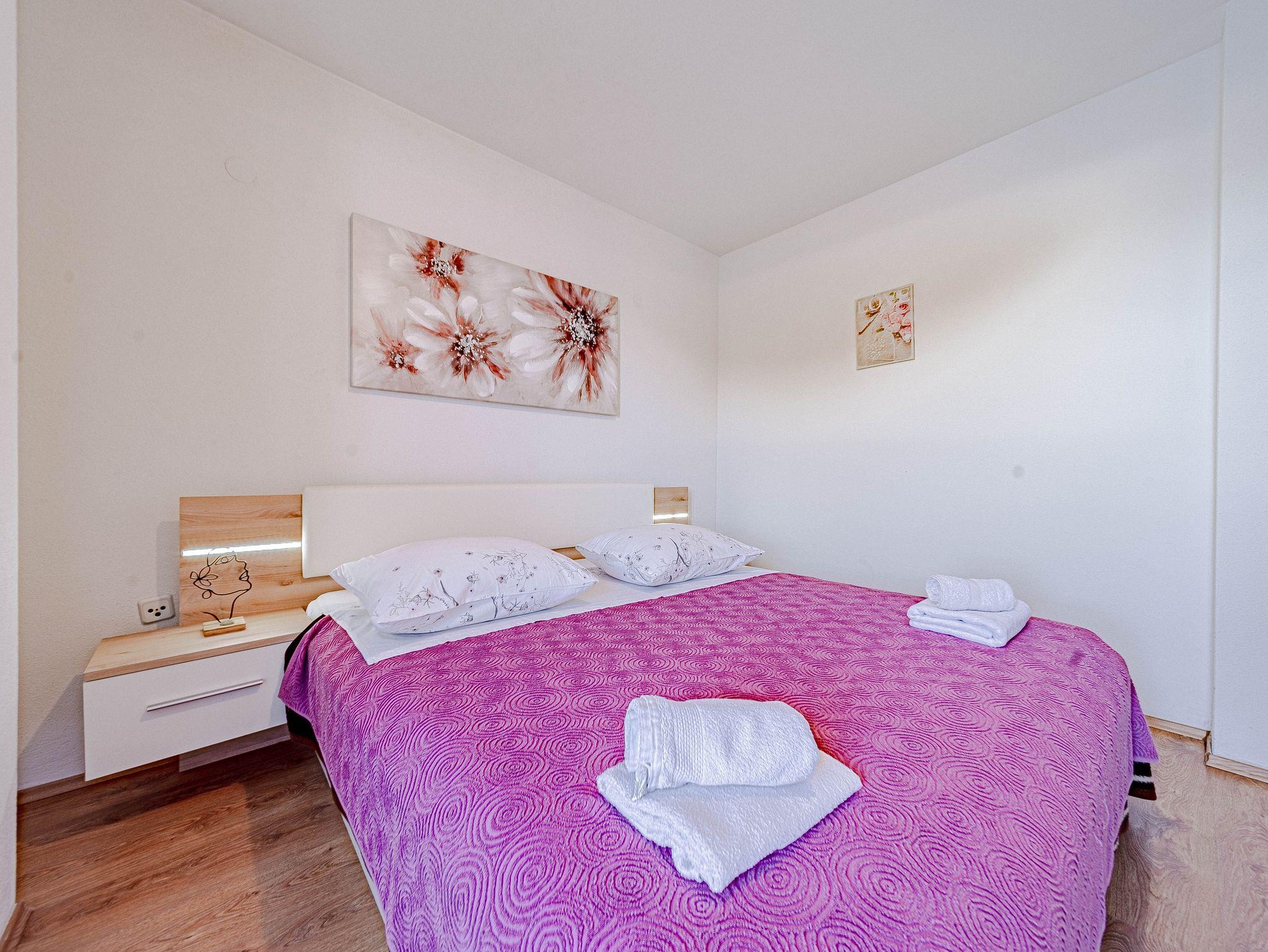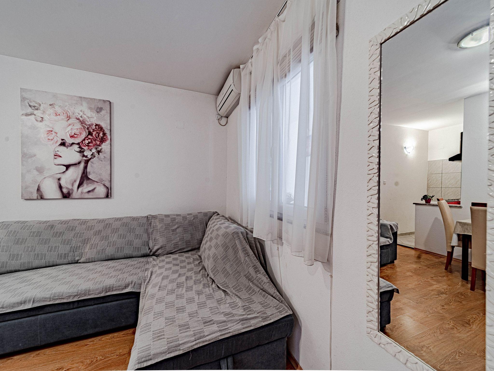 Ferienwohnung bietet Platz für 4 Gäste. Die Betten sind in Schlafzimmern, die es 1 gibt, und in Wohnzimmer, innerhalb einer Gesamtfläche von 35m2, angeordnet. Die Gäste haben eine eigene Terrasse zur Verfügung, auf der sie in warmen Sommernächten genießen können. Das Apartment bietet Meerblick. Es ist erlaubt, Speisen auf dem Gemeinschafts-Grill vorzubereiten. IM PREIS INBEGRIFFEN: Kurtaxe, Endreinigung, Klimatisierung, Parkplatz, Internet, Kinderbett, Bügeleisen, Bügelbrett, Föhn, Sonnenschirm, Liegestühle. VERBINDLICHE ZUSÄTZLICHE KOSTEN: Aufzahlung für Kurzaufenthalte (prozentualer Zuschlag pro Nächtigungsanzahl: 30% - 1, 20% - 2, 10% - 3). UNVERBINDLICHE ZUSÄTZLICHE KOSTEN: Wäschewaschen (8,00 € Waschen), Zusatzbett (10,00 € pro Nacht). Die Verfügbarkeit zusätzlicher Dienstleistungen in Ihrem reservierten Termin und die Preise derselben (falls nicht aufgeführt) müssen im Voraus überprüft werden. Zusätzliche Dienstleistungen die in der Zahlungsaufforderung nicht aufgeführt sind werden direkt beim Vermieter bezahlt, angenommen der Gast nutzt auch diese.
