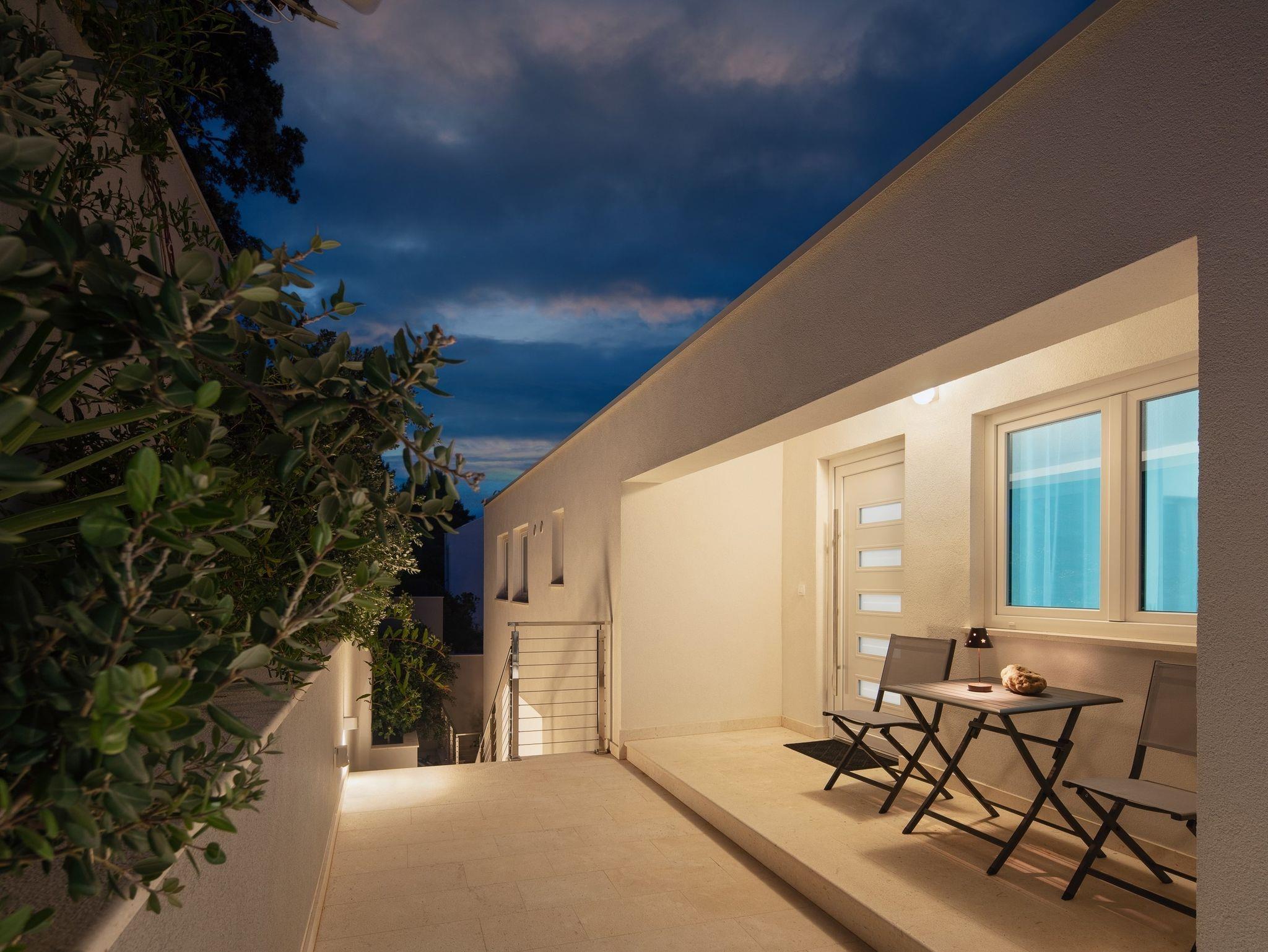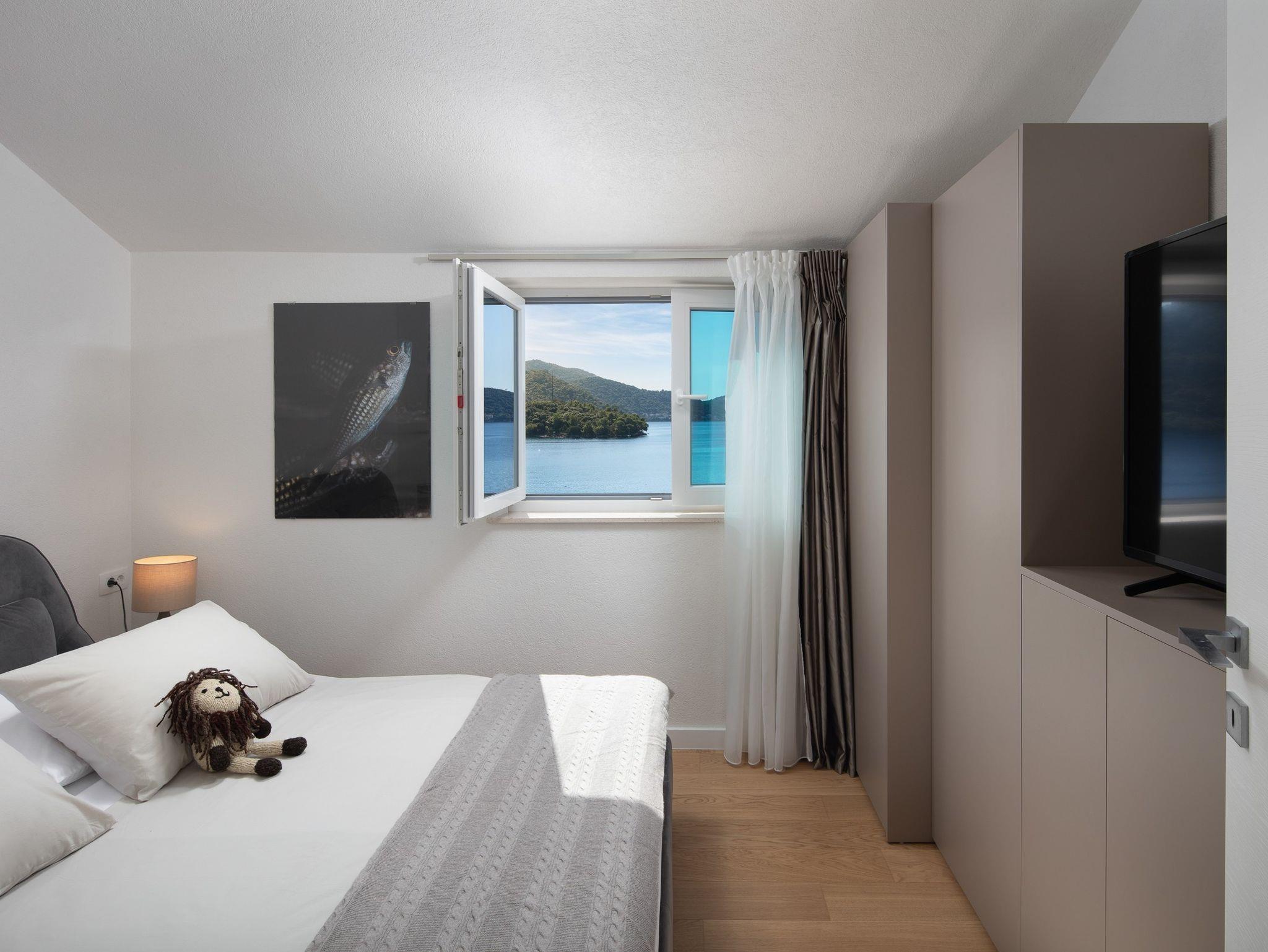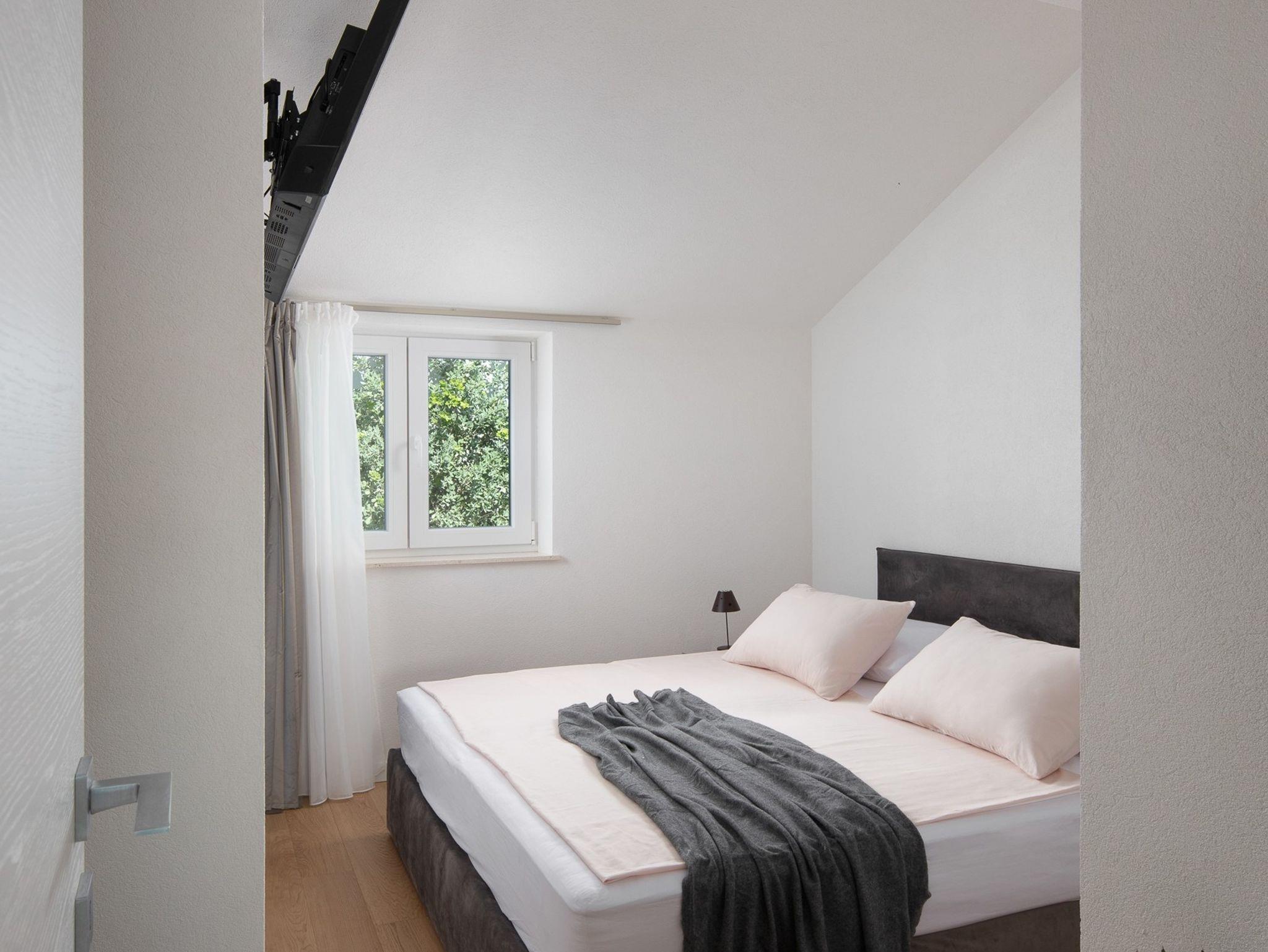 Ferienwohnung bietet Platz für 5 Gäste. Die Betten sind in Schlafzimmern, die es 2 gibt, und in Wohnzimmer, innerhalb einer Gesamtfläche von 69m2, angeordnet. Die Gäste haben eine eigene Terrasse zur Verfügung, auf der sie in warmen Sommernächten genießen können. Das Apartment bietet Meerblick. Es ist erlaubt, Speisen auf dem Gemeinschafts-Grill vorzubereiten. In der Unterkunftseinheit besteht die Möglichkeit des Mitbringens von Haustieren, und die Dienstleistung ist im Preis der Unterkunft enthalten. IM PREIS INBEGRIFFEN: Kurtaxe, Endreinigung, Klimatisierung, Zentralheizung, Parkplatz, Internet, Bootsanlegeplatz, Haustiere, Fahrrad, Kinderbett, Bügeleisen, Bügelbrett, Föhn, Sonnenschirm, Liegestühle. VERBINDLICHE ZUSÄTZLICHE KOSTEN: Aufzahlung für Kurzaufenthalte (prozentualer Zuschlag pro Nächtigungsanzahl: 30% - 1, 20% - 2, 10% - 3). Die Verfügbarkeit zusätzlicher Dienstleistungen in Ihrem reservierten Termin und die Preise derselben (falls nicht aufgeführt) müssen im Voraus überprüft werden. Zusätzliche Dienstleistungen die in der Zahlungsaufforderung nicht aufgeführt sind werden direkt beim Vermieter bezahlt, angenommen der Gast nutzt auch diese.
