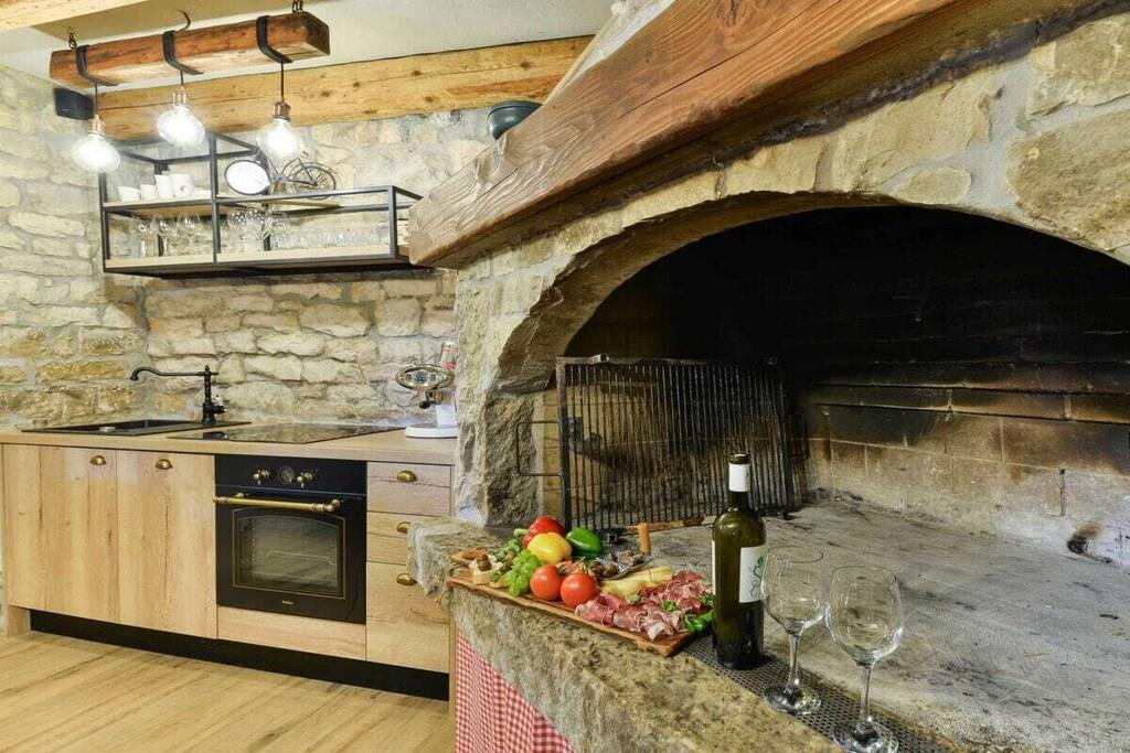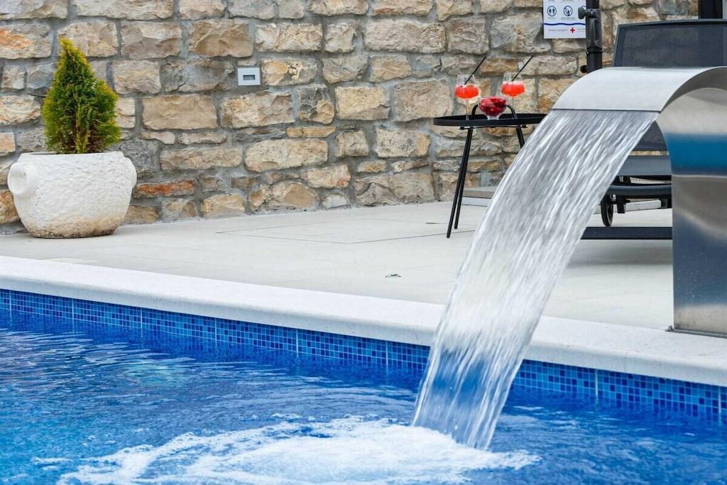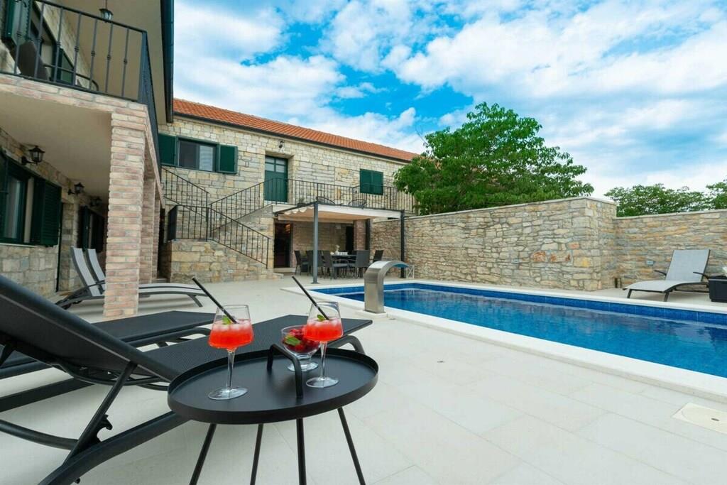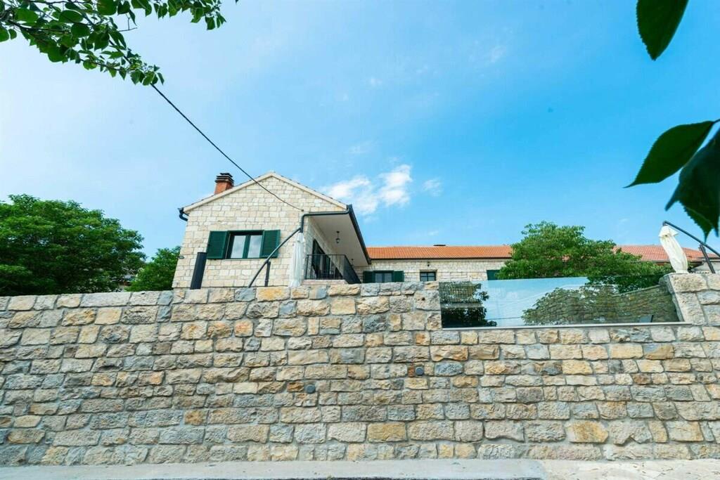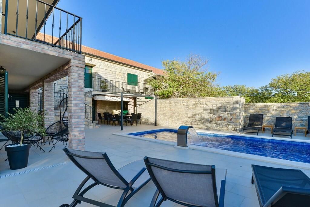 Villa Didovi Snovi – das Ferienhaus mit atemberaubender Innenarchitektur, einem wunderschönen Innenhof und herrlichem Blick auf Wiesen, wo Sie während Ihres Urlaubs in Kroatien wertvolle Erinnerungen schaffen werden. Villa Didovi Snovi liegt im idyllischen Dorf Lišane, nur eine kurze Fahrt von der schönen Stadt Skradin entfernt. Dieses fantastische Anwesen ist der perfekte Ort, um einen schönen, erholsamen Urlaub abseits der überfüllten Touristenziele zu verbringen. Das Innere der Villa erstreckt sich über eine Fläche von 140m2 und bietet Platz für bis zu 10 Gäste in fünf stilvoll eingerichteten Schlafzimmern. Die Villa verfügt über eine Gästetoilette und drei Badezimmer mit Dusche und allen wichtigen Badutensilien wie Waschmaschine, Handtücher, Fön usw. Den Gästen steht auch eine voll ausgestattete Küche mit hochwertigen Geräten zur Verfügung, die mit einen kleineren Essbereich für einen schnellen Snack. Das geräumige und gemütliche Wohnzimmer ist der ideale Ort in der Villa für Entspannung und Unterhaltung für die ganze Familie, da es mit einer bequemen Couch, Sat-TV und Klimaanlage ausgestattet ist. Hervorzuheben ist die hervorragende dalmatinische Taverne mit großer Grillstation und zweiter voll ausgestatteter Küche, die den perfekten Ort bietet, um ein schönes hausgemachtes Essen für Ihre Familie und Freunde zu genießen. Die Villa bietet auch zahlreiche Unterhaltungsaktivitäten, von Tischfußball, Billard bis hin zu Darts. Umgeben von viel Grün bietet der Außenbereich einen schönen Swimmingpool mit Liegestühlen, ideal zum Entspannen und Sonnenbaden. Es gibt auch eine kleine Kinderecke für Trampolin und private Parkplätze für die Gäste der Villa. Das gesamte Grundstück der Villa Didovi Snovi ist komplett eingezäunt, so dass die Gäste ihre absolute Privatsphäre genießen können.