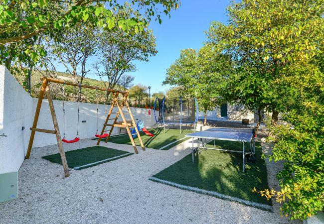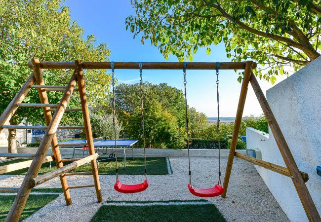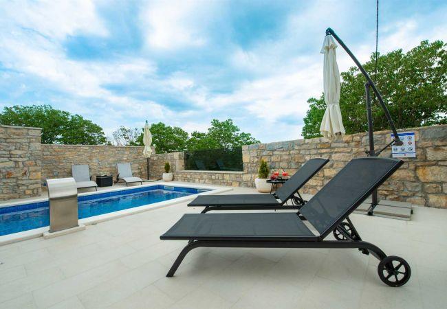 Villa Didovi Snovi – the holiday home with a stunning interior design, a gorgeous courtyard and and stunning view on meadows where you will create precious memories during your holiday in Croatia. Villa Didovi Snovi is situated in the idyllic village of Lišane, short drive from the beautiful town Skradin. This amazing property is the perfect place to enjoy a nice relaxing holiday away from the crowded tourist destinations. Interior of the Villa spreads on area of 140m2 and offers accommodation up to 10 guests in five stylishly decorated bedrooms. Villa features one guest toilet and three bathrooms with a shower and all bathroom essentials such as a washing machine, towels, a hair dryer, etc. Guests will also find a fully equipped kitchen with high quality appliances at their disposal, which is joined together with a smaller dining area for a quick snack. The spacious and cozy living room will be the ideal place in Villa for relaxation and entertainment for the whole family, as it is furnished with a comfortable couch, satellite TV and A/C. We would like to point out outstanding Dalmatian Tavern with large BBQ station and second fully equipped kitchen which makes the perfect space for enjoying a nice home-cooked meal for your family and friends. The Villa also provides numerous entertainment activities, from table soccer, billiard to darts. Surrounded by a lot of greenery, the outdoor area features a beautiful swimming pool with lounging chairs, ideal for relaxing and soaking up the sun. There is also a small children corner for trampoline, and private parking spaces for the guests of the Villa. The entire property of Villa Didovi Snovi is fully fenced, so that guests can have their total privacy.