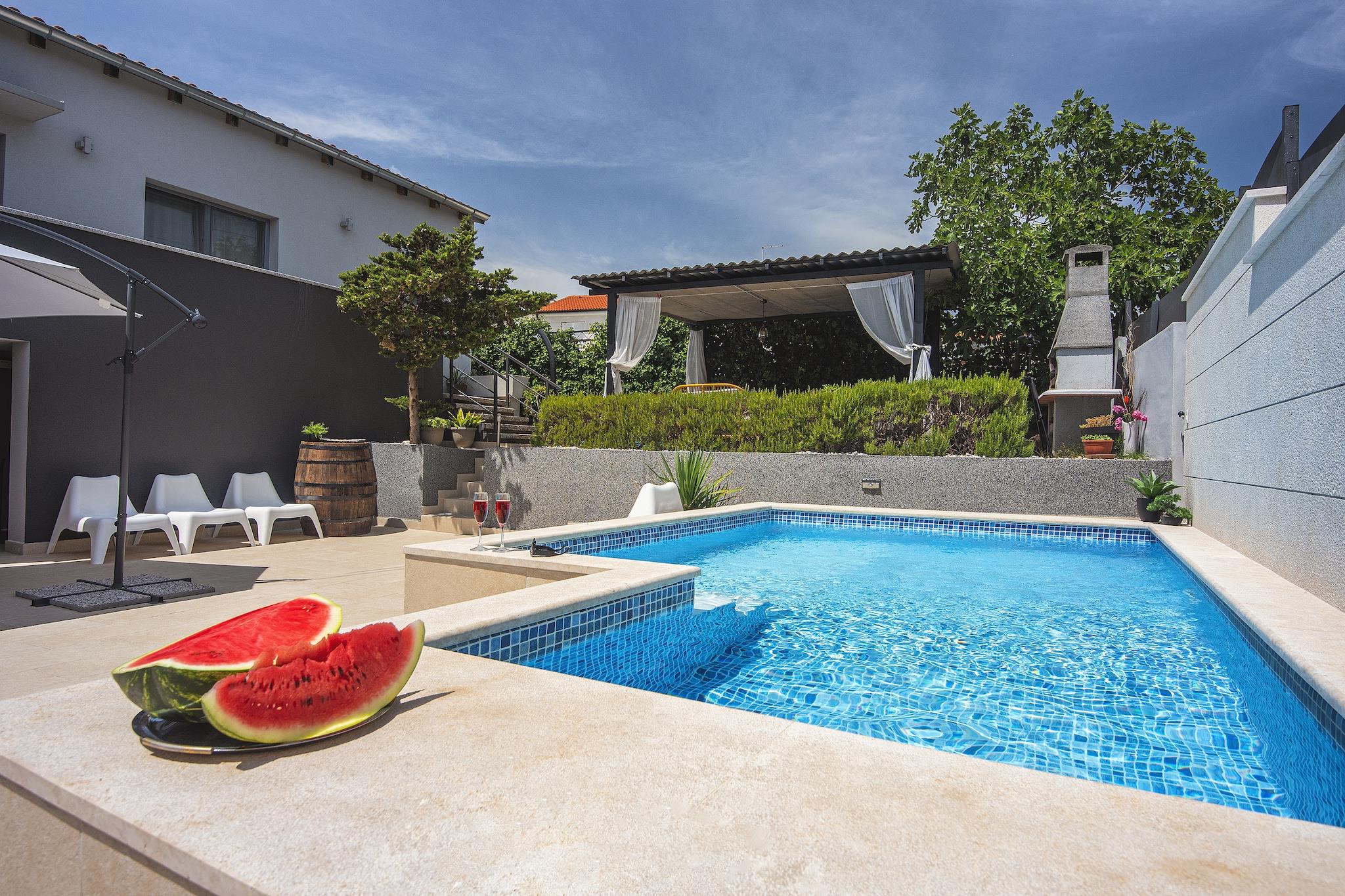 Ground floor: (Living room(double sofa bed, TV(satellite), dining table), open kitchen(hob(4 ring stoves), electric kettle, coffee machine, oven, microwave, dishwasher, fridge-freezer), bathroom(shower, washbasin, toilet)) On the 1st floor: (bedroom(double bed(160 x 200 cm), TV), bedroom(2x double bed(160 x 200 cm)), bathroom(shower, washbasin, toilet)) shower(outside), washing machine, 2x air conditioning, terrace(roofed), terrace(private, fenced), garden furniture, sun loungers, BBQ, parking, swimming pool(private, 5 x 3 m.)