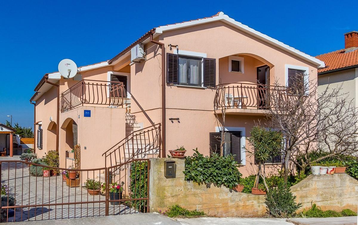 Guests of these four apartments in Ližnjan have access to a common terrace with swimming pool, next to which there are comfortable lounge chairs and an outdoor dining area with wooden table and benches, covered with the appealing solid wood beams. One of the four units is situated on the ground floor, while the others are on the second floor of this family home which is located on a private gated estate.
