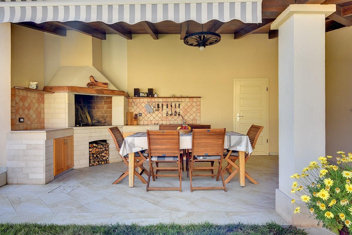 Villetta Valtura is a modern villa with pool located near the town of Pula. This beautifully decorated villa in Valtura extends over two floors - the ground floor features a cosy living room, kitchen and dining room, as well as one bathroom with shower, while upstairs there are two double bedrooms and another bathroom with shower. Covered terrace is arranged and located opposite the pool where you can prepare your favorite dishes because there is a sink, stove and large fireplace that in the evening nights can make a real summer feeling next to the fire. Viletta Valtura, in Pula, is the perfect choice for a vacation for smaller families with children or friends. The property is fenced, so you can take your pet that can enjoy a beautifully landscaped yard!