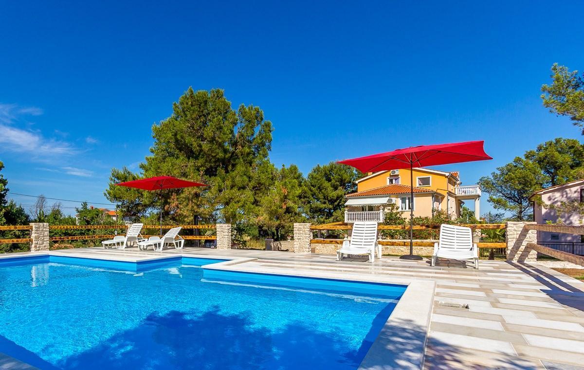 We offer five apartments in Ližnjan, situated in a family house which extends over 1700 square feet of private land. At the guests disposal there is a large swimming pool which dominates the sun terrace with free deck chairs and parasols. In addition to the pool, the guests of these beautifully decorated suites can also use a shared furnished terrace with a fireplace, which is set beside a nice refreshing fountain. In addition, the owner of this fine estate provides his guests with two private and one public parking space.