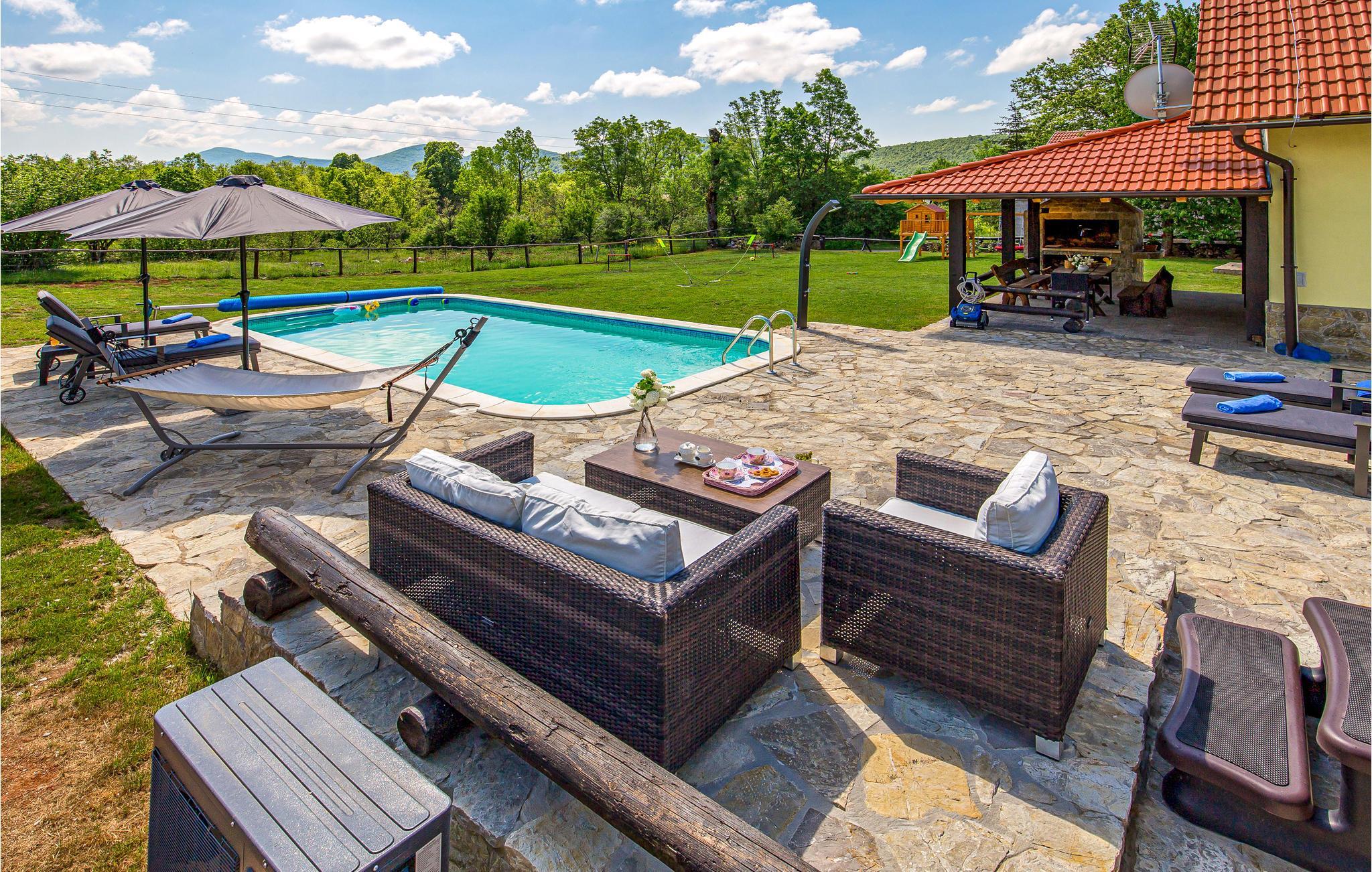 Auf dem offenen Naturgrundstück lädt der schöne Pool zu entspannenden Stunden in der Sonne ein. Oder starten Sie hier den Tag mit einer Runde Schwimmen, während die Kinder schon im Garten auf der Schaukel spielen. Anschließend können Sie ein gutes Frühstück auf der Terrasse zu sich nehmen.