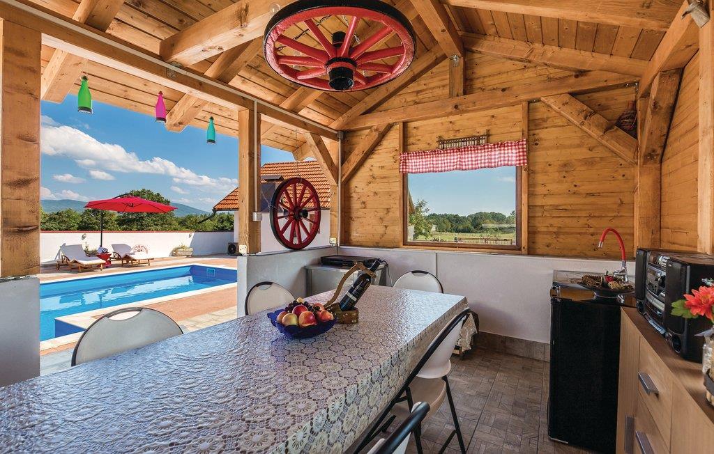 Dieses hübsche Ferienhaus befindet sich in einer grünen Umgebung in der Nähe von Gospic. Das Ferienhaus besteht aus dem Erdgeschoss und Dachgeschoss mit Innentreppe. Vor dem Hause ist ein beheizter Außenpool angelegt. Auf der überdachten Terrasse finden Sie eine schöne Sommerküche mit Sitzmöglichkeiten und einem Grill. Das Ferienhaus ist gut ausgestattet und traditionell eingerichtet. Die natürliche Landschaft der Umgebung bietet Ihnen zahlreiche Aktivitätsmöglichkeiten an: Fahrradfahren, Wandern und Angeln an dem nahelegendem Bach. Eine Autostunde entfernt liegen die Plitvice Seen. Das Ferienhaus eignet sich gut für Aktivurlauber und Naturliebhaber.
