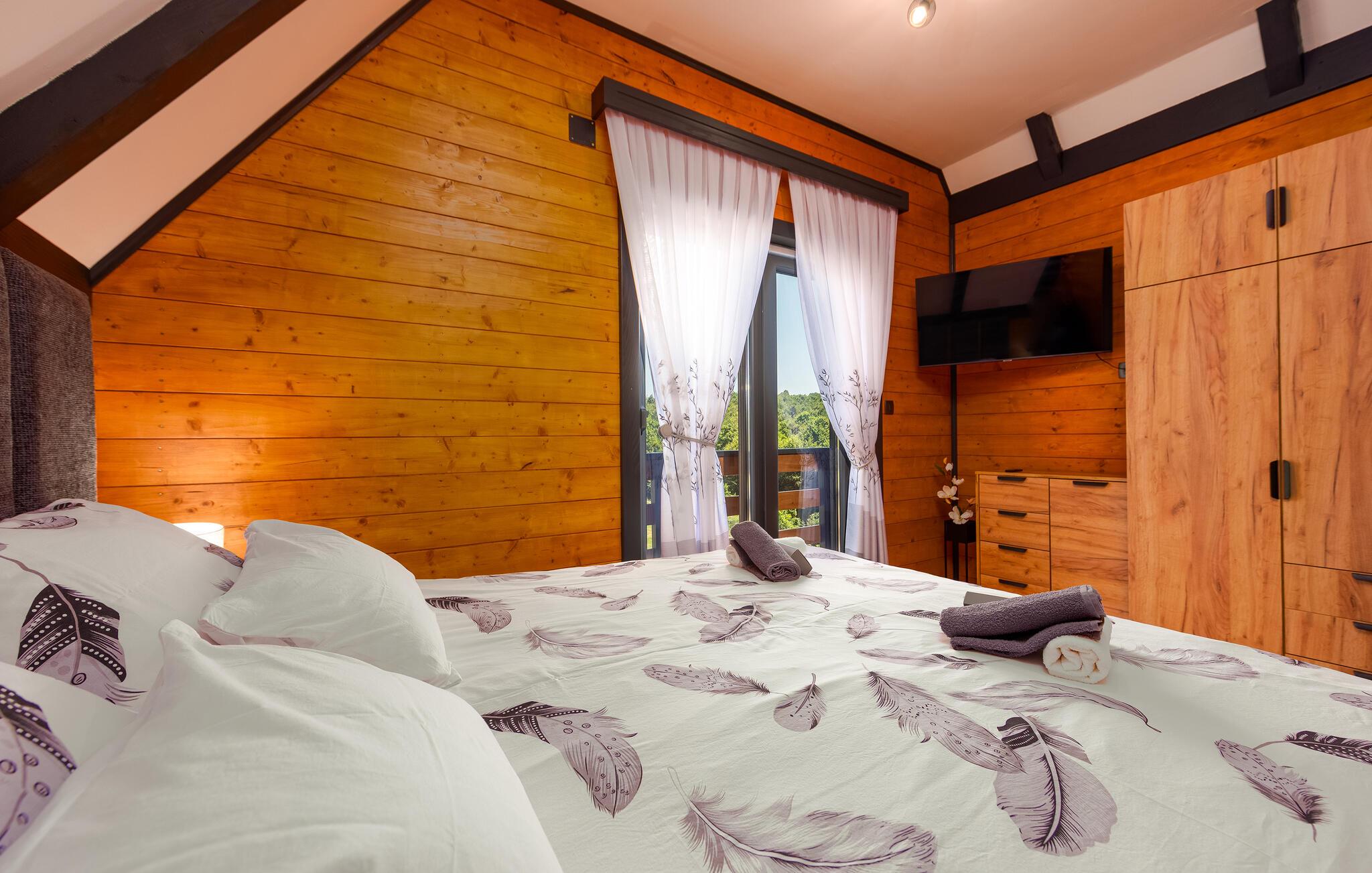 Dieses gemütliche Urlaubsdomizil liegt eingebettet in ein wunderschönes Naturgrundstück und verspricht harmonische Tage in einem modernen, geschmackvoll eingerichteten Interieur mit rustikalen Details. Lassen Sie sich beim Kochen vom Blick ins Grüne inspirieren und genießen Sie köstliche Mahlzeiten am stilvollen Esstisch. Plaudern Sie im behaglichen Wohnzimmer, streamen Sie einen Film oder widmen Sie sich Ihren Liebsten bei einem Spieleabend.