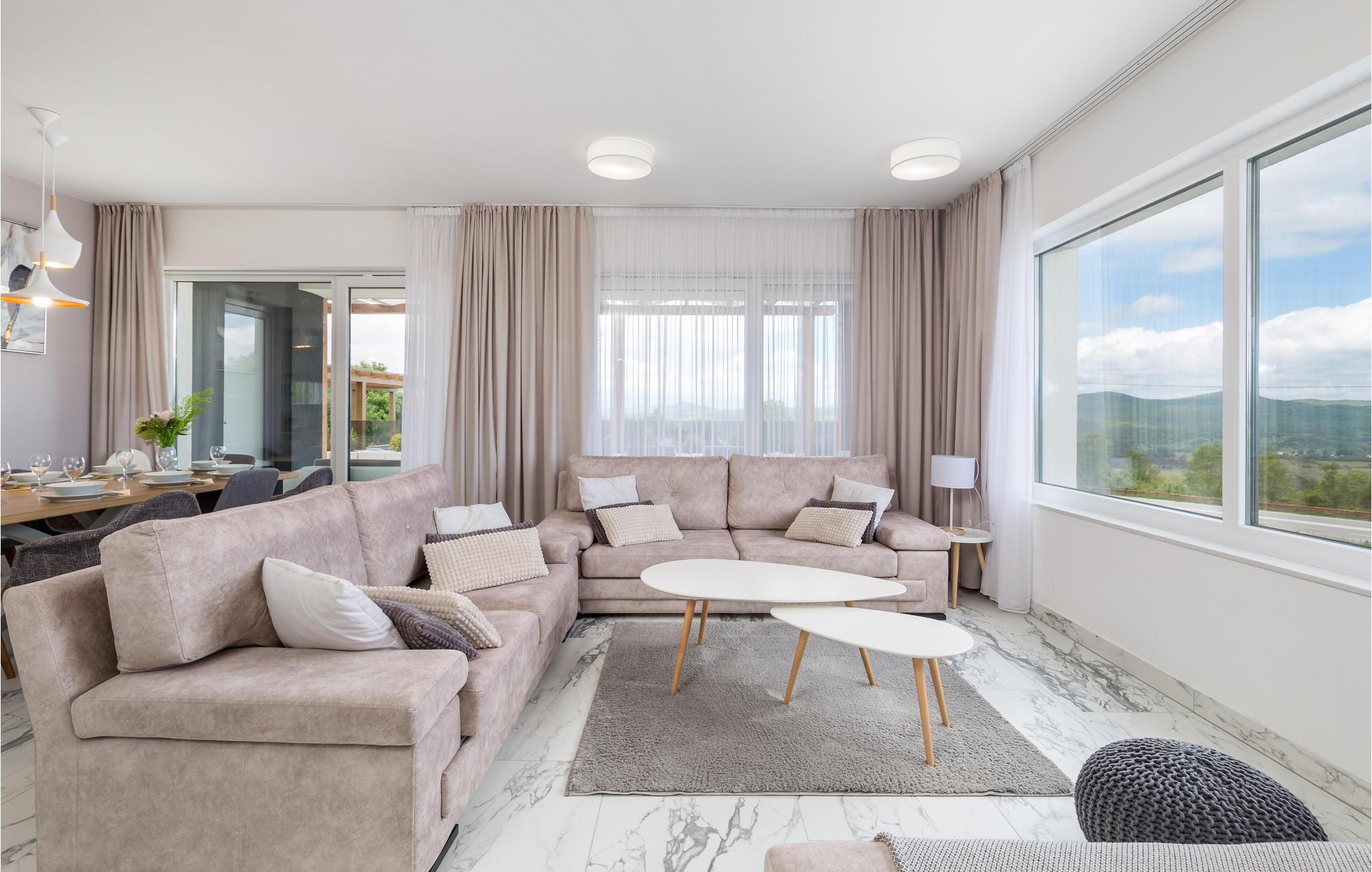 Freuen Sie sich auf einen wundervollen Urlaub in diesem schönen Ferienhaus, das keine Wünsche offenlässt. Im Inneren des Hauses erwarten Sie eine moderne Einrichtung in hellen Farben mit schöner Dekoration und viel Platz für mehrere Familien oder eine Gruppe von Freunden. Das Haus bietet Platz in 4 Schlafzimmern, 5 Badezimmern und einem Wohnraum mit Küche. In der gut ausgestatteten Küche können Sie gut zusammen kochen, während die anderen Urlaubsgäste auf dem Sofa vor dem Fernseher entspannen oder die Sauna des Hauses nutzen.