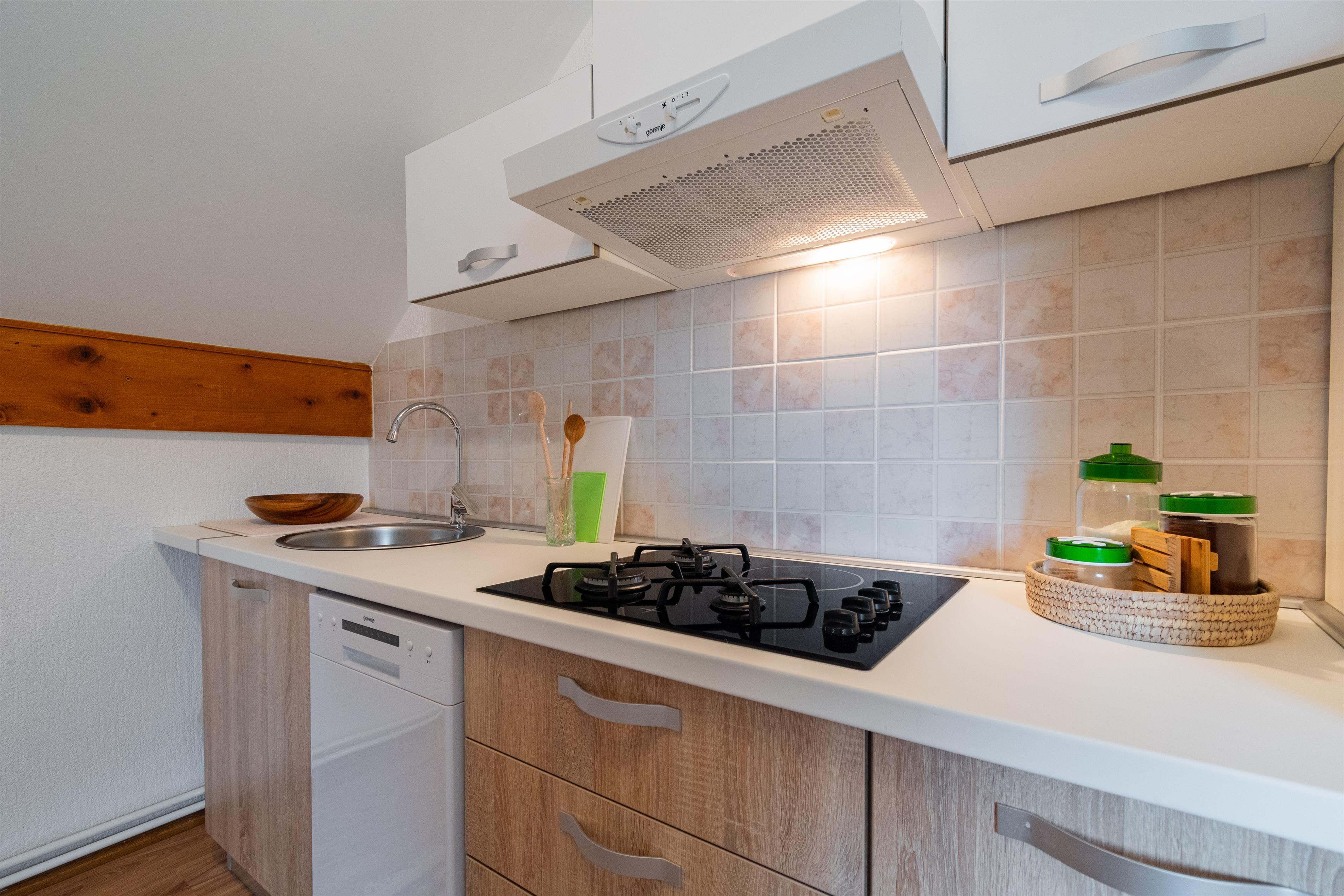 Kitchen (7 m2): Standard equipment: Refrigerator, Stove, Sink, Additional equipment: Dishwasher, Oven, On request: Water kettle