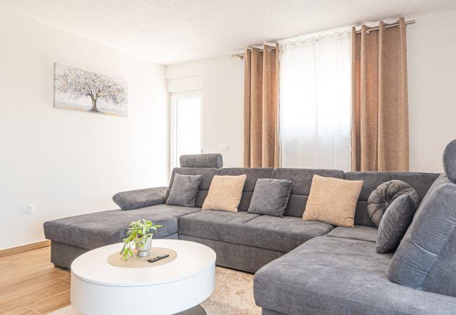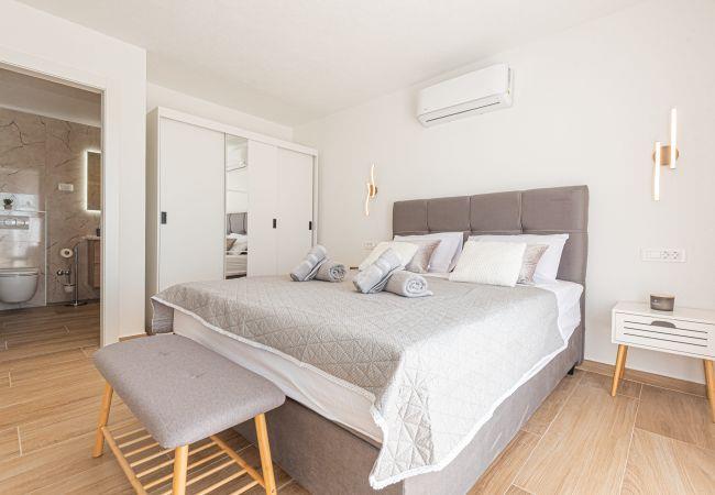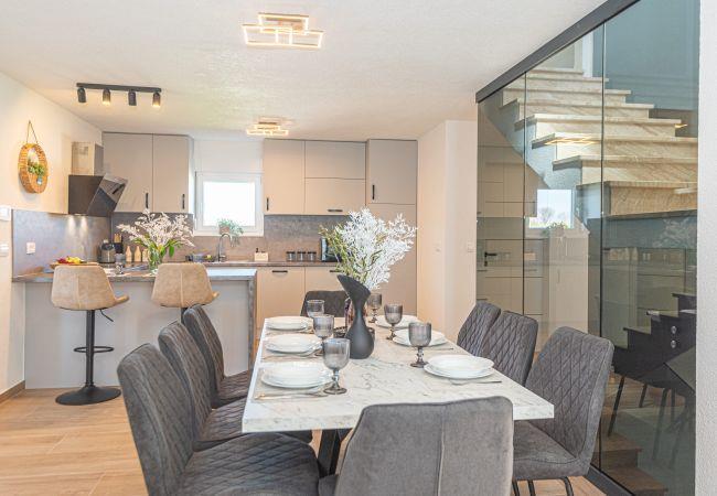 The interior of the villa exudes warmth and elegance, with carefully selected details that combine contemporary design and comfort. The spacious living room is decorated in light tones and equipped with a comfortable seating area, a smart TV and large windows that provide the space with plenty of natural light. It is connected to a modernly equipped kitchen and dining area in an open concept, making it ideal for sharing moments with family and friends.