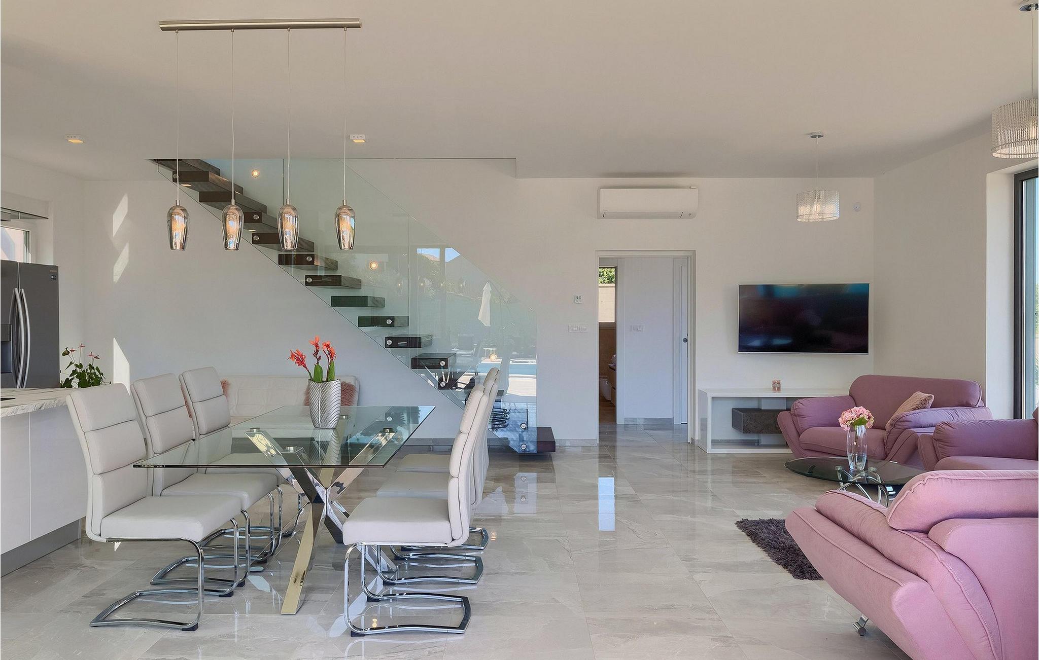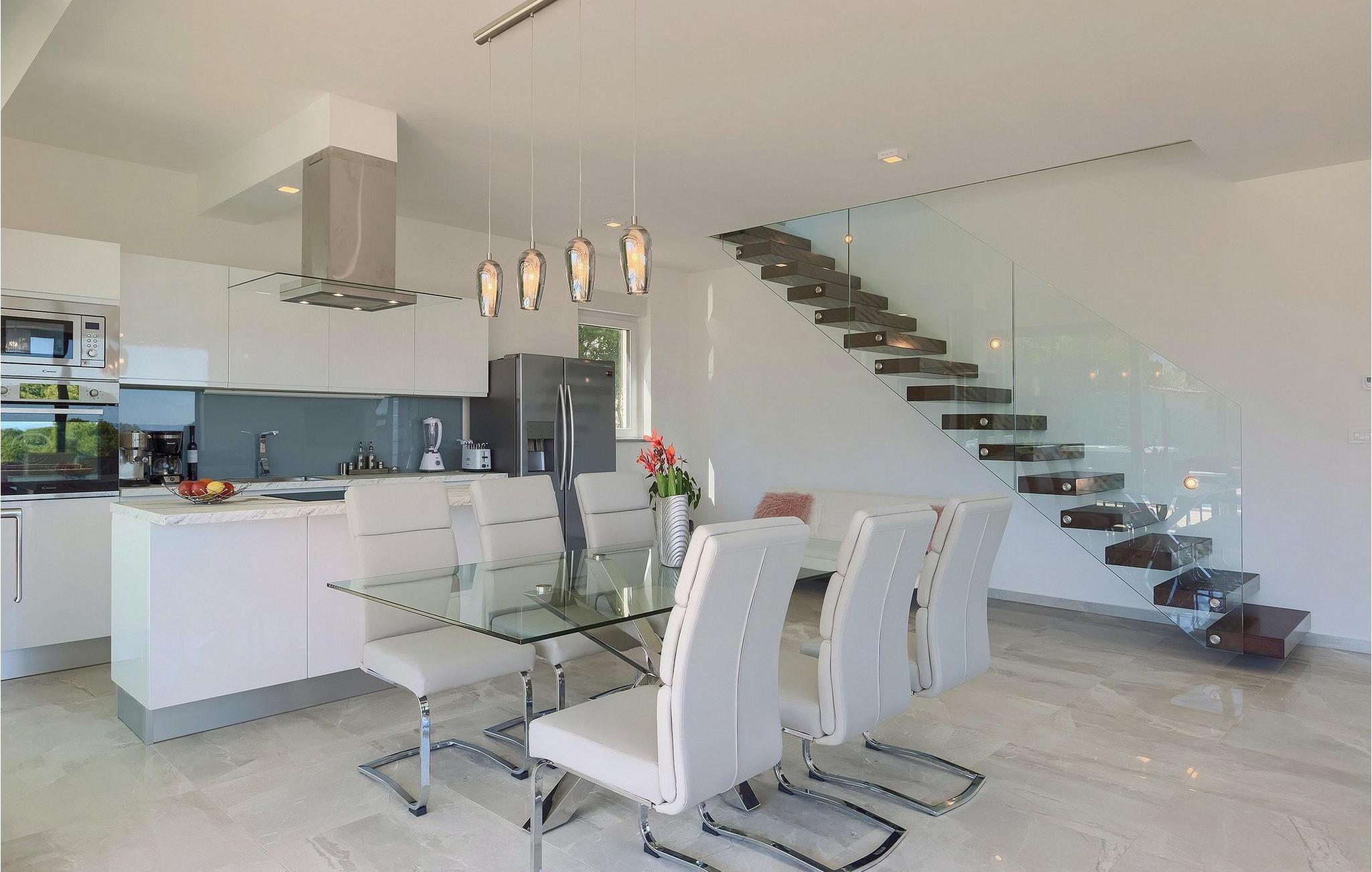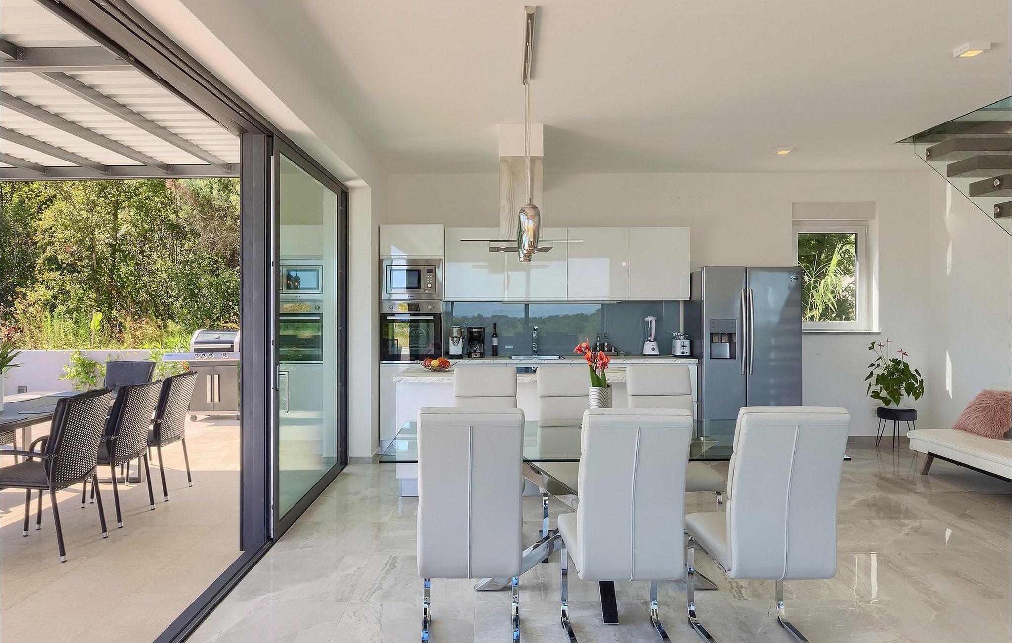 Ein moderner offener Wohnbereich mit völlig ausgestatteter Küche und elegantem Essbereich befindet sich im Erdgeschoss und bietet direkten Zugang zum Außenbereich, in dem auch ein Esstisch und ein Grill zur Verfügung stehen.