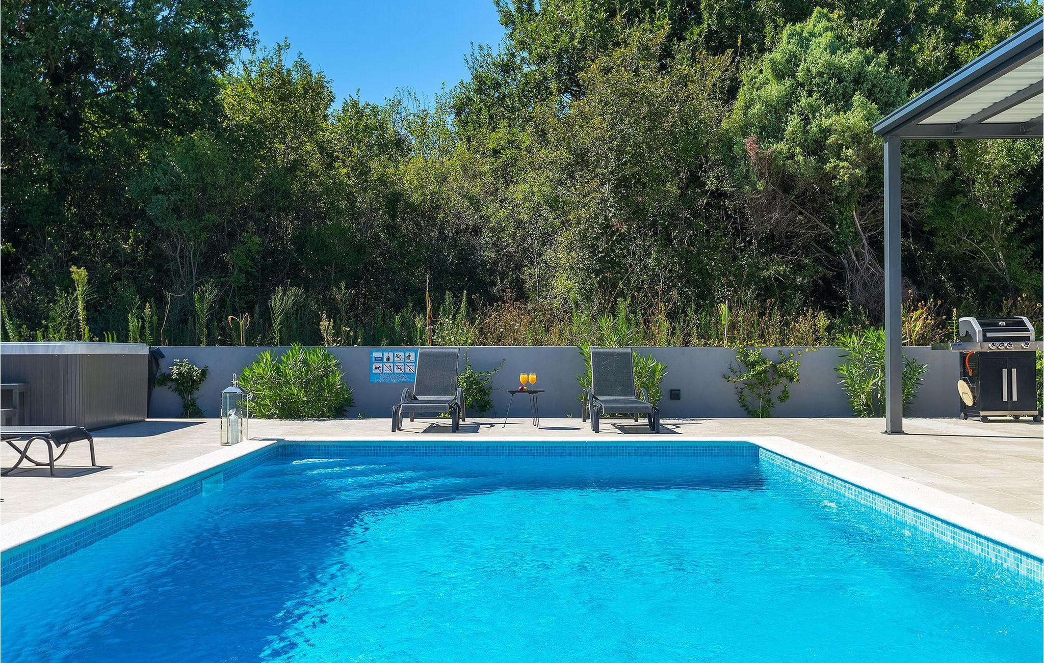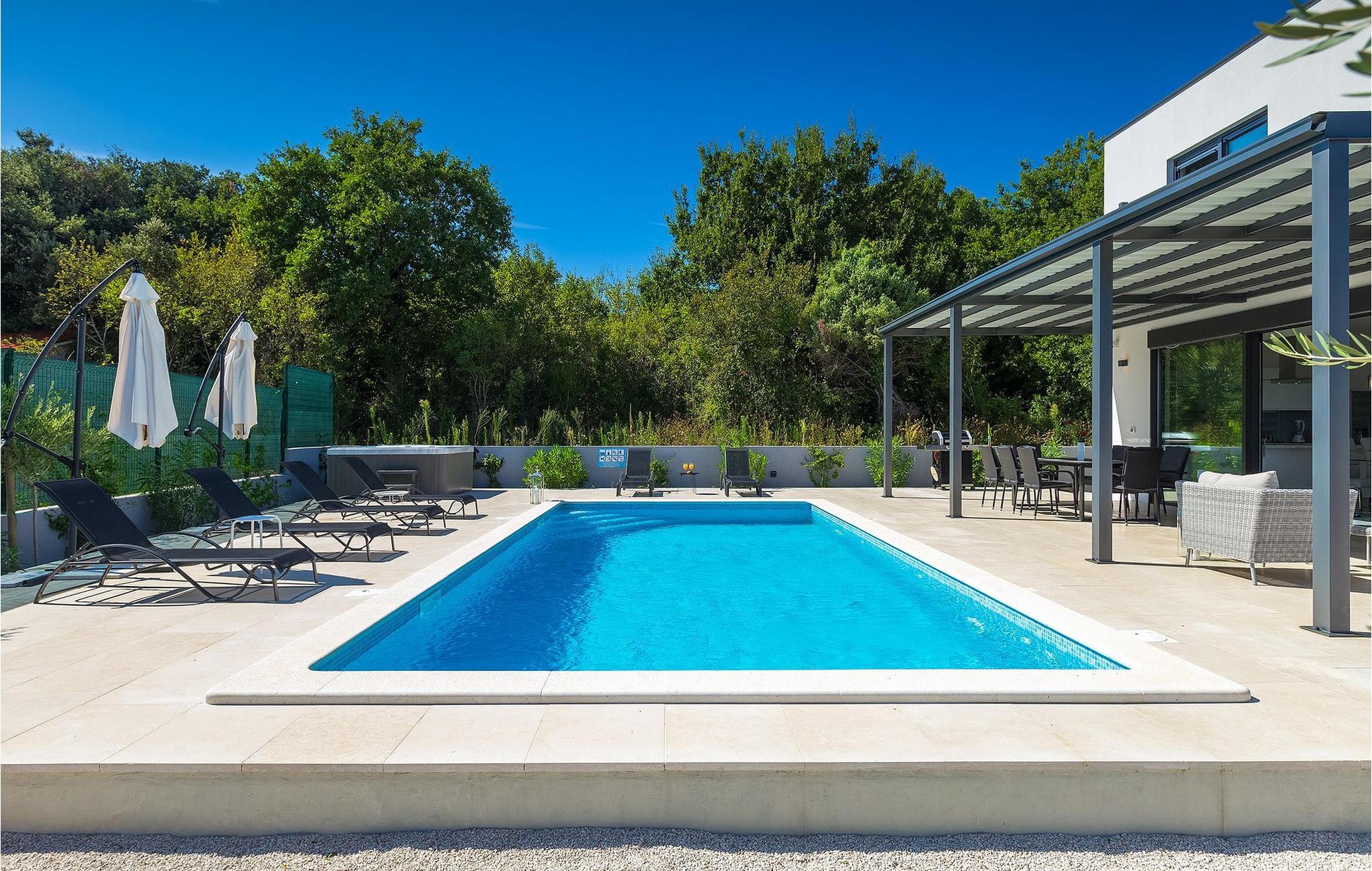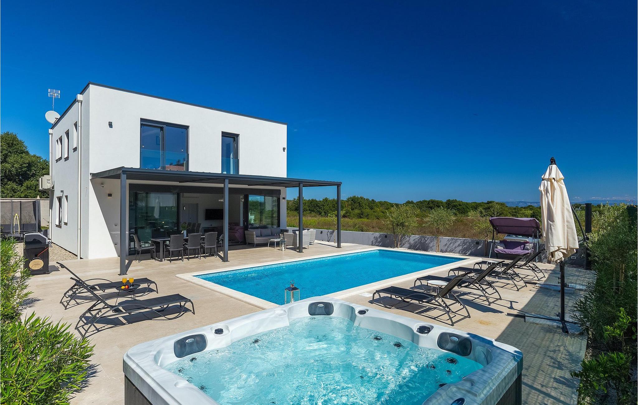 Der private Pool bietet an warmen Sommertagen eine dringend benötigte Erfrischung, während die Villa auch mit einem Jacuzzi und finnischer Sauna ausgestattet ist, die perfekt für kältere Abende geeignet sind.