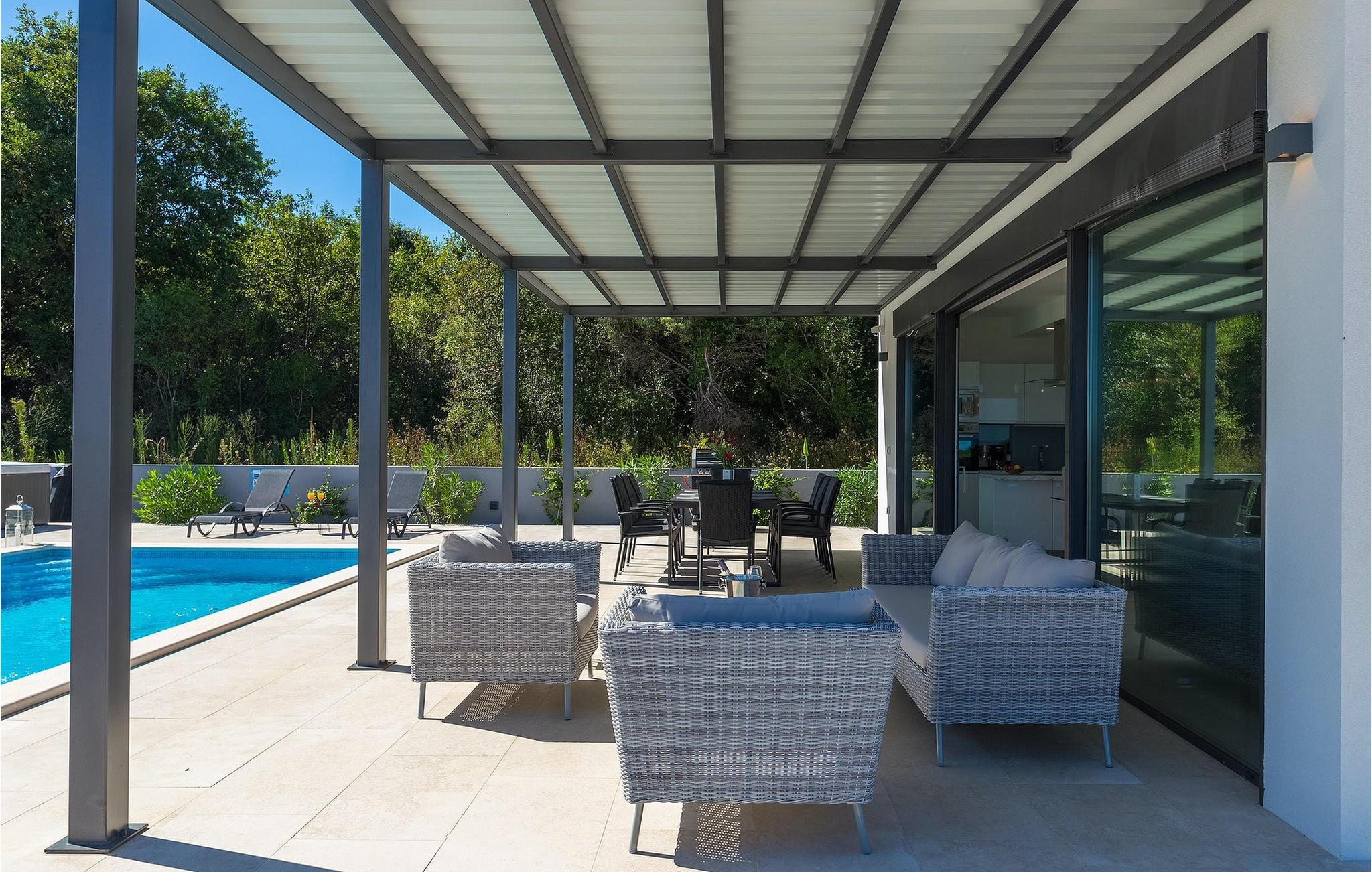 Ein überdachter Loungebereich neben dem Pool lädt abends zum Entspannen ein, während für die jüngsten Gäste ein Trampolin zur Verfügung steht.