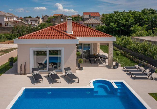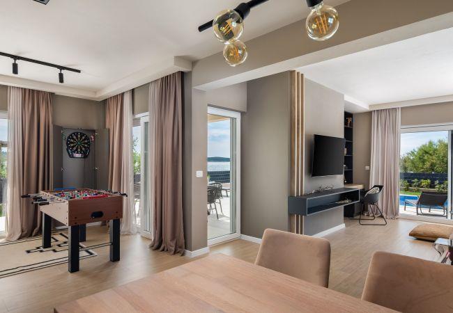 Villa Eleni offers You total privacy with surrounding wall, so You can enjoy Your stay without outside looks. Pool is surounded with sunbeds where You can spend Your day drinking cocktails with Your friends. Next to the pool there is a dining area where whole family can gather around tasty dish made on outside grill. The house is equipped with everything you need for your enjoyable stay. It consists of three bedrooms with en suite bathrooms, open-plan living room and dining room fully equipped kitchen and one separate toilet. As a part of living room, there is an entertainment corner with darts and table football and for those who are on a business vacation, there is also office corner. With three double beds and extendable sofa in the living room, this villa can comfortably accommodate 8 persons.