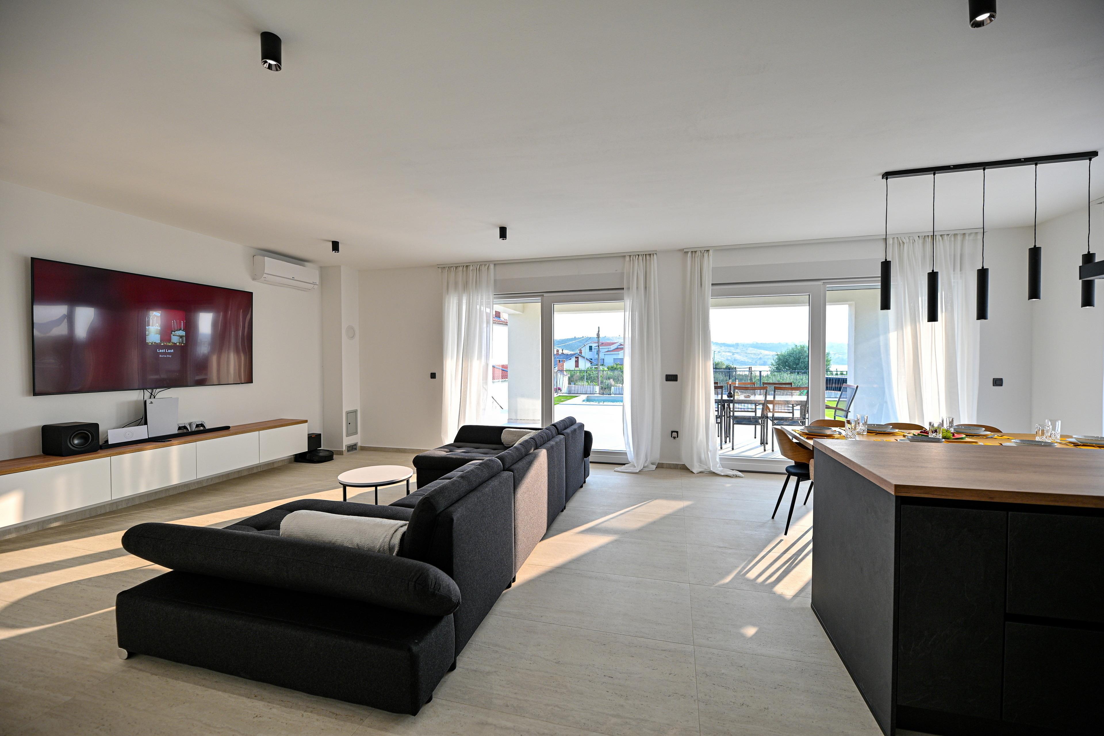 Entspannen Sie sich im Innenbereich mit einem 85-Zoll-4K-Smart-TV, einem Heimkino-Surround-System, einer PlayStation 5 und einer voll ausgestatteten Küche.