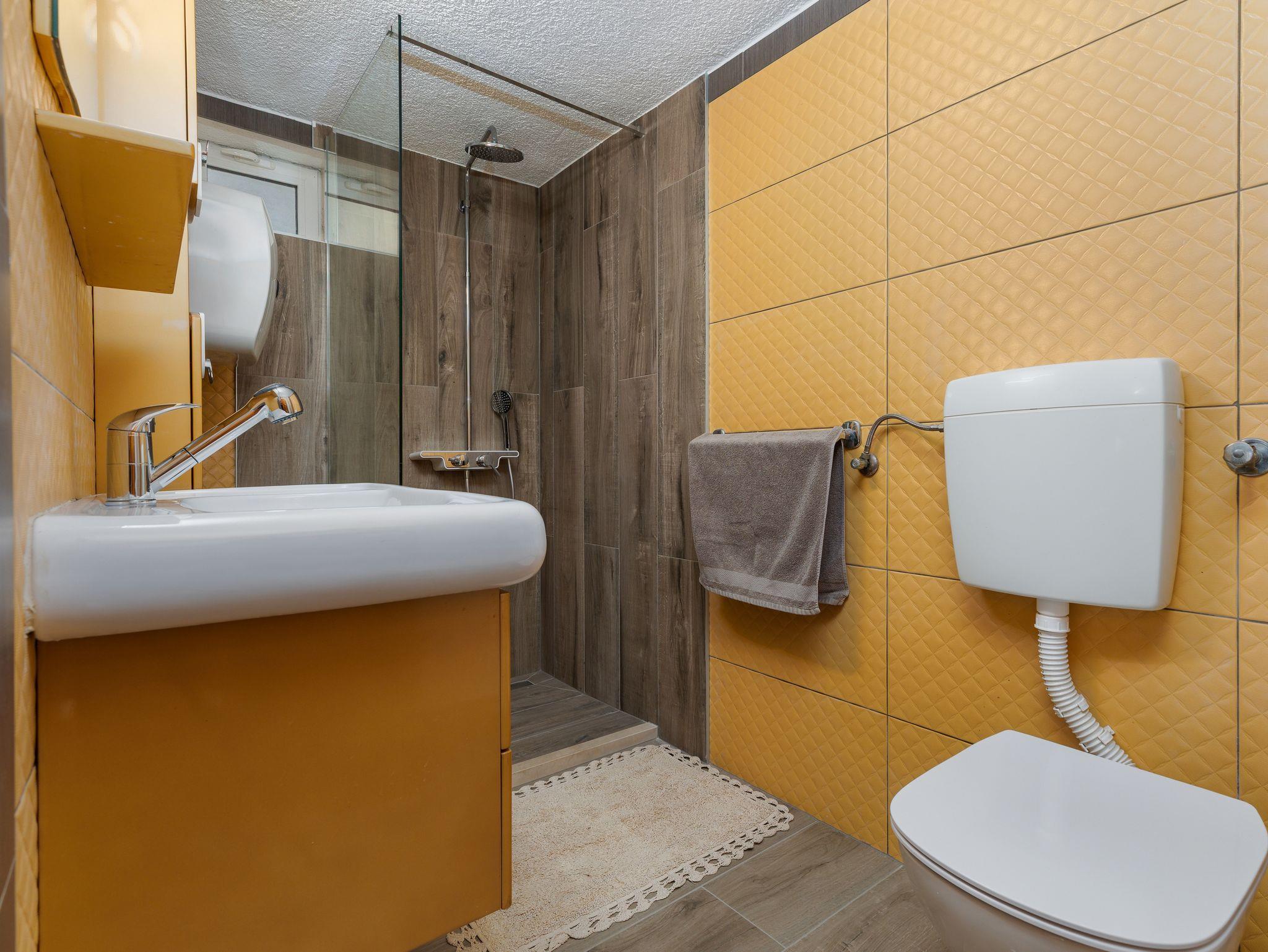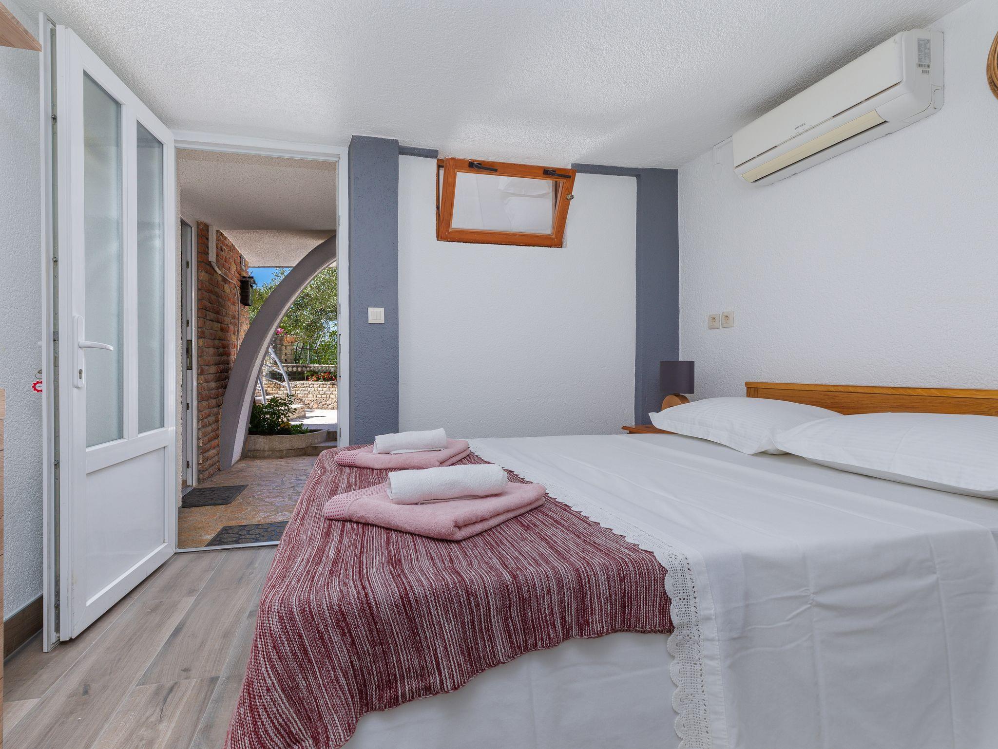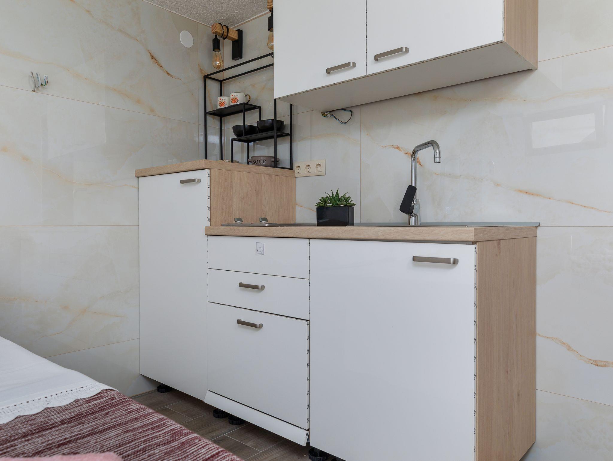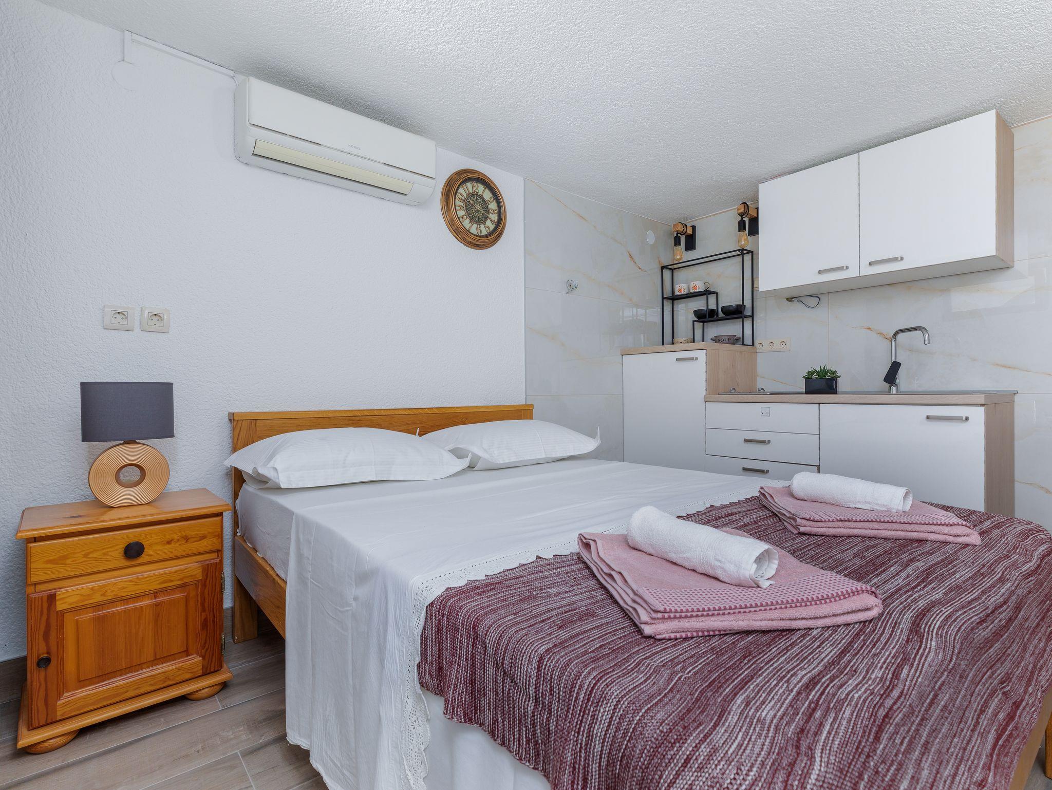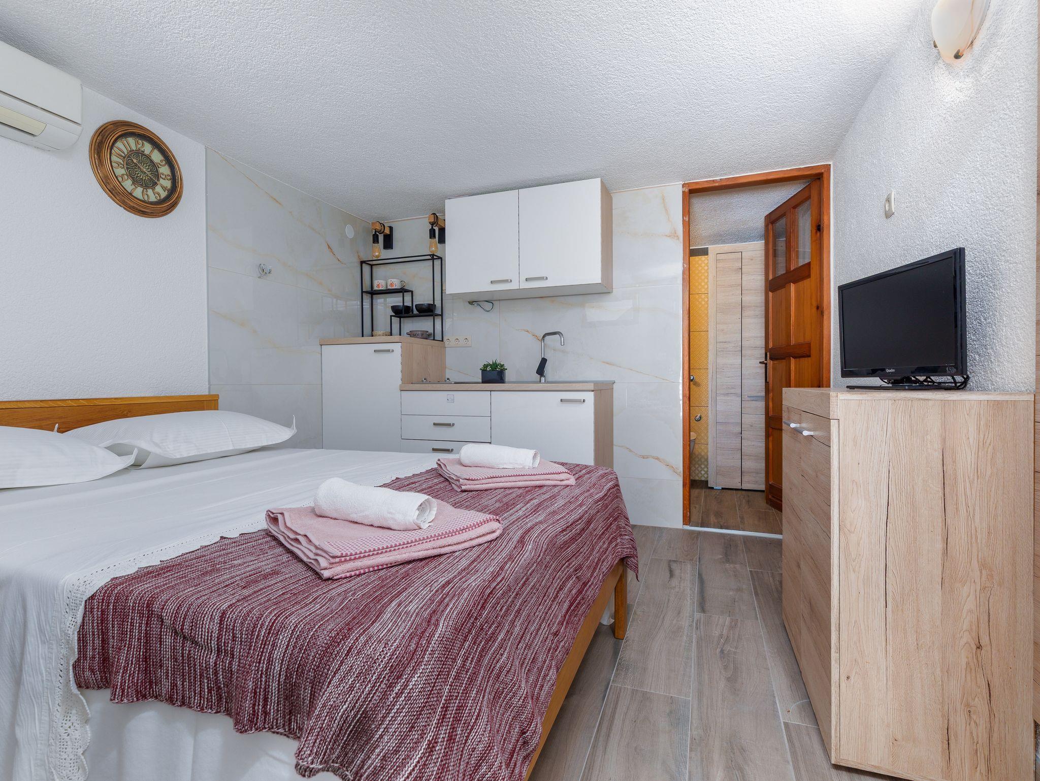 Studio bietet Platz für 2 Gäste. Die Betten sind in Schlafzimmern, die es 1 gibt, innerhalb einer Gesamtfläche von 19m2, angeordnet. Die Gäste haben eine eigene Terrasse zur Verfügung, auf der sie in warmen Sommernächten genießen können. Das Studio-Apartment bietet Meerblick. Es ist erlaubt, Speisen auf dem Gemeinschafts-Grill vorzubereiten. IM PREIS INBEGRIFFEN: Kurtaxe, Endreinigung, Klimatisierung, Parkplatz, Internet, Bügeleisen, Bügelbrett, tragbarer Grill. VERBINDLICHE ZUSÄTZLICHE KOSTEN: Aufzahlung für Kurzaufenthalte (prozentualer Zuschlag pro Nächtigungsanzahl: 30% - 1, 20% - 2, 10% - 3). Die Verfügbarkeit zusätzlicher Dienstleistungen in Ihrem reservierten Termin und die Preise derselben (falls nicht aufgeführt) müssen im Voraus überprüft werden. Zusätzliche Dienstleistungen die in der Zahlungsaufforderung nicht aufgeführt sind werden direkt beim Vermieter bezahlt, angenommen der Gast nutzt auch diese.