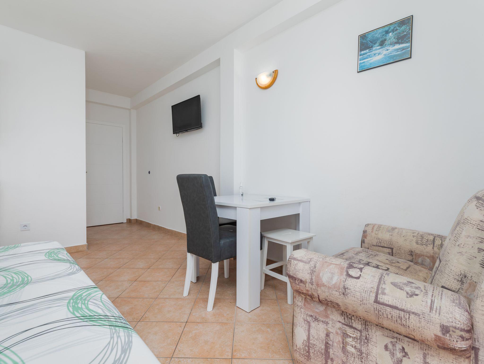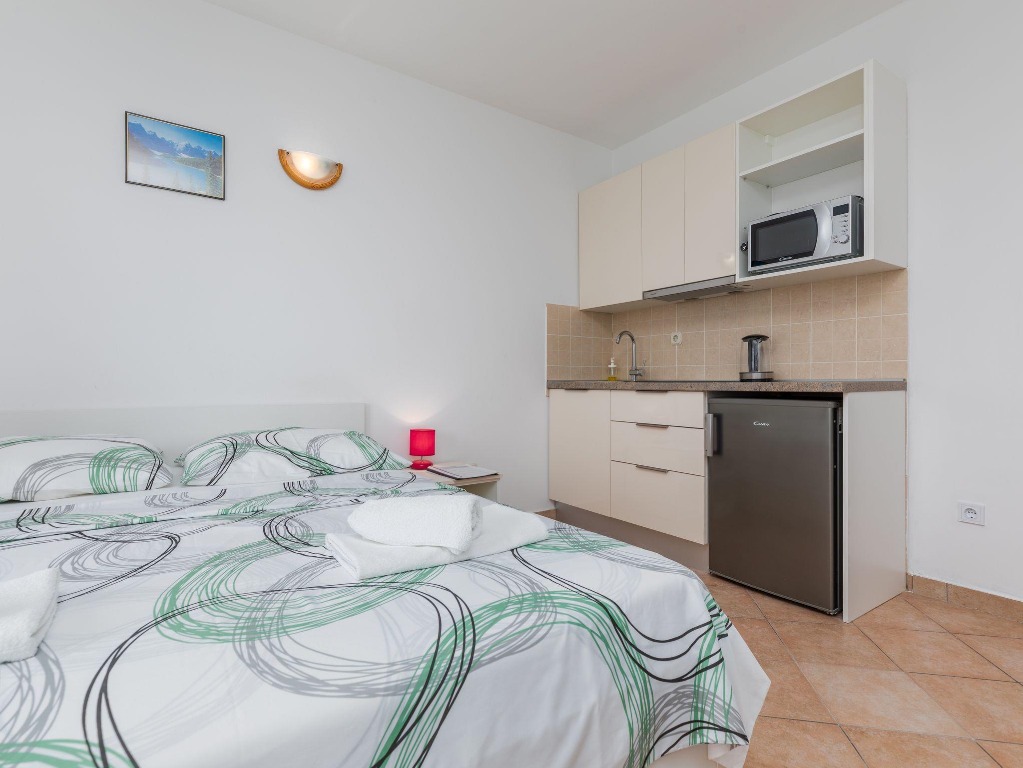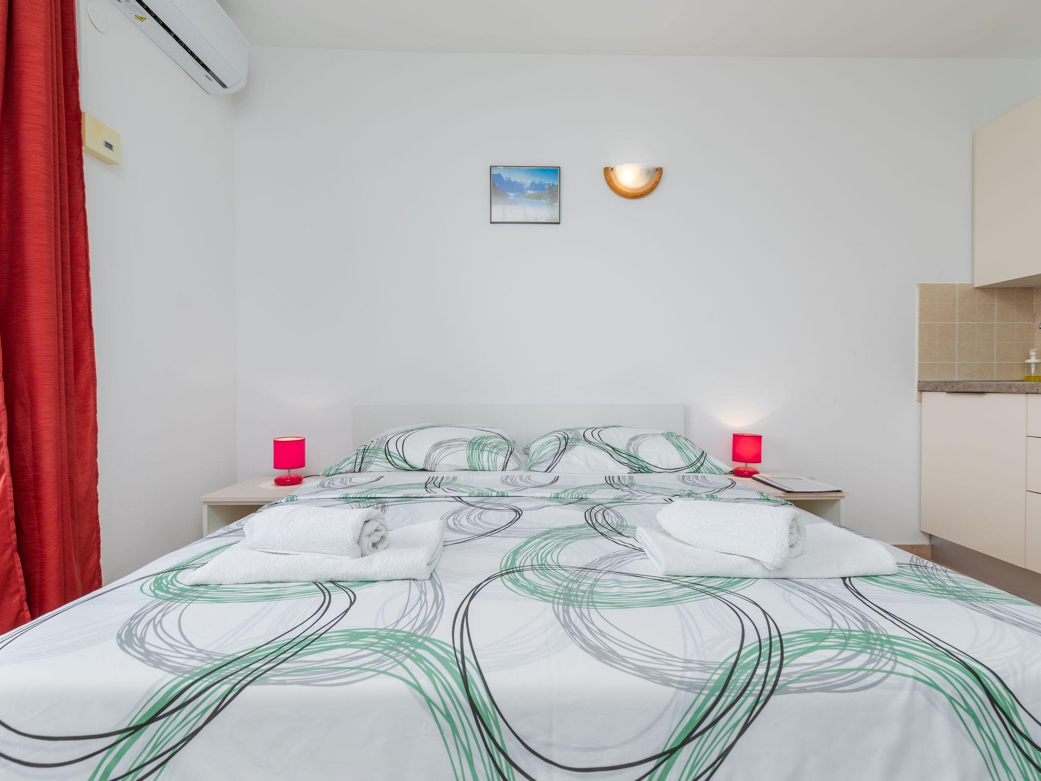 Studio bietet Platz für 2 Gäste. Die Betten sind in Schlafzimmern, die es 1 gibt, innerhalb einer Gesamtfläche von 24m2, angeordnet. Die Gäste haben einen eigenen Balkon zur Verfügung, auf der sie in warmen Sommernächten genießen können. Das Studio-Apartment bietet Meerblick. Es ist erlaubt, Speisen auf dem Gemeinschafts-Grill vorzubereiten. In der Unterkunftseinheit besteht die Möglichkeit des Mitbringens von Haustieren gegen Aufpreis. IM PREIS INBEGRIFFEN: Kurtaxe, Endreinigung, Klimatisierung, Parkplatz, Internet, Wäschewaschen, Bootsanlegeplatz, Kinderbett, Bügeleisen, Bügelbrett, tragbarer Grill. UNVERBINDLICHE ZUSÄTZLICHE KOSTEN: Haustiere (15,00 € pro Nacht). Die Verfügbarkeit zusätzlicher Dienstleistungen in Ihrem reservierten Termin und die Preise derselben (falls nicht aufgeführt) müssen im Voraus überprüft werden. Zusätzliche Dienstleistungen die in der Zahlungsaufforderung nicht aufgeführt sind werden direkt beim Vermieter bezahlt, angenommen der Gast nutzt auch diese. Ermäßigung auf den Grundpreis: Gratistag 21=19 (bei einem Aufenthalt von 21 Tagen oder mehr erhalten Sie 2 Gratistage für den Aufenthalt bis 31.12.26).