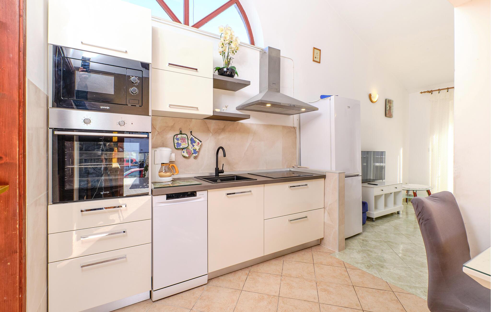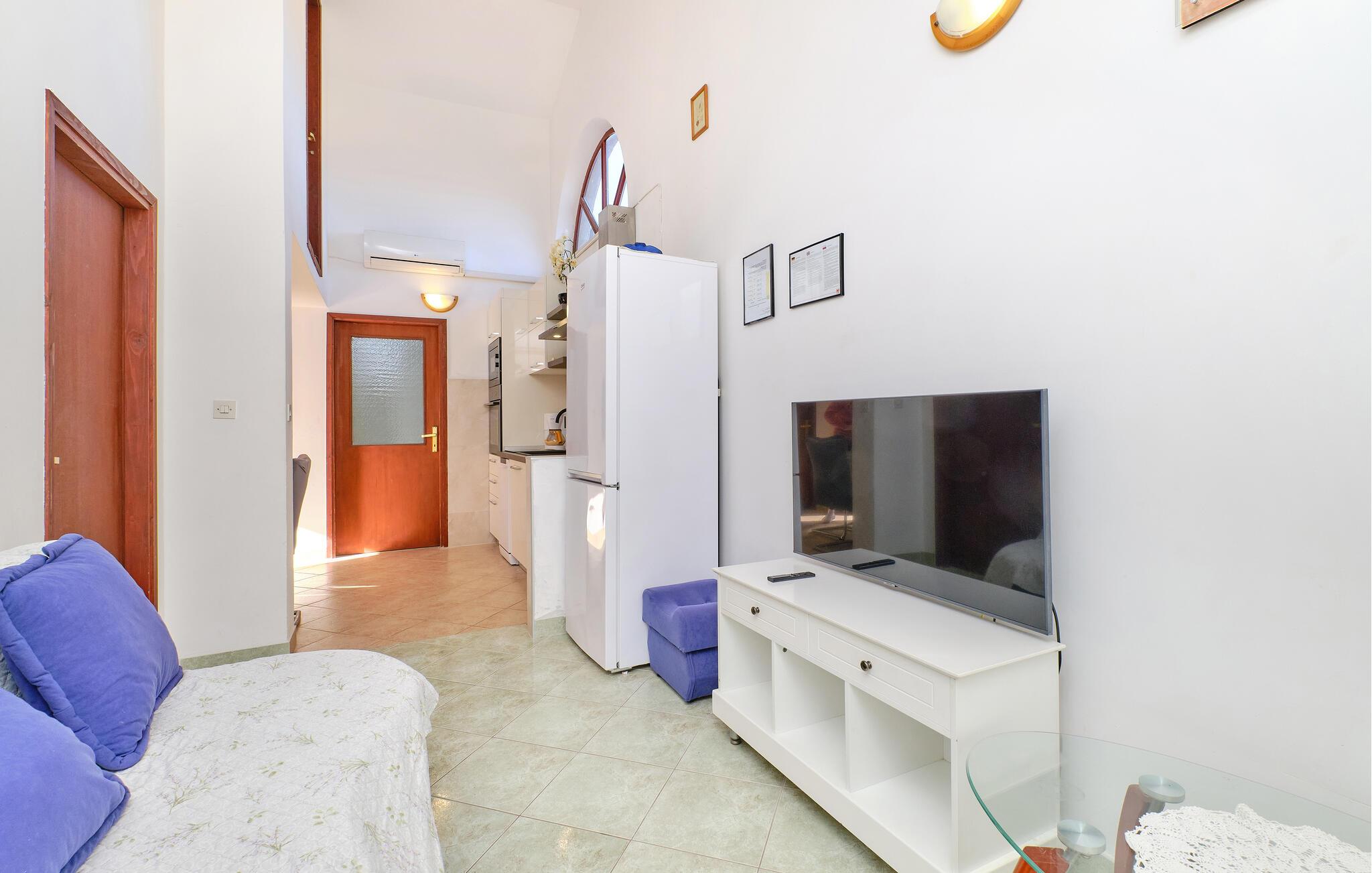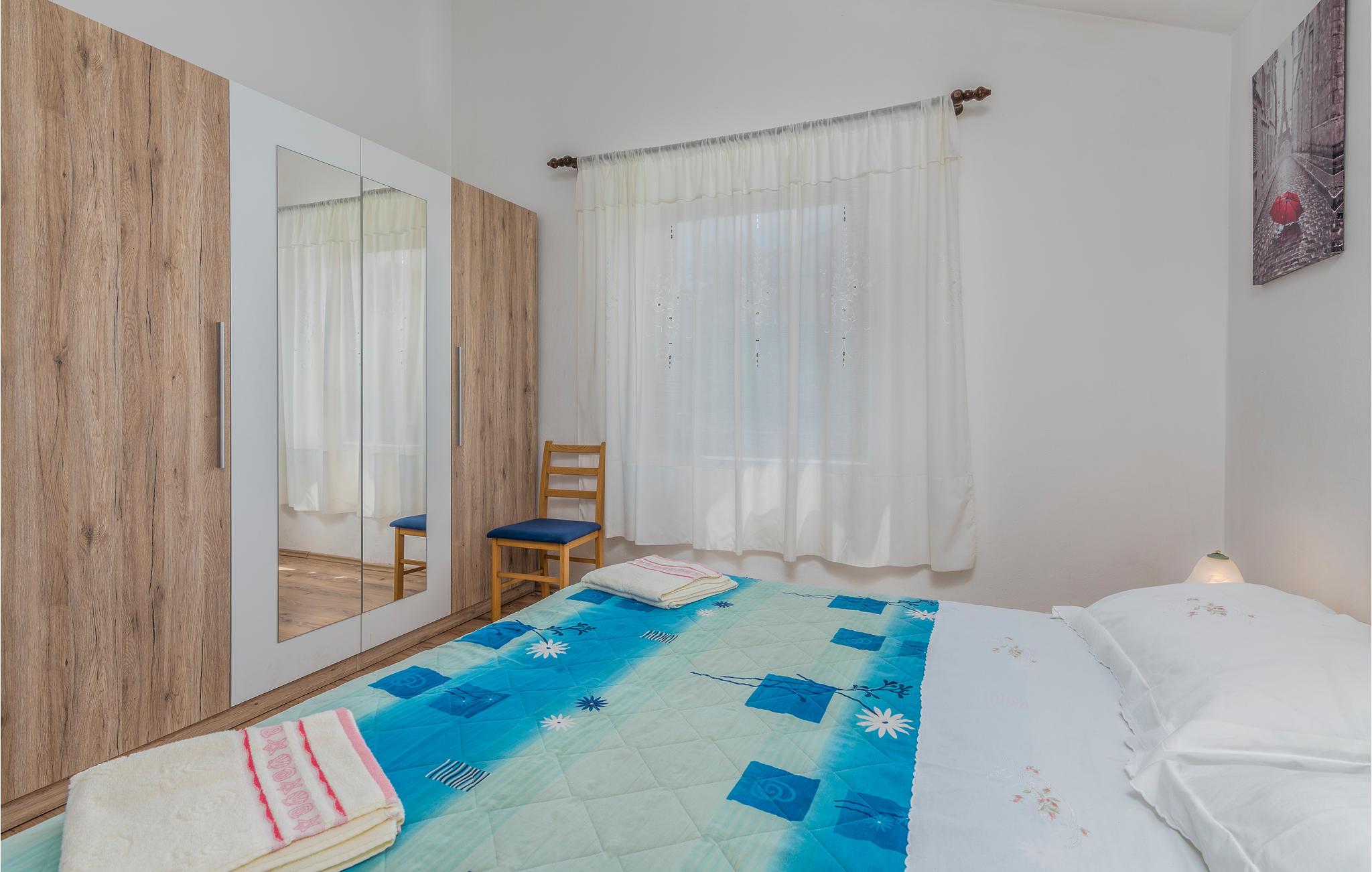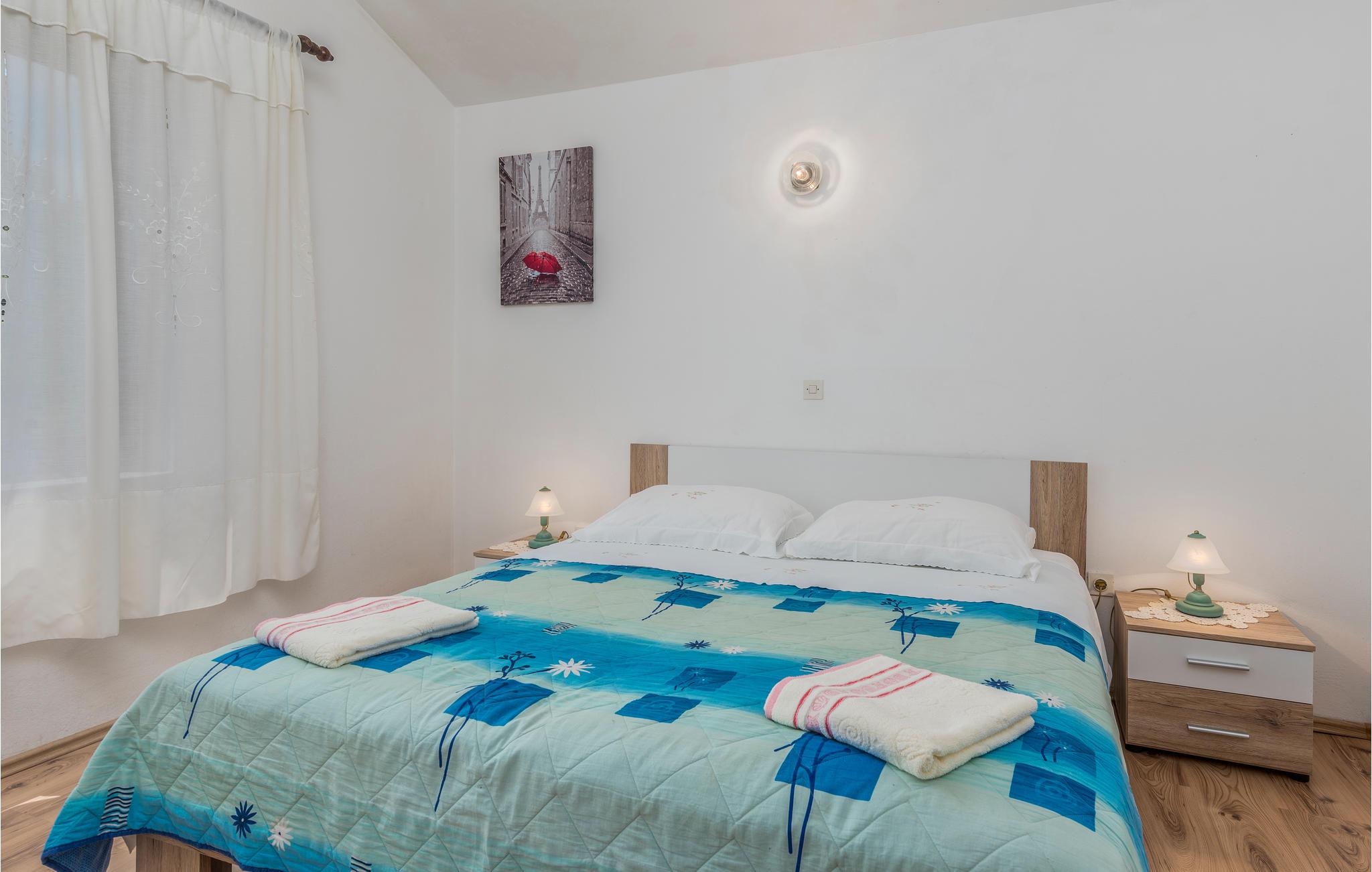 Die Wohnung befindet sich im ersten Stock eines Familienhauses mit mehreren Wohnungen. SIe besteht aus einer Küche, einem Wohnzimmer, zwei Schlafzimmern und einem Badezimmer und bietet Platz für fünf Personen. Ihre Haustiere sind ebenfalls willkommen.