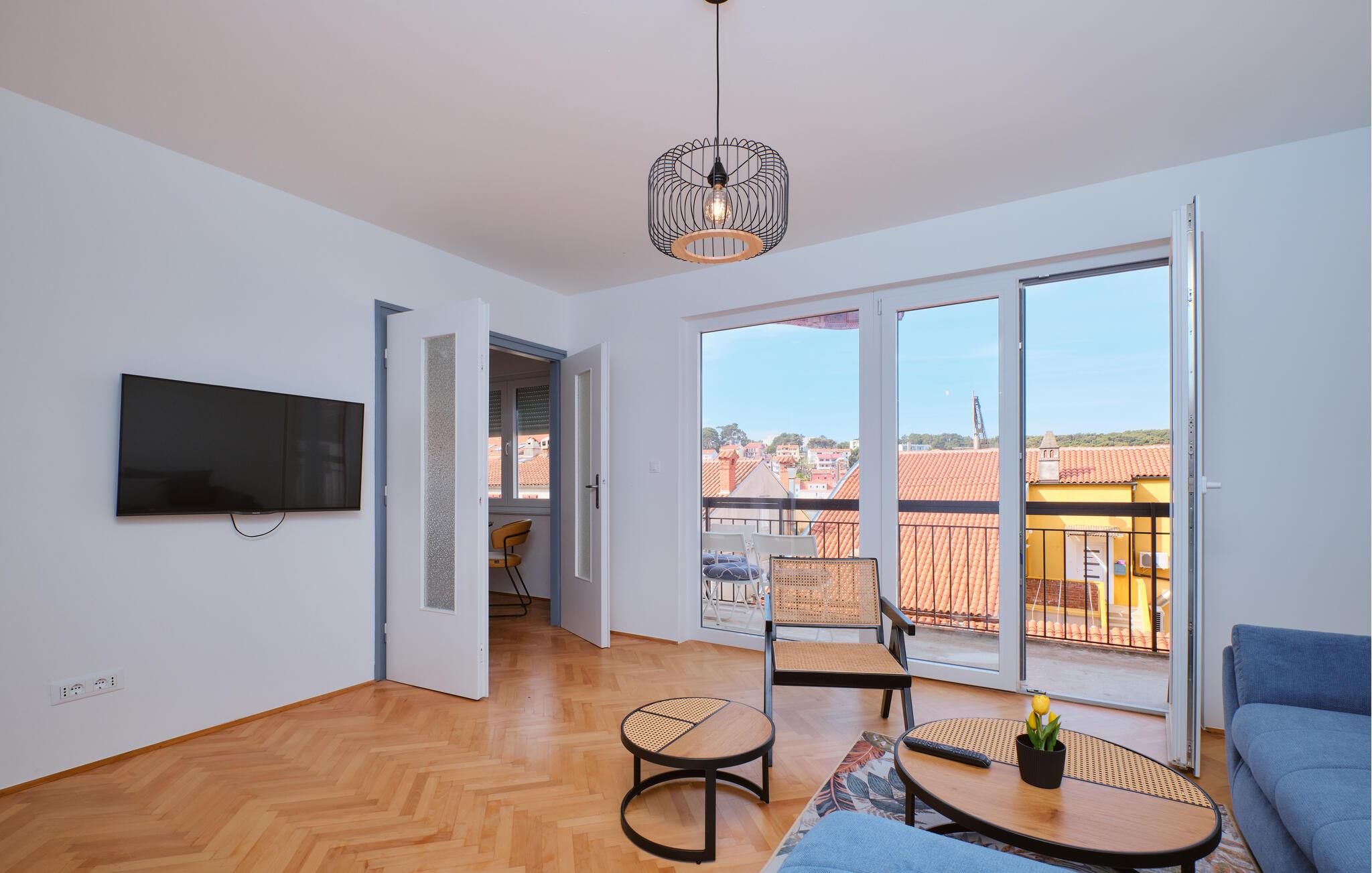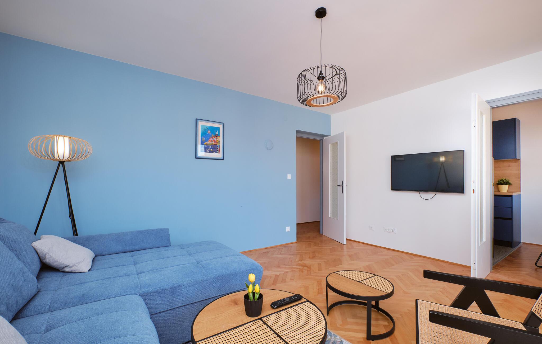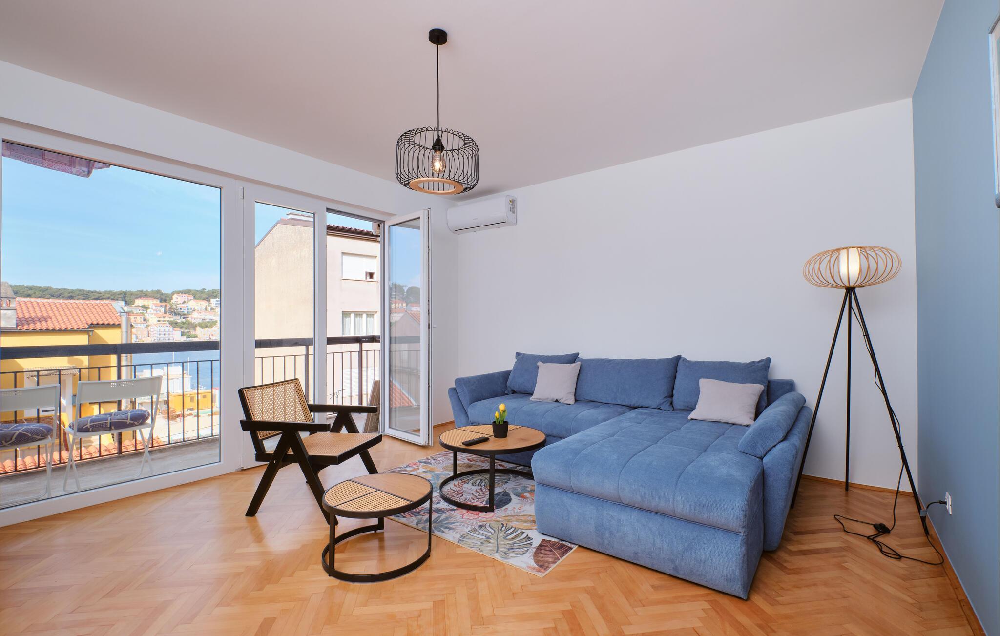 Diese moderne Wohnung vereint Eleganz und Behaglichkeit auf sehr harmonische Weise. Durch bodentiefe Fenster fällt viel warmes Tageslicht ins Innere, während Sie einen schönen Blick auf die Stadt und das Meer haben. Mediterrane Farben, eine warme Holzoptik und eine bequeme Sofalandschaft sorgen zusätzlich für einen entspannten Aufenthalt. Egal ob Sie Ihre Lieblingsmusik oder gemeinsam kochen – hier bestimmen Sie den Rhythmus Ihres Tages.