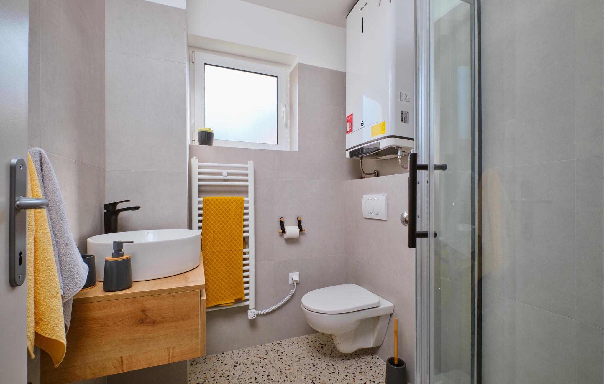 - WC mit warmem und kaltem Wasser, Dusche