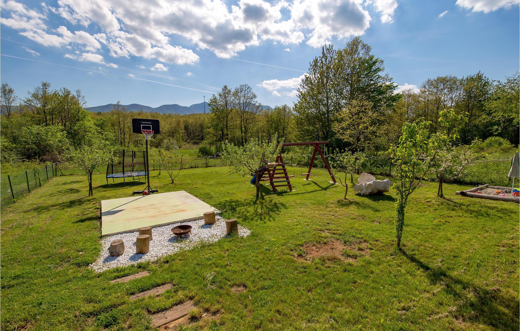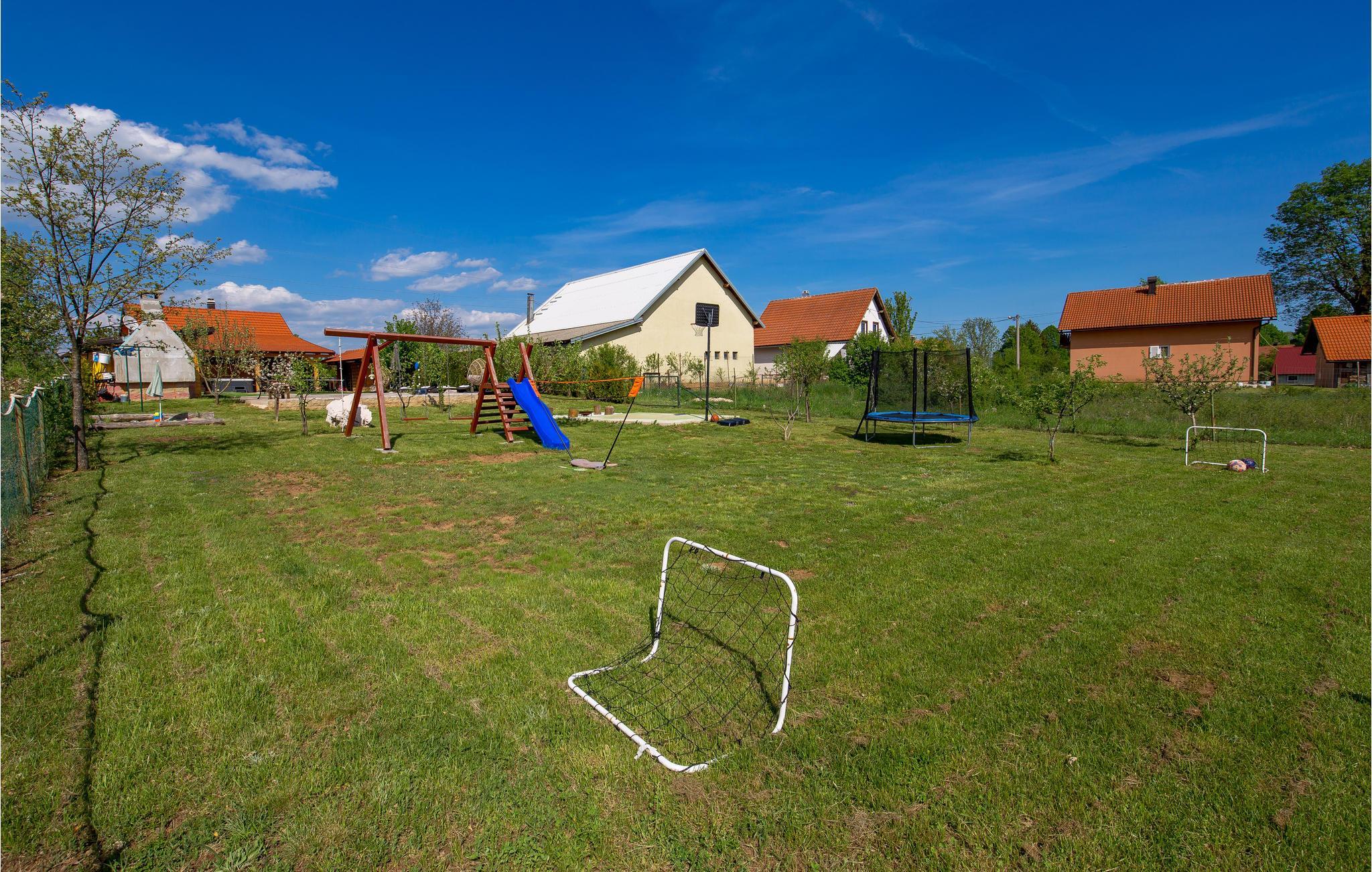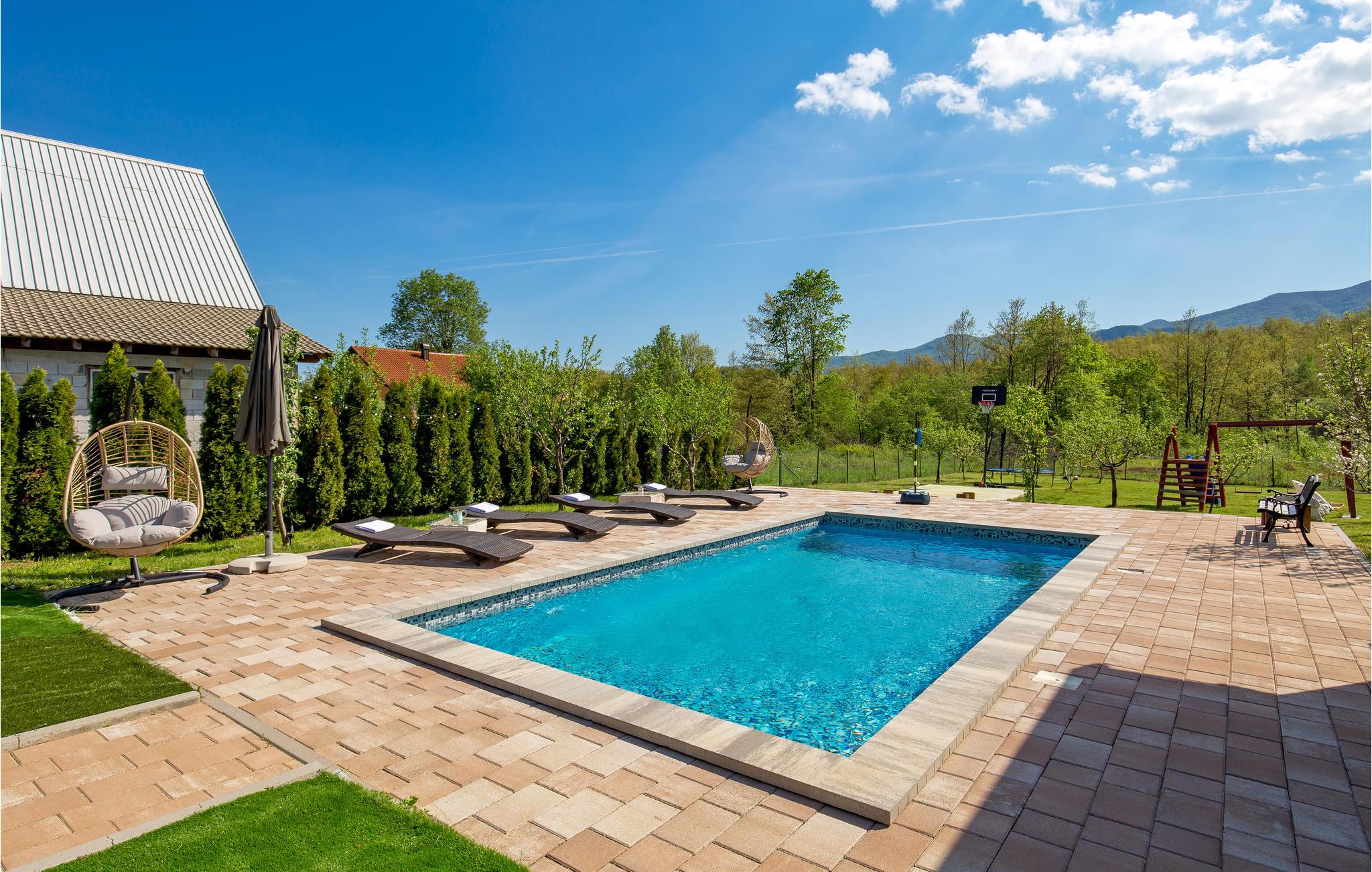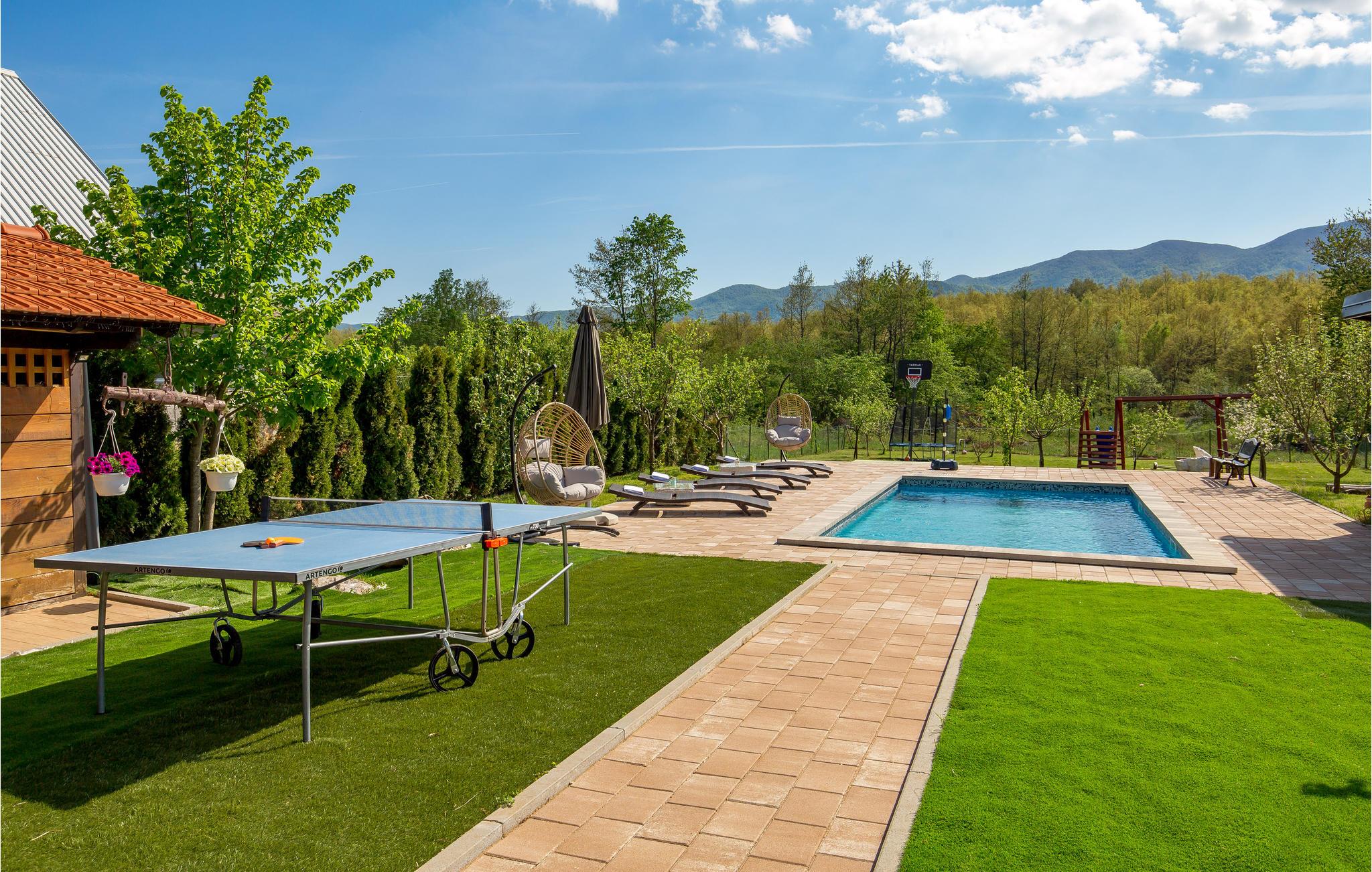 Dieses helle und geräumige Ferienhaus mit Pool ist perfekt geeignet für Ihren Familienurlaub. Stilvoll dekoriert, bietet es Ihnen maximalen Komfort und Erholung. Das Haus erstreckt sich über das Erdgeschoss und die Galerie. Im Erdgeschoss gibt es eine offene Küche mit allen notwendigen Annehmlichkeiten, ein komfortables Wohnzimmer mit Ausziehcouch und Kamin. Sie haben auch Zugang auf eine große Terrasse mit angrenzendem Pool, der ideal zur Erfrischung im Sommer ist. Der Schlafbereich mit Doppelbett und Einzelbett liegt auf der Galerie. Der Keller bietet Ihnen einen Unterhaltungs- und Aufenthaltsraum. Im großen Garten können Sie Ihre Lieblingsspezialitäten am Grill zubereiten und neben dem Pool im Außen-Whirlpool entspannen. Genießen Sie den herrlichen Ausblick auf die Berge und den See sowie die Nähe zum Wald. Erkunden Sie die umliegende Natur mit dem Fahrrad und besuchen Sie das Museum des großen Nikola Tesla in der Nähe, oder den Nationalpark Plitvicer Seen. Zum Meer sind es nur etwa 50 km.