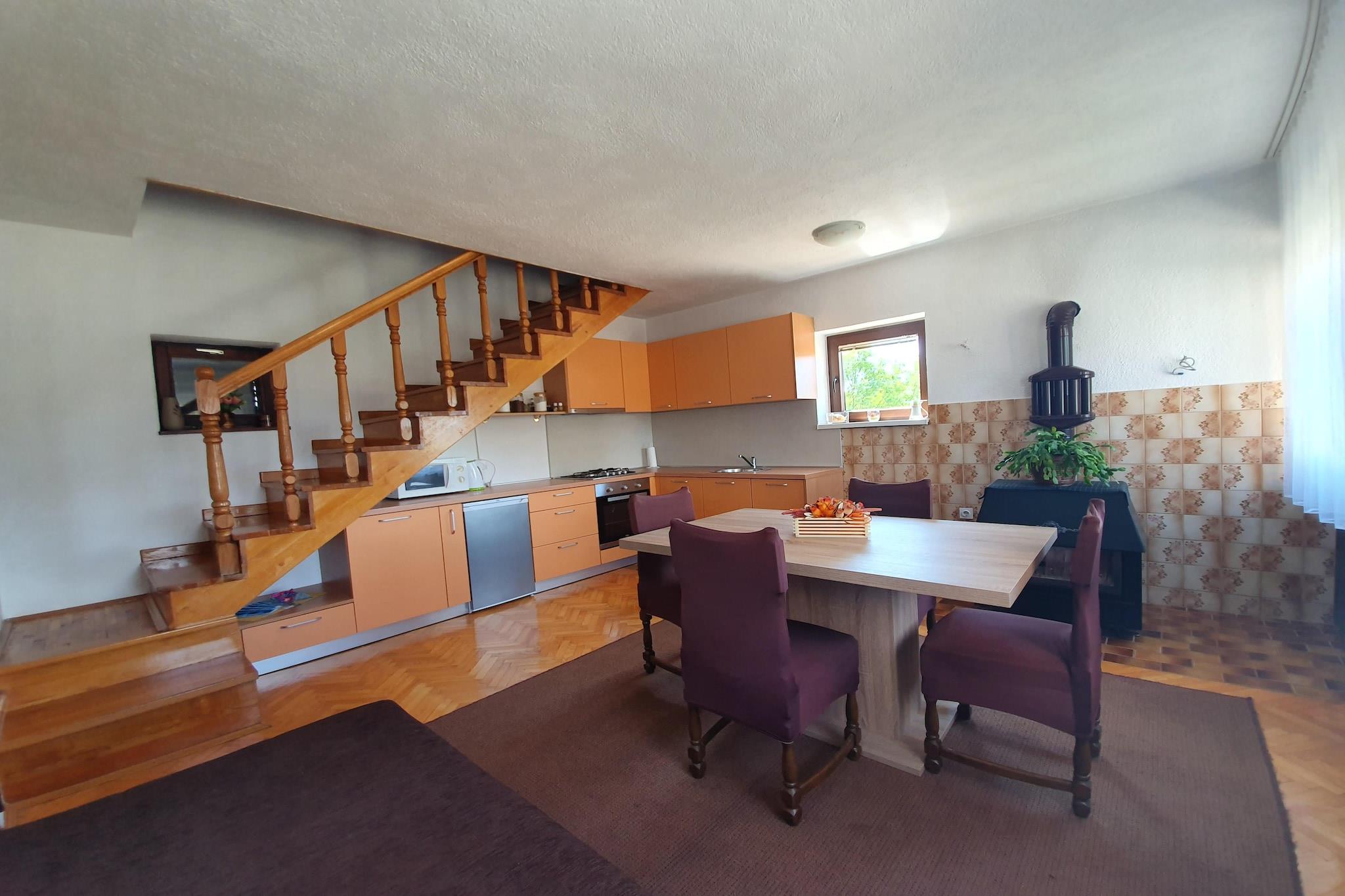 A Peaceful Retreat in Nature This holiday home for three guests offers a tranquil escape in Lovinac, surrounded by breathtaking landscapes and rich cultural heritage. Located just 200 meters from the town center and 1 km from a scenic lake, this home provides free WiFi, a private garden, and a roofed terrace, ensuring relaxation and privacy. Whether you're enjoying the peaceful surroundings or exploring nearby attractions, this holiday home is perfect for a rejuvenating stay. Comfortable and Well-Equipped Spaces Inside, the ground floor features a fully equipped kitchen with a four-ring stove, oven, and fridge-freezer, alongside a cozy living and dining room with a single sofa bed. The first floor includes a bedroom with a double bed and a single bed, a TV, and a bathroom with a shower, washbasin, and toilet. Guests can also enjoy central heating, garden furniture, and a private terrace, making it ideal for a comfortable getaway. Explore Lovinac’s Natural Beauty Nearby, National Park Paklenica offers stunning hiking trails through dramatic canyons, while Plitvice Lakes National Park showcases breathtaking waterfalls and crystal-clear lakes. Explore Zadar, known for its historic sites like the Sea Organ and Zadar Cathedral. For dining, Izletište Cvituša serves delicious local cuisine, while Bistro Lika offers a cozy atmosphere with traditional flavors. Whether discovering nature or savoring authentic dishes, this holiday home is the perfect retreat.