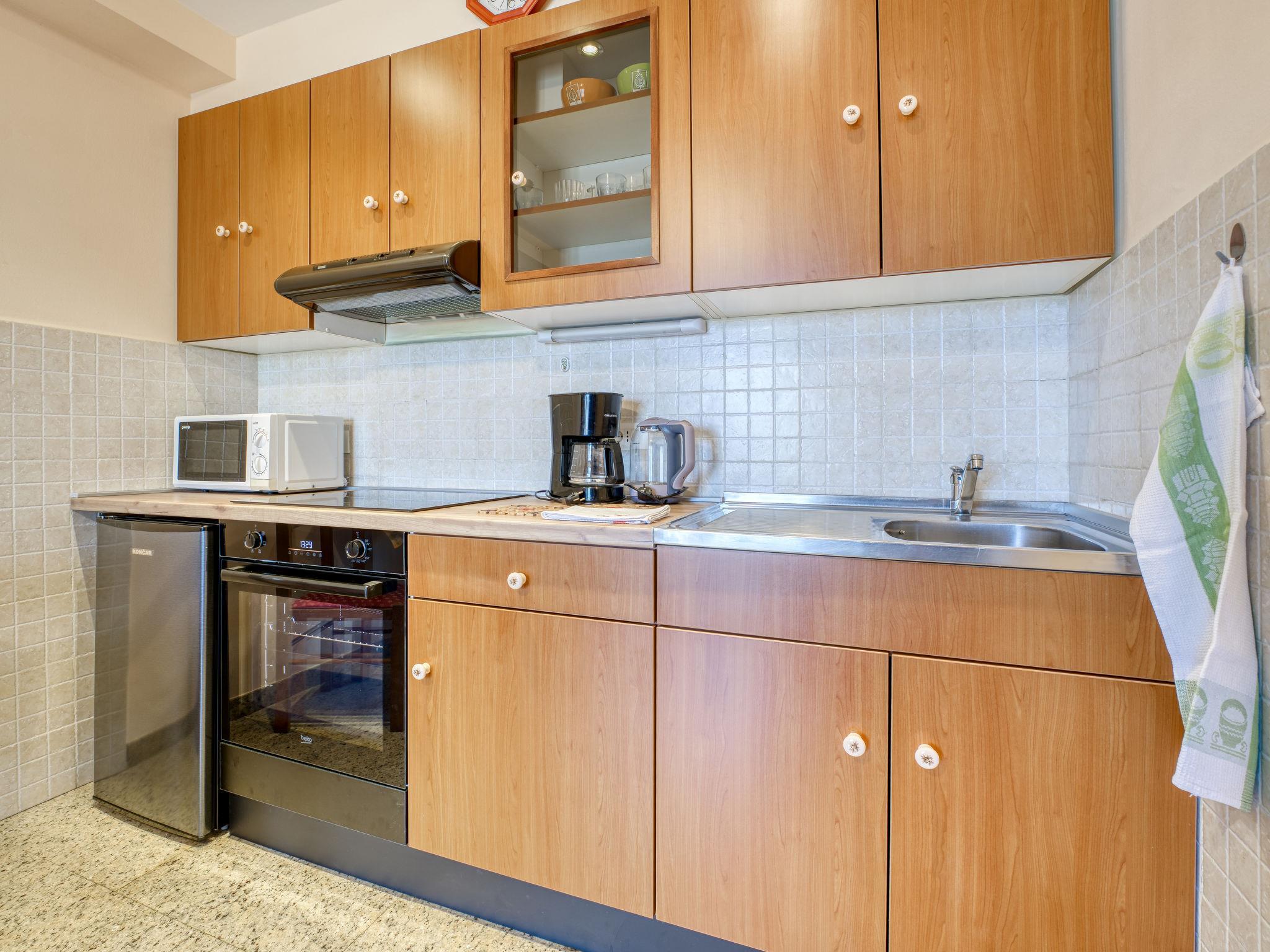 2-room apartment 28 m2, on the ground floor, south facing position. Living/dining room with satellite TV (flat screen). Exit to the terrace. 1 room with 1 double bed (2 x 90 cm, length 200 cm), air conditioning. Open kitchen (4 hot plates, oven, microwave). Shower/WC. Heating (extra). Terrace 18 m2, roofed. Terrace furniture, barbecue. Facilities: Internet (WiFi, free). Please note: private entrance.