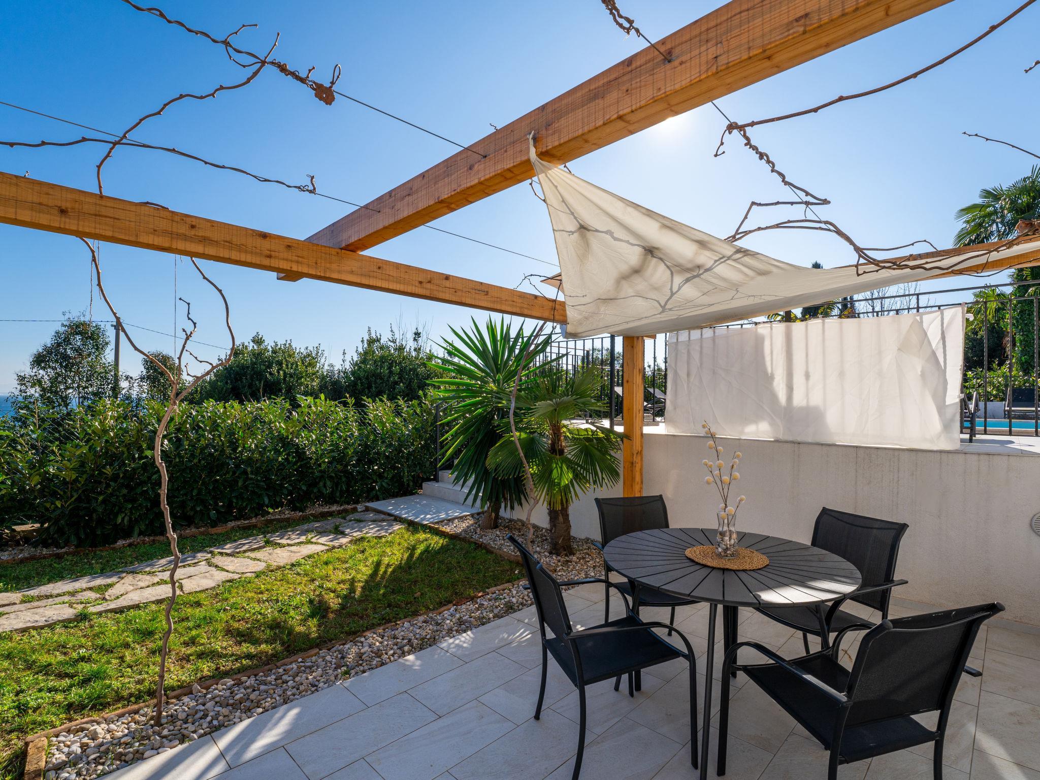 Beautiful apartment house "Villa Palma", renovated in 2023. 1.1 km from the centre of Lovran, in a sunny position, 600 m from the sea, 600 m from the beach. For shared use: property 900 m2 (fenced), garden with plants, swimming pool angular (8 x 4 m, depth 150 cm, seasonal availability: 01.May. - 15.Oct.) with internal staircase and salt-electrolysis pool-cleaning system. WC in the pool area, poolhouse with fridge and cooking stove, terrace (30 m2), garden furniture, barbecue. In the house: internet access. Parking at the house on the premises. Supermarket 300 m, restaurant 700 m, bar 300 m, bus stop 400 m, pebble beach 600 m. Tennis 400 m, walking paths from the house 600 m.