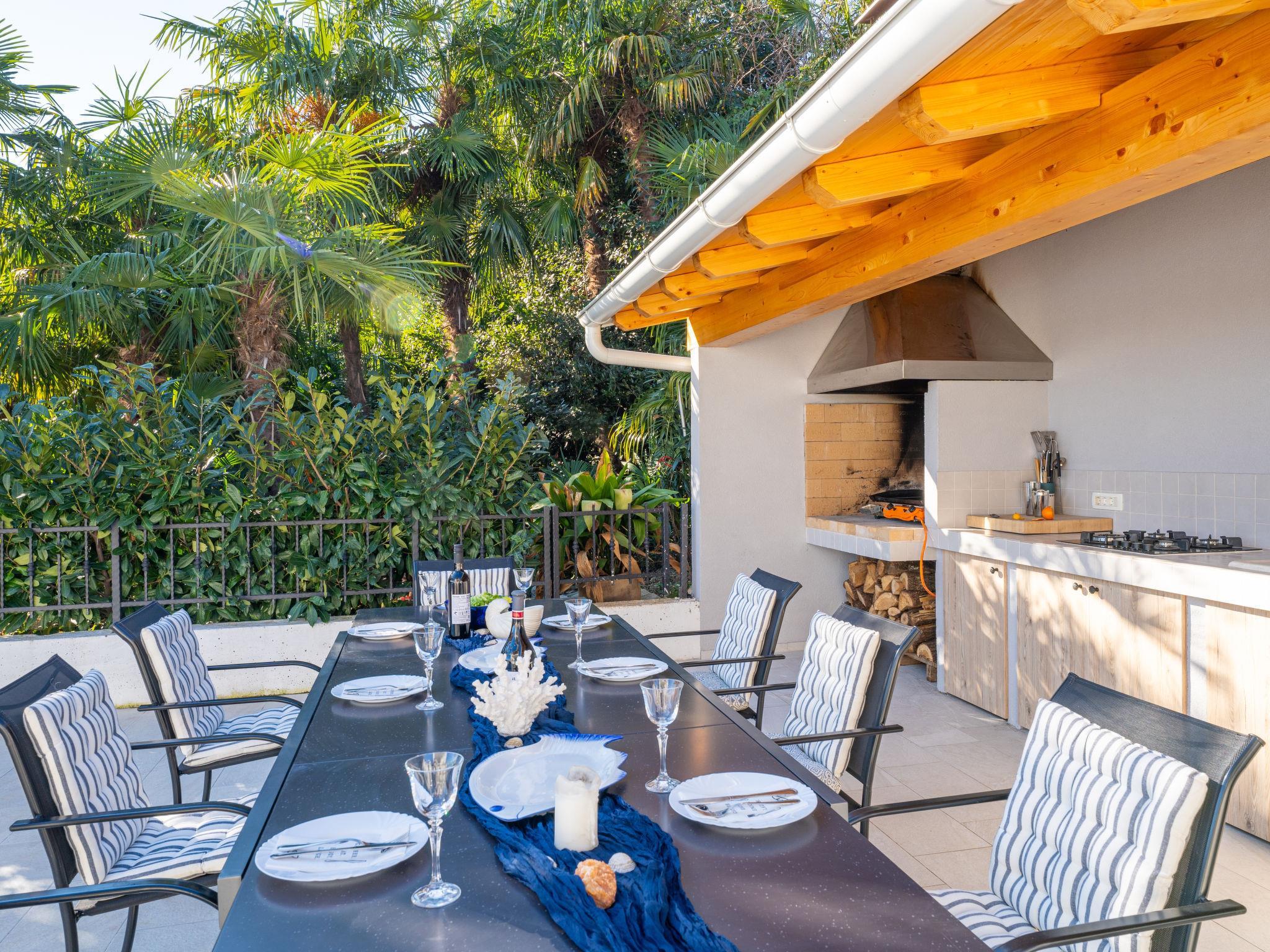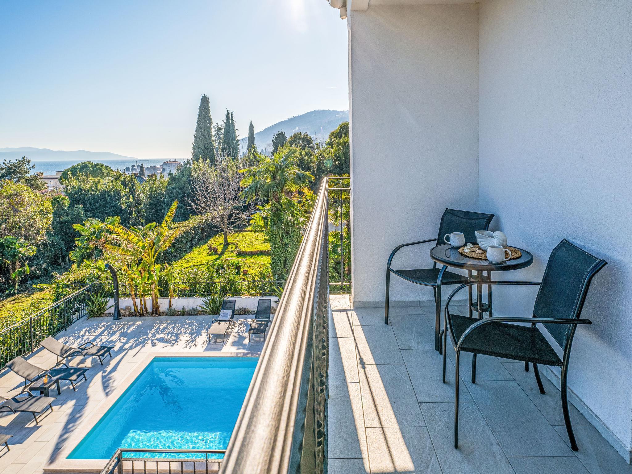 Beautiful apartment house "Villa Palma", renovated in 2023. 1.1 km from the centre of Lovran, in a sunny position, 600 m from the sea, 600 m from the beach. For shared use: property 900 m2 (fenced), garden with plants, swimming pool angular (8 x 4 m, depth 150 cm, seasonal availability: 01.May. - 15.Oct.) with internal staircase and salt-electrolysis pool-cleaning system. WC in the pool area, poolhouse with fridge and cooking stove, terrace (30 m2), garden furniture, barbecue. In the house: internet access. Parking at the house on the premises. Supermarket 300 m, restaurant 700 m, bar 300 m, bus stop 400 m, pebble beach 600 m. Tennis 400 m, walking paths from the house 600 m.