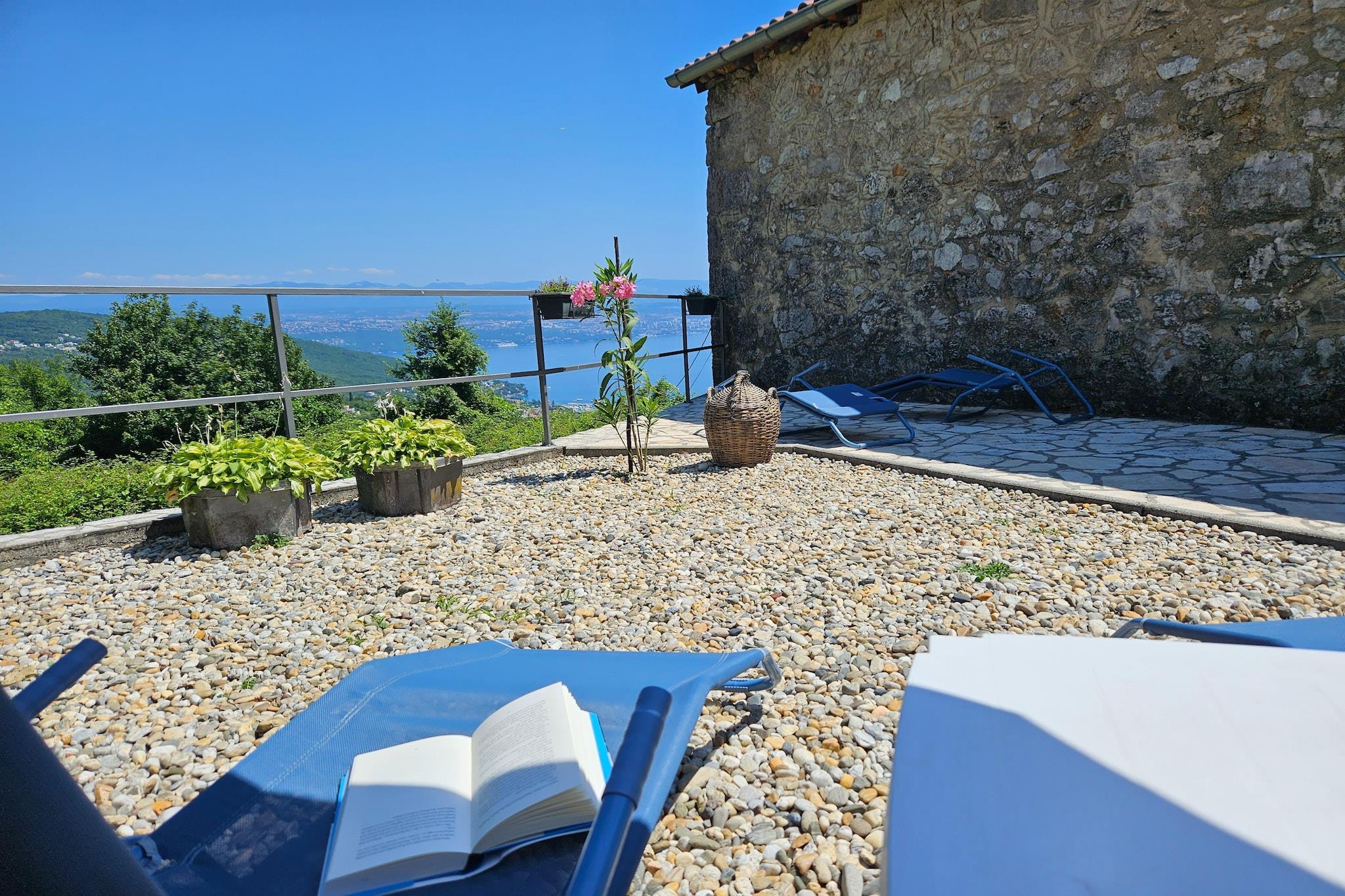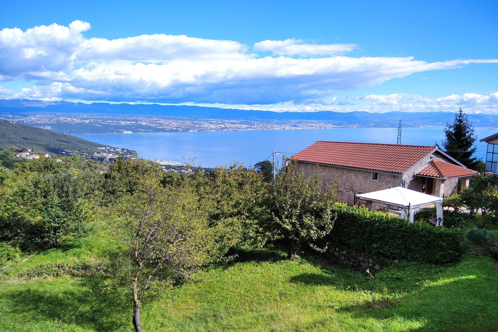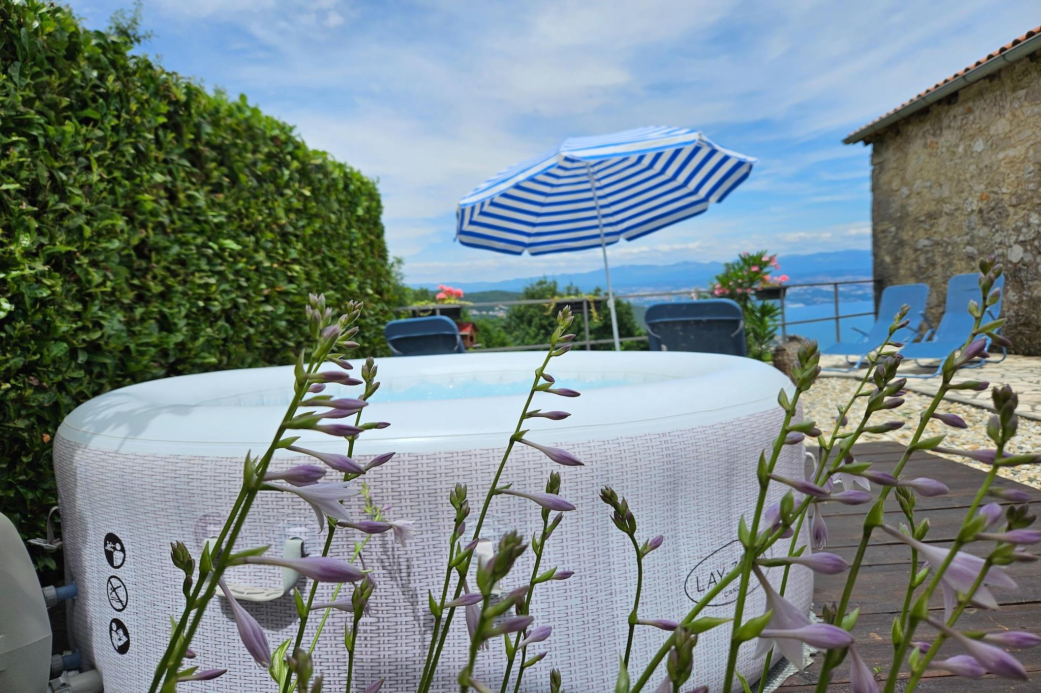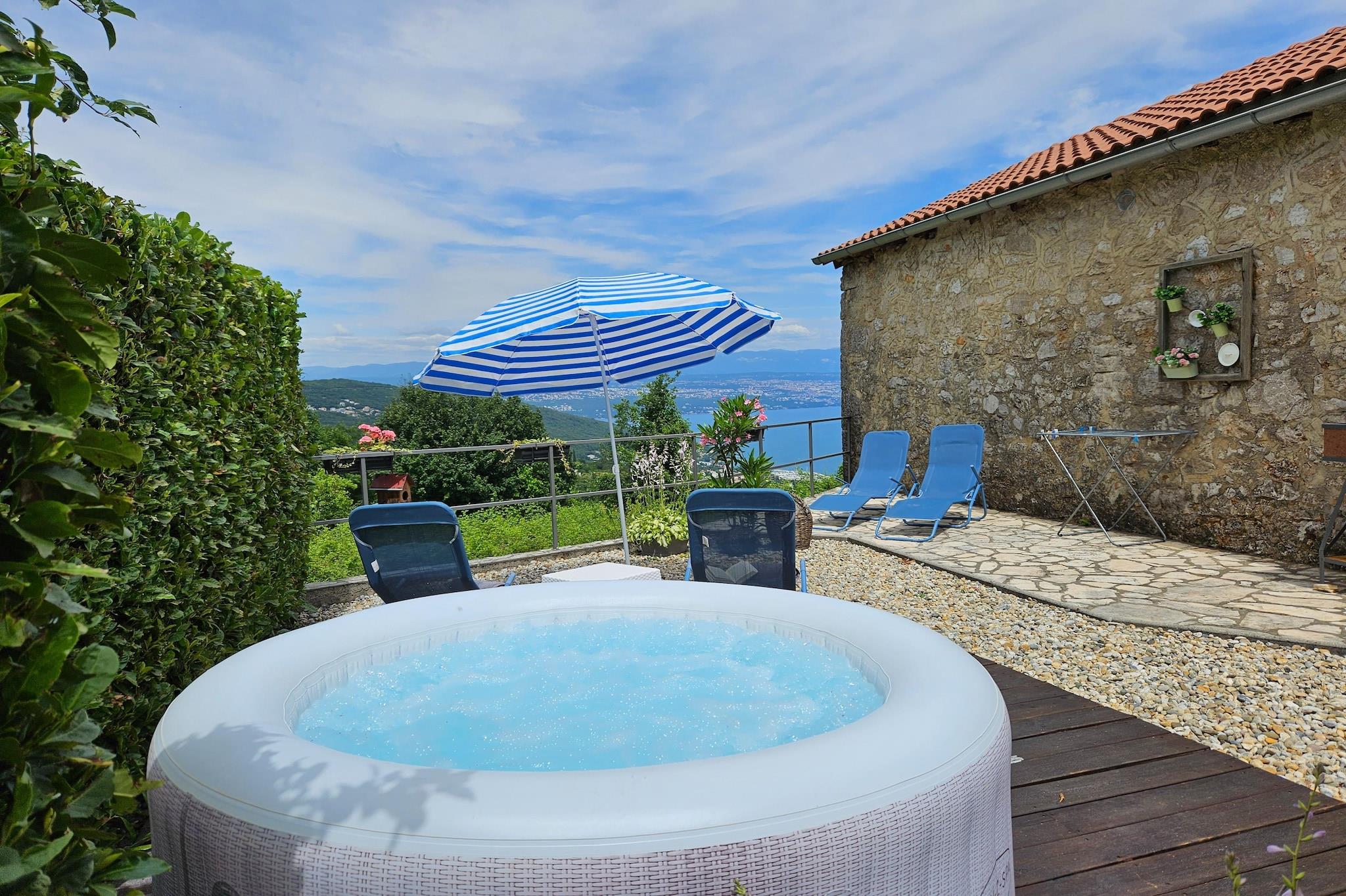 Lovingly renovated stone house from the 19th century with a beautiful view over Lovran and the sea, in the small village of Dobrec. The house is located above the small town of Lovran, on the slope of the Ucka mountain, ideal for those seeking peace and relaxation. From the entrance on the ground floor you enter the open living and dining room with adjoining hall and bathroom. A staircase leads to the basement, where there are two further bedrooms, one of which has access to the terrace. Outside there is another terrace with sun loungers, parasols and BBQ facilities. Lovran's cityscape is mainly characterized by beautiful Art Nouveau villas and beautiful parks with exotic plants. There are swimming opportunities here, especially along the 12 km long coastal promenade. Details included: consumption-based energy costs, bed linen, towels, final cleaning. Activities nearby: Hiking in the hills around is one of the favorite activities in the area. Highly recommended is the ascent to the 1.400 m high mountain top Vojak, from where you will find a magnificent view to island Krk and even to Italy when the weather is clear. There are a number of other well maintained hiking trails, which are easier to pass. The longest walk leads from Lovran to Opatija. Not suitable for people with reduced mobility. Jacuzzi Availability: Open from 30.05. – 30.09. of the current year, possibly earlier depending on weather conditions.
