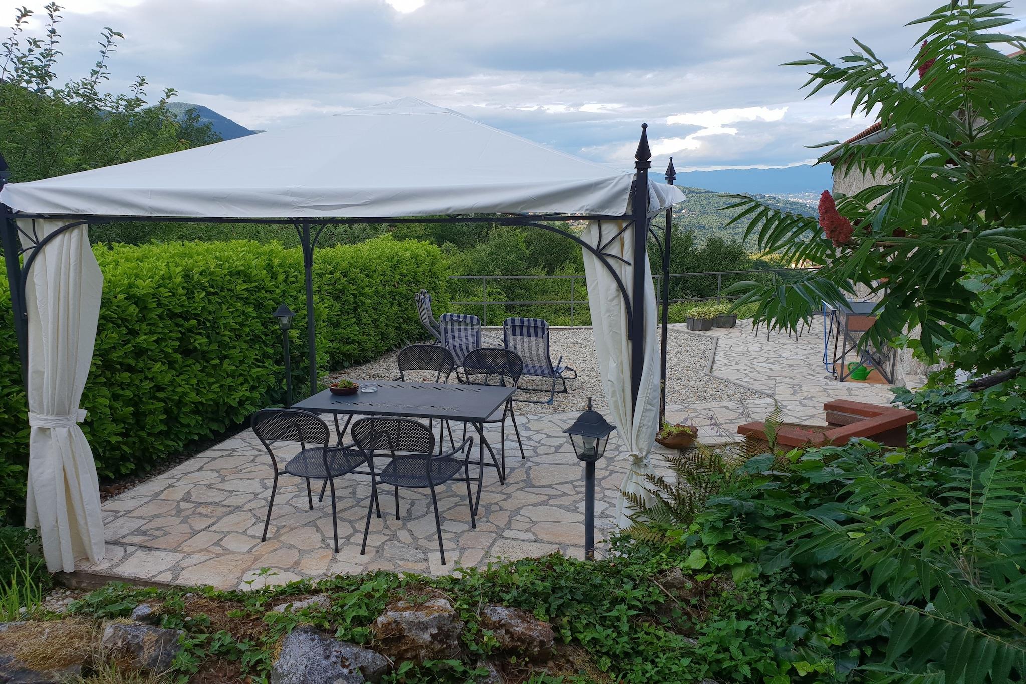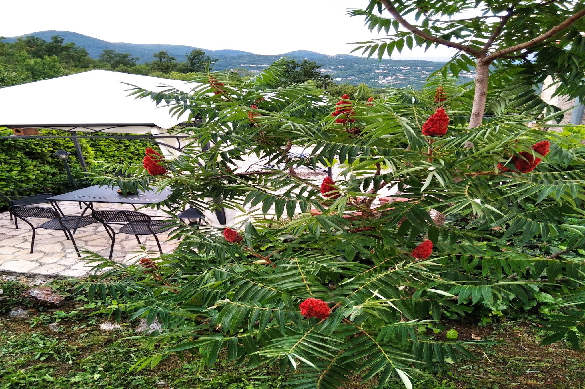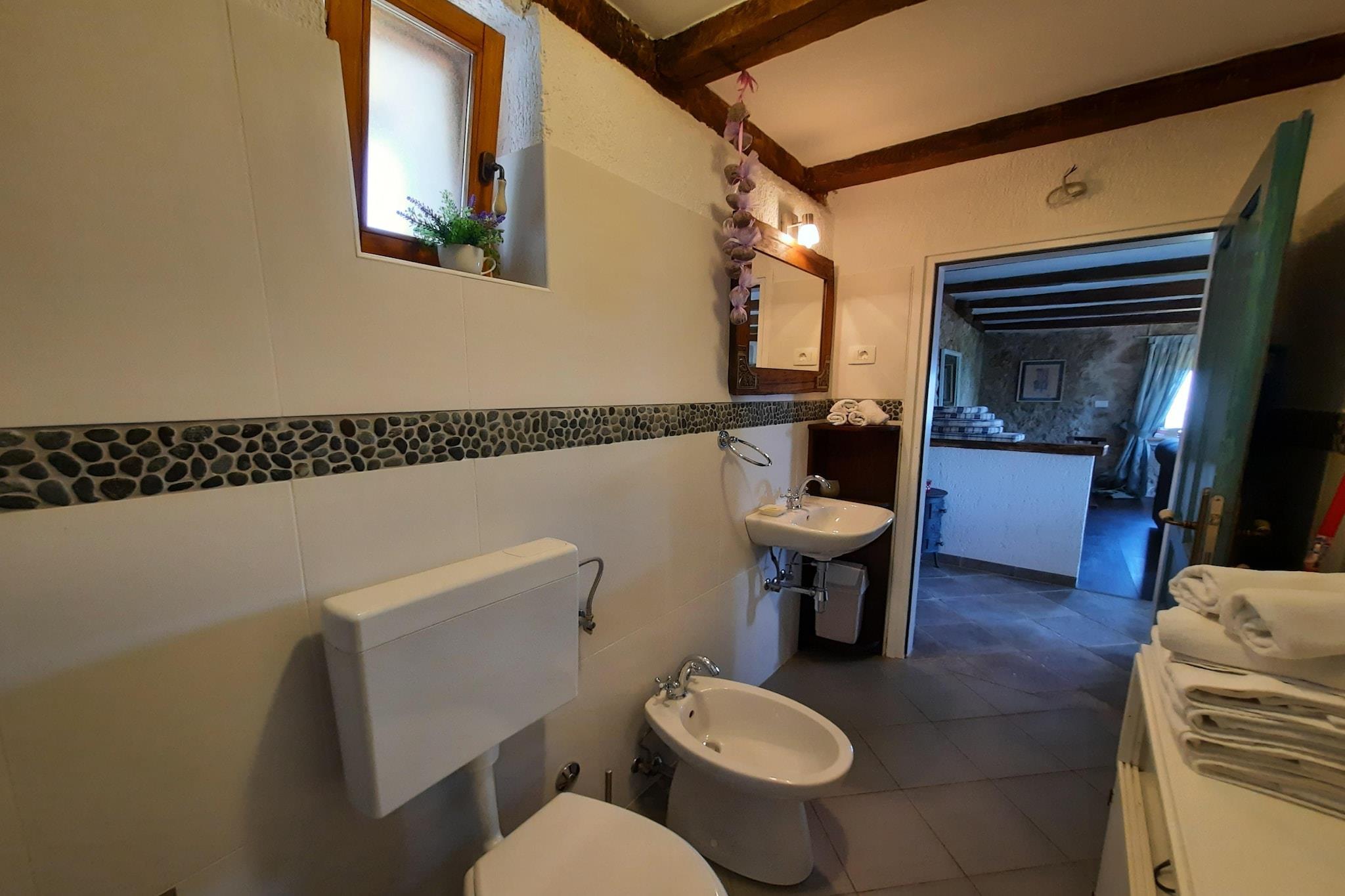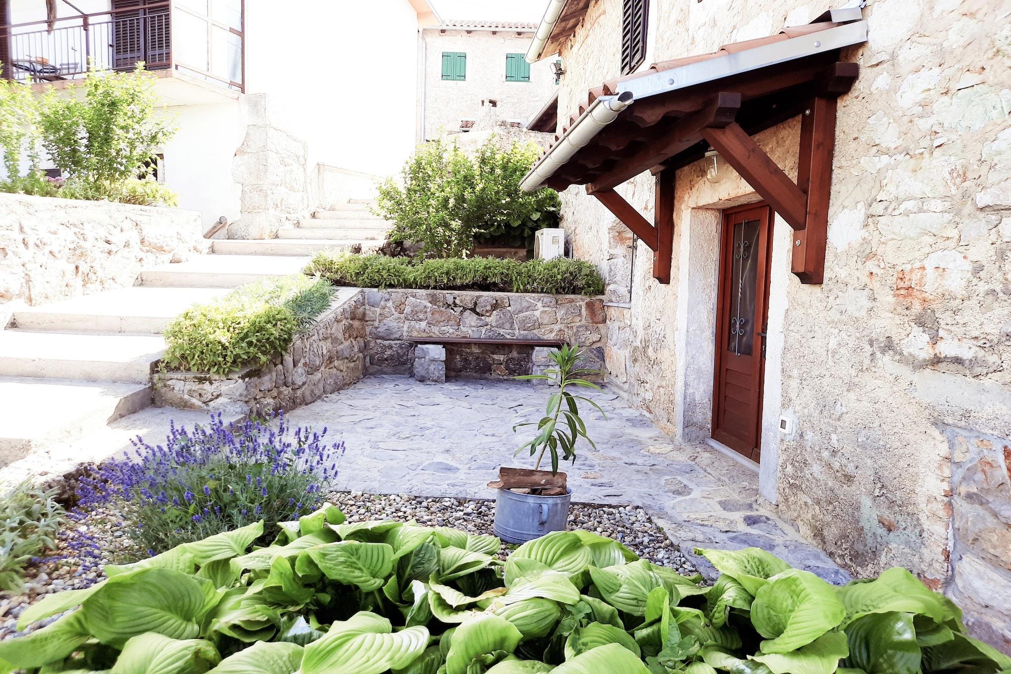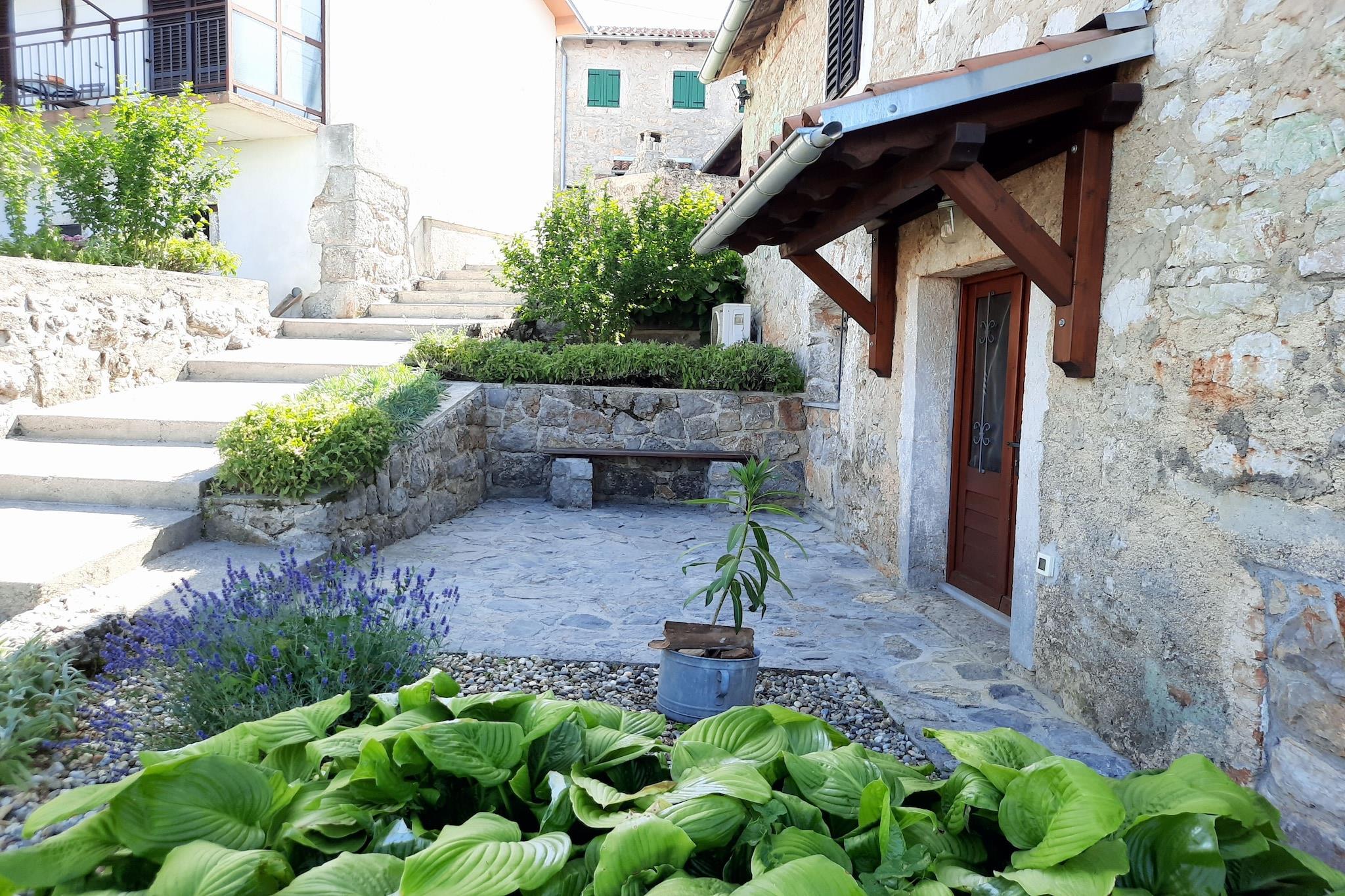 Lovingly renovated stone house from the 19th century with a beautiful view over Lovran and the sea, in the small village of Dobrec. The house is located above the small town of Lovran, on the slope of the Ucka mountain, ideal for those seeking peace and relaxation. From the entrance on the ground floor you enter the open living and dining room with adjoining hall and bathroom. A staircase leads to the basement, where there are two further bedrooms, one of which has access to the terrace. Outside there is another terrace with sun loungers, parasols and BBQ facilities. Lovran's cityscape is mainly characterized by beautiful Art Nouveau villas and beautiful parks with exotic plants. There are swimming opportunities here, especially along the 12 km long coastal promenade. Details included: consumption-based energy costs, bed linen, towels, final cleaning. Activities nearby: Hiking in the hills around is one of the favorite activities in the area. Highly recommended is the ascent to the 1.400 m high mountain top Vojak, from where you will find a magnificent view to island Krk and even to Italy when the weather is clear. There are a number of other well maintained hiking trails, which are easier to pass. The longest walk leads from Lovran to Opatija. Not suitable for people with reduced mobility. Jacuzzi Availability: Open from 30.05. – 30.09. of the current year, possibly earlier depending on weather conditions.