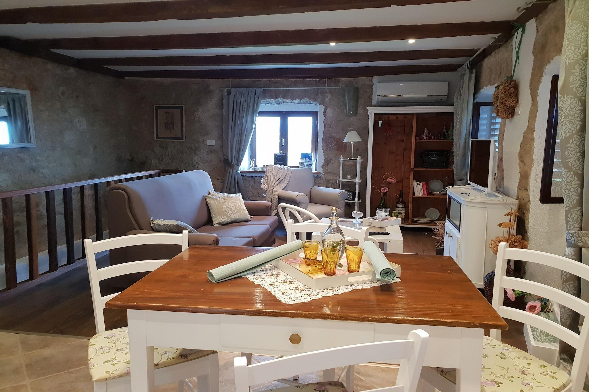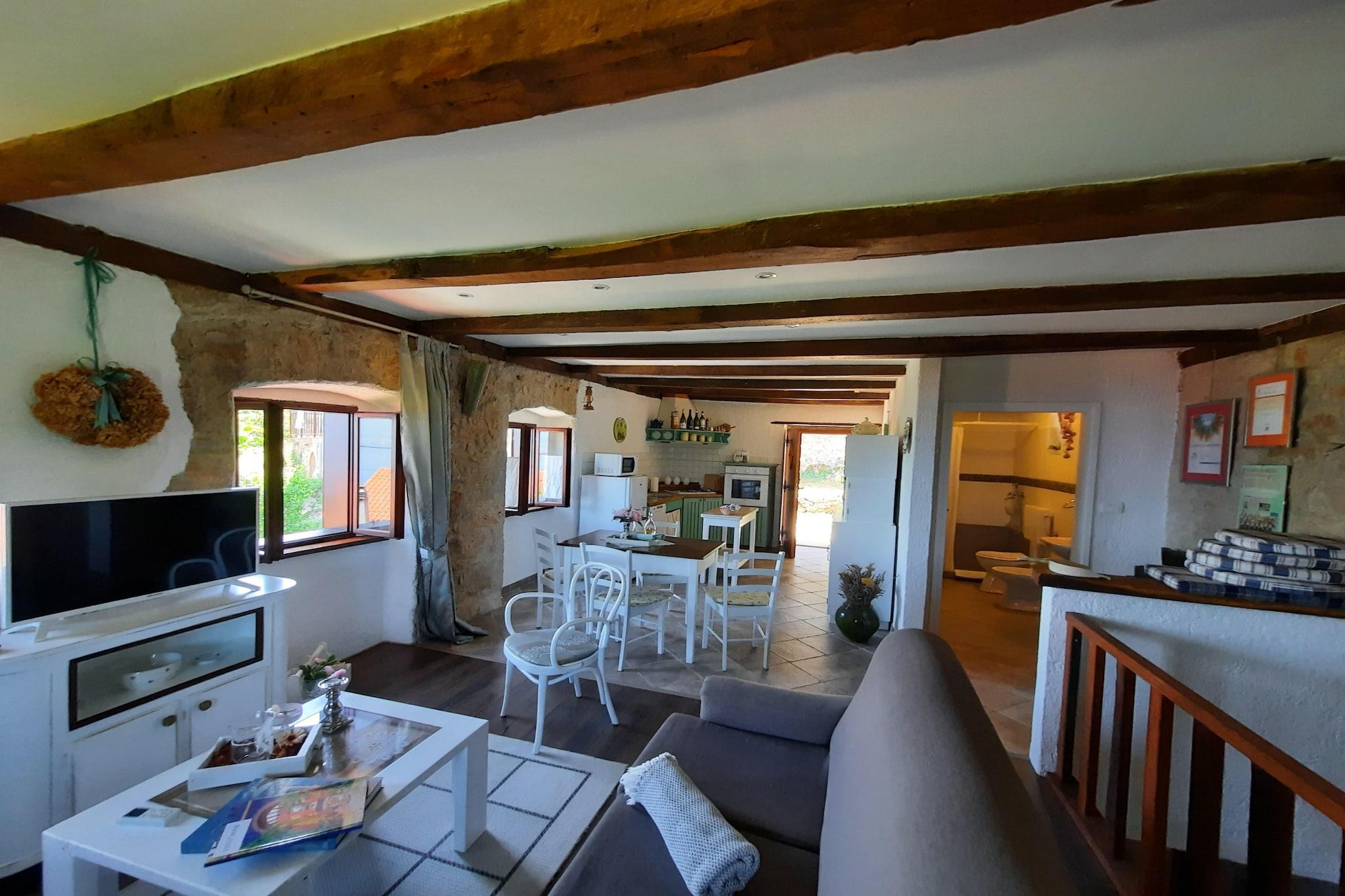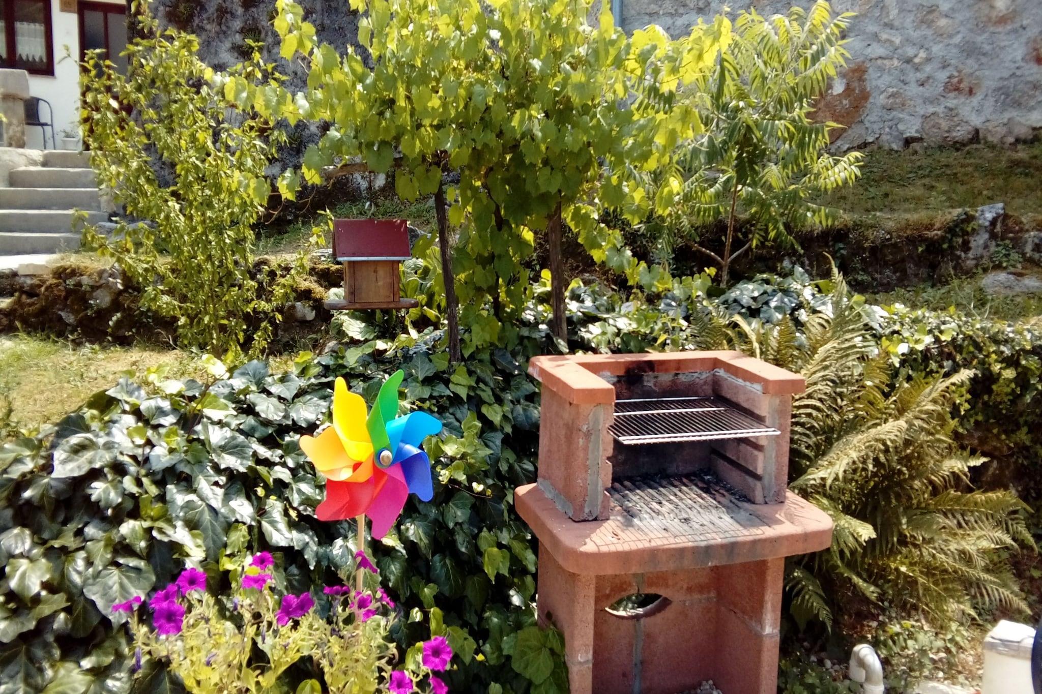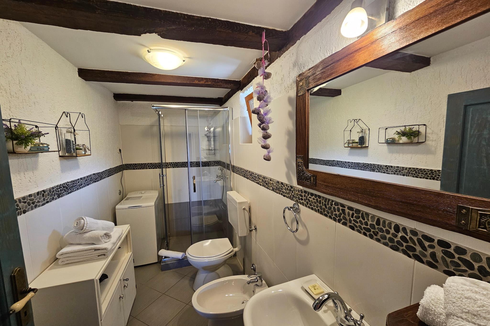 Lovingly renovated stone house from the 19th century with a beautiful view over Lovran and the sea, in the small village of Dobrec. The house is located above the small town of Lovran, on the slope of the Ucka mountain, ideal for those seeking peace and relaxation. From the entrance on the ground floor you enter the open living and dining room with adjoining hall and bathroom. A staircase leads to the basement, where there are two further bedrooms, one of which has access to the terrace. Outside there is another terrace with sun loungers, parasols and BBQ facilities. Lovran's cityscape is mainly characterized by beautiful Art Nouveau villas and beautiful parks with exotic plants. There are swimming opportunities here, especially along the 12 km long coastal promenade. Details included: consumption-based energy costs, bed linen, towels, final cleaning. Activities nearby: Hiking in the hills around is one of the favorite activities in the area. Highly recommended is the ascent to the 1.400 m high mountain top Vojak, from where you will find a magnificent view to island Krk and even to Italy when the weather is clear. There are a number of other well maintained hiking trails, which are easier to pass. The longest walk leads from Lovran to Opatija. Not suitable for people with reduced mobility. Jacuzzi Availability: Open from 30.05. – 30.09. of the current year, possibly earlier depending on weather conditions.