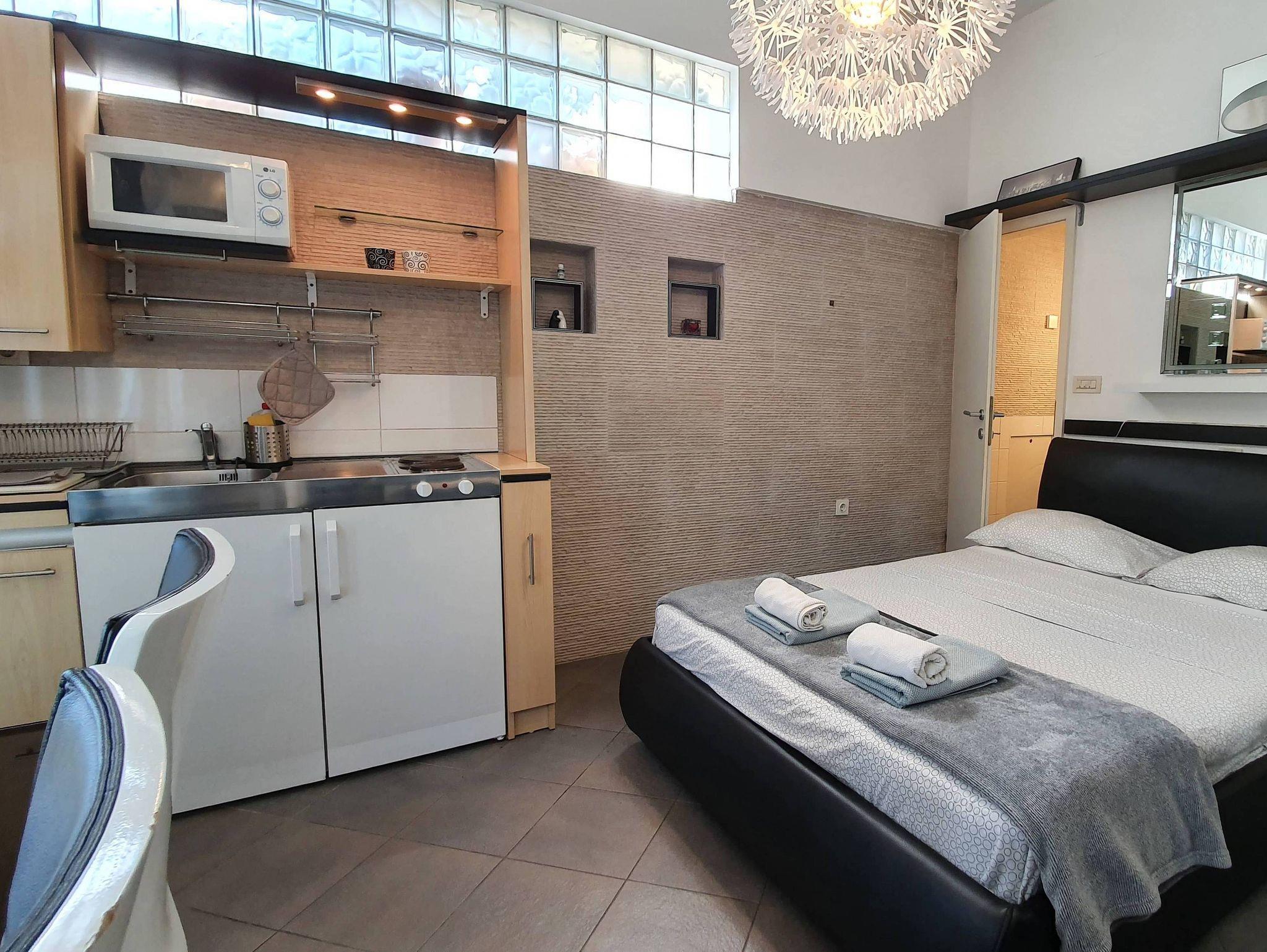 Studio bietet Platz für 2 Gäste. Die Betten sind in Schlafzimmern, die es 1 gibt, innerhalb einer Gesamtfläche von 18m2, angeordnet. Die Gäste haben eine eigene Terrasse zur Verfügung, auf der sie in warmen Sommernächten genießen können. Das Studio-Apartment bietet Meerblick. Es ist erlaubt, Speisen auf dem Gemeinschafts-Grill vorzubereiten. Während ihres Aufenthalts können Gäste das gemeinsam zur Nutzung stehende Schwimmbad benutzen. In der Unterkunftseinheit besteht die Möglichkeit des Mitbringens von Haustieren gegen Aufpreis. In der gebuchten Unterkunftseinheit zahlt man am Ort ein Depositum ( der Preis ist an der Internetseite angeführt ). IM PREIS INBEGRIFFEN: Kurtaxe, Endreinigung, Klimatisierung, Pool, Parkplatz, Internet, Wäschewaschen, Kinderbett, Bügeleisen, Bügelbrett, Föhn. VERBINDLICHE ZUSÄTZLICHE KOSTEN: Kaution (100,00 € Einmalzahlung), Aufzahlung für Kurzaufenthalte (prozentualer Zuschlag pro Nächtigungsanzahl: 30% - 1, 20% - 2, 10% - 3). UNVERBINDLICHE ZUSÄTZLICHE KOSTEN: Haustiere (10,00 € pro Nacht). Die Verfügbarkeit zusätzlicher Dienstleistungen in Ihrem reservierten Termin und die Preise derselben (falls nicht aufgeführt) müssen im Voraus überprüft werden. Zusätzliche Dienstleistungen die in der Zahlungsaufforderung nicht aufgeführt sind werden direkt beim Vermieter bezahlt, angenommen der Gast nutzt auch diese.