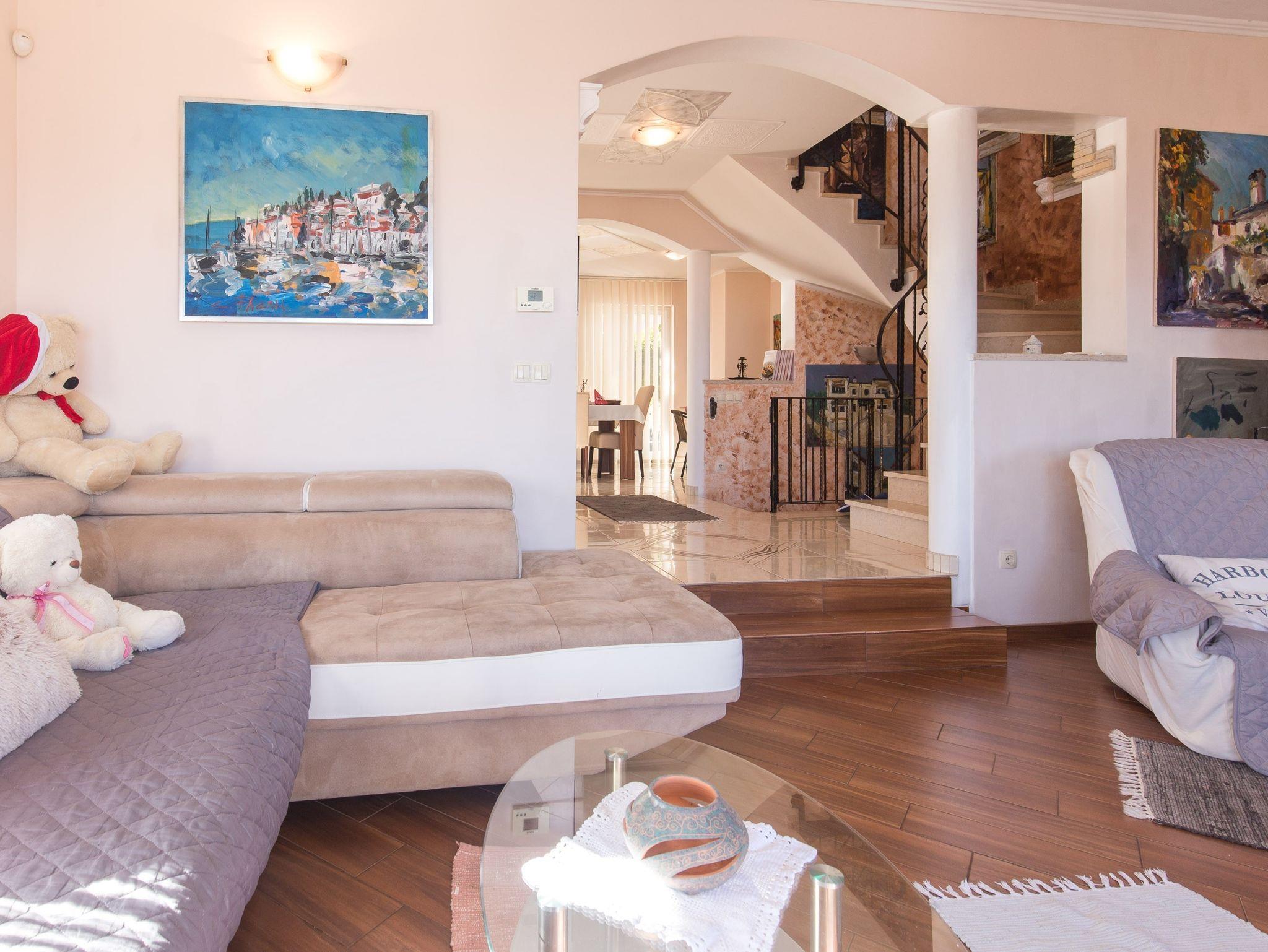 Haus bietet Platz für 12 Gäste. Die Betten sind in Schlafzimmern, die es 5 gibt, innerhalb einer Gesamtfläche von 234m2, angeordnet. Die Gäste haben eine eigene Terrasse zur Verfügung, auf der sie in warmen Sommernächten genießen können. Das Haus bietet Meerblick. Für vollen Genuss und Entspannung gibt es einen privaten Grill für Gäste dieser Unterkunft. Während ihres Aufenthalts können sich Gäste im privaten Schwimmbad entspannen. In der Unterkunftseinheit besteht die Möglichkeit des Mitbringens von Haustieren, und die Dienstleistung ist im Preis der Unterkunft enthalten. IM PREIS INBEGRIFFEN: Kurtaxe, Endreinigung, Klimatisierung, Zentralheizung, Pool, Parkplatz, Internet, Haustiere, Bügeleisen, Bügelbrett, Föhn. VERBINDLICHE ZUSÄTZLICHE KOSTEN: Aufzahlung für Kurzaufenthalte (prozentualer Zuschlag pro Nächtigungsanzahl: 30% - 1, 20% - 2, 10% - 3). UNVERBINDLICHE ZUSÄTZLICHE KOSTEN: Boot (250,00 € pro Nacht). Die Verfügbarkeit zusätzlicher Dienstleistungen in Ihrem reservierten Termin und die Preise derselben (falls nicht aufgeführt) müssen im Voraus überprüft werden. Zusätzliche Dienstleistungen die in der Zahlungsaufforderung nicht aufgeführt sind werden direkt beim Vermieter bezahlt, angenommen der Gast nutzt auch diese. Ermäßigung auf den Grundpreis: Gratistag 14=13 (bei einem Aufenthalt von 14 Tagen oder mehr erhalten Sie einen Gratistag für den Aufenthalt bis 31.12.26).