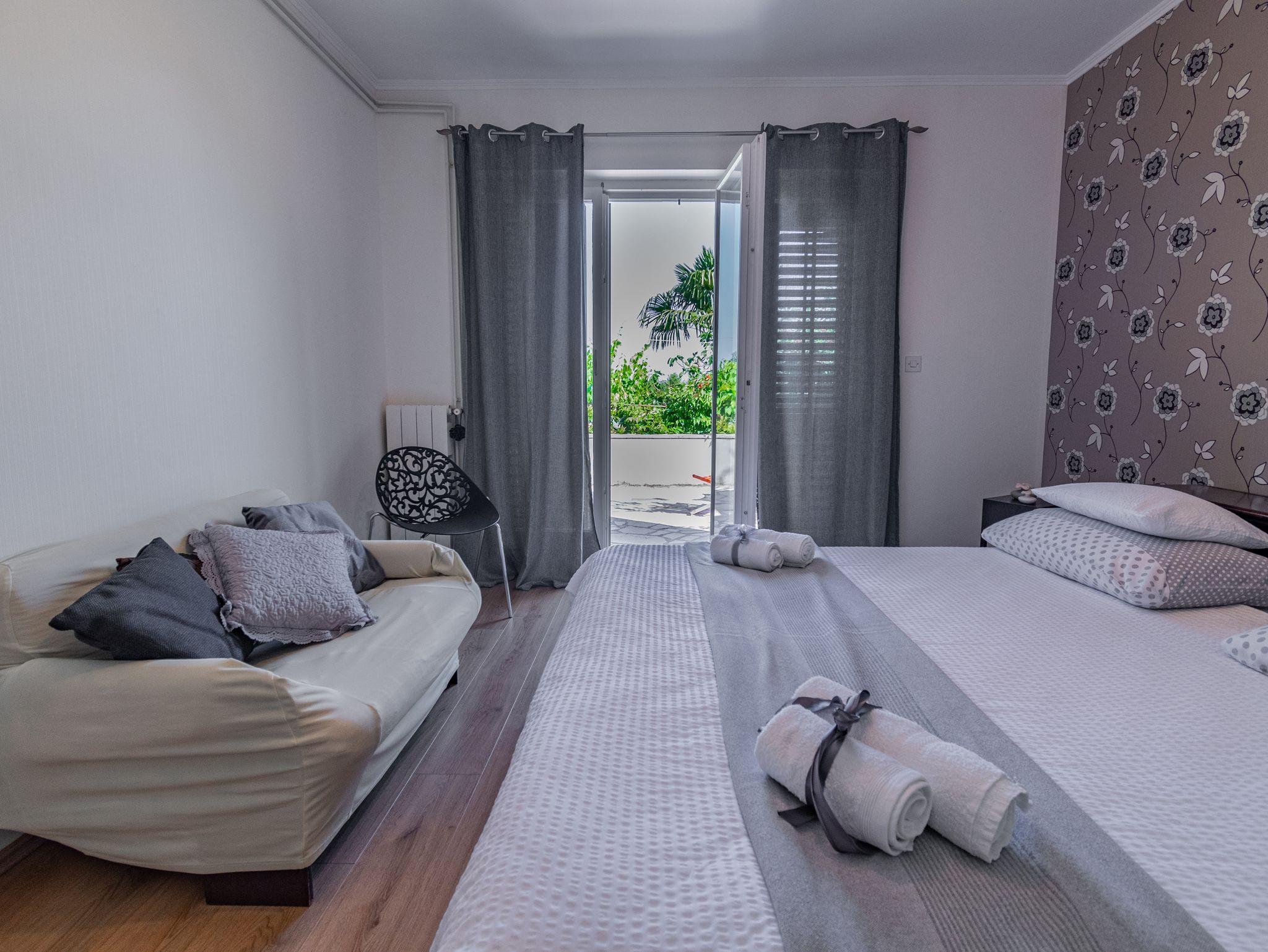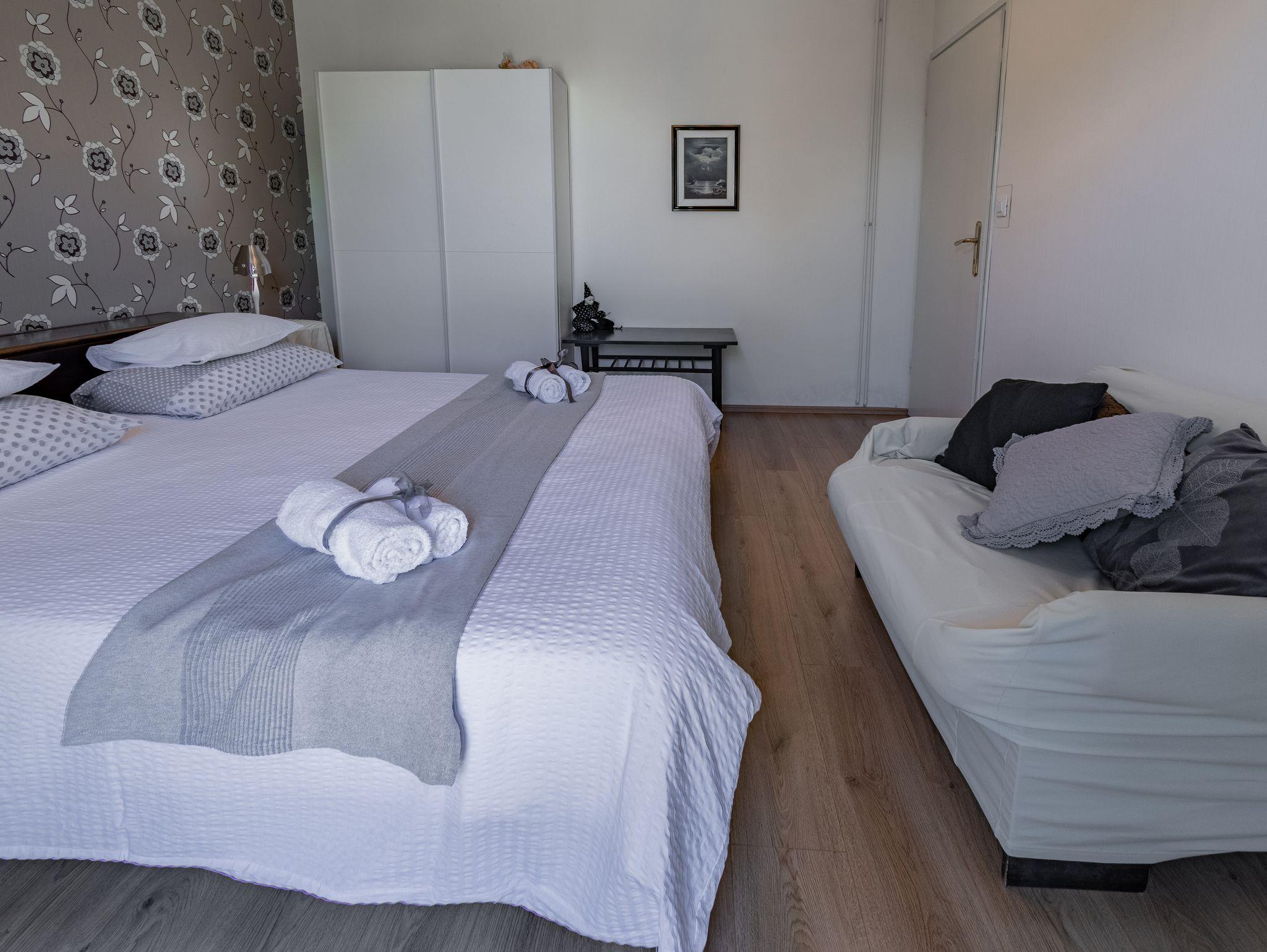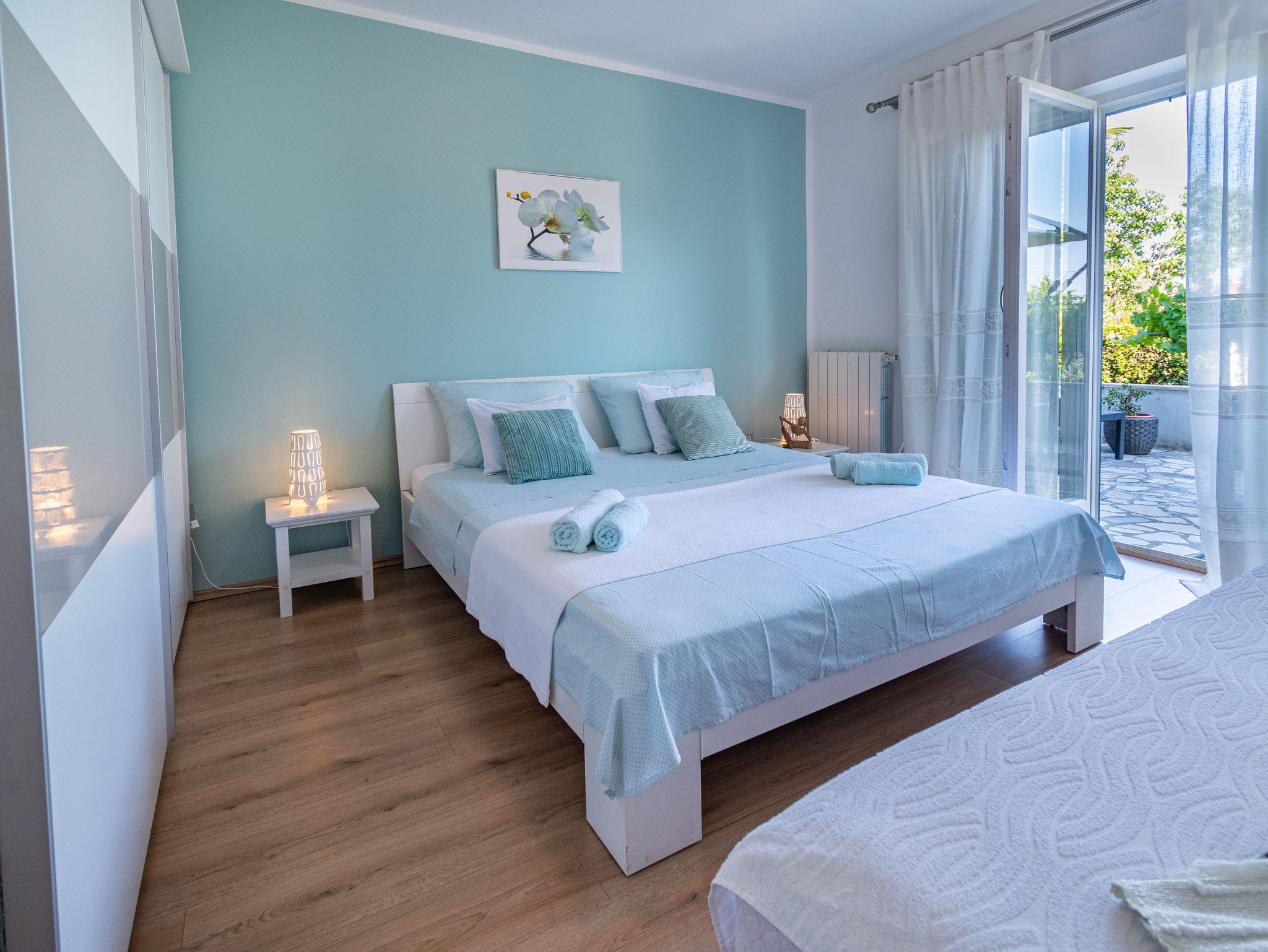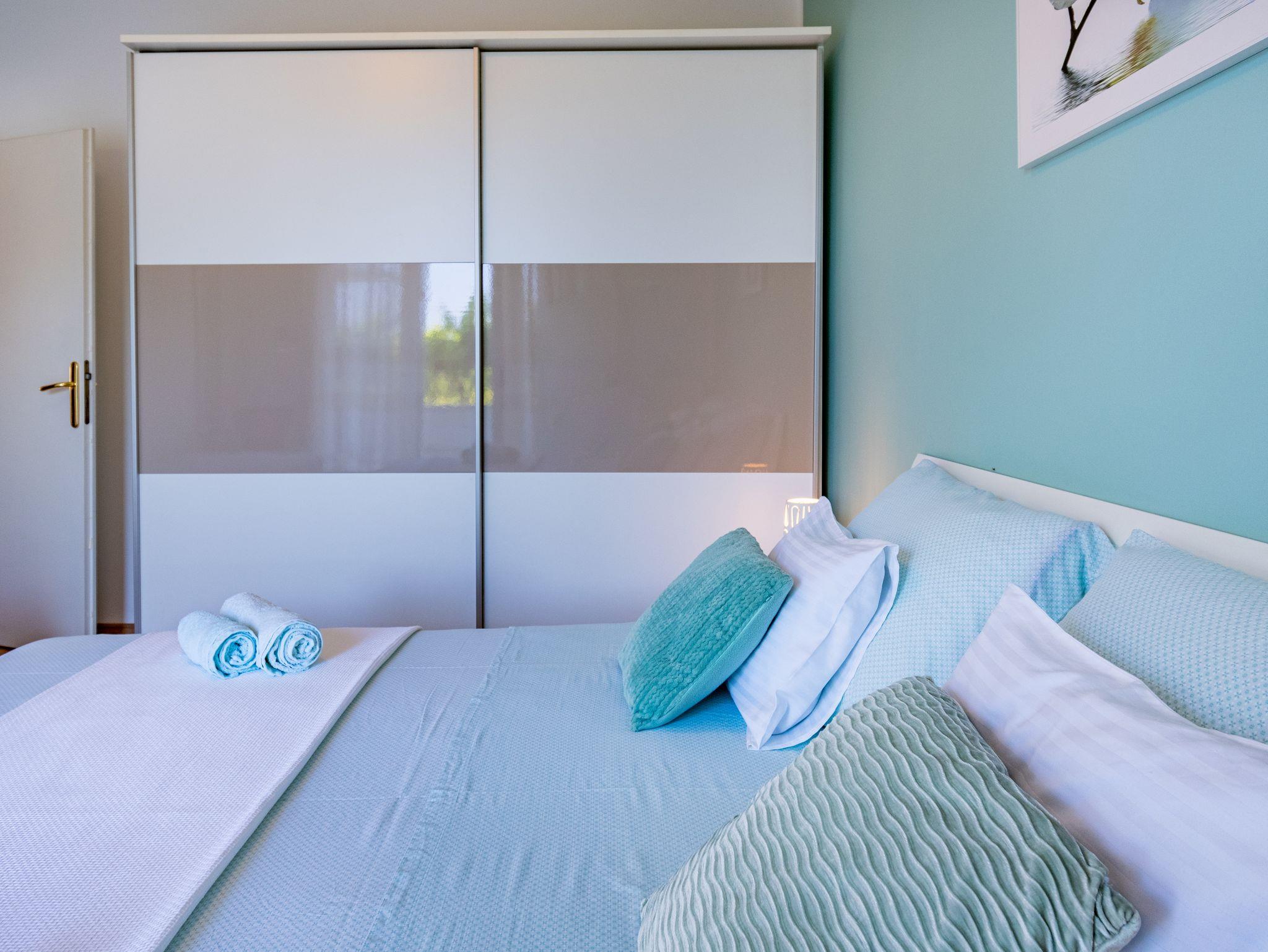 Ferienwohnung bietet Platz für 5 Gäste. Die Betten sind in Schlafzimmern, die es 3 gibt, innerhalb einer Gesamtfläche von 72m2, angeordnet. Die Gäste haben eine eigene Terrasse zur Verfügung, auf der sie in warmen Sommernächten genießen können. Das Apartment bietet Meerblick. IM PREIS INBEGRIFFEN: Kurtaxe, Endreinigung, Zentralheizung, Parkplatz, Internet, Bügeleisen, Bügelbrett. VERBINDLICHE ZUSÄTZLICHE KOSTEN: Aufzahlung für Kurzaufenthalte (prozentualer Zuschlag pro Nächtigungsanzahl: 30% - 1, 20% - 2, 10% - 3). UNVERBINDLICHE ZUSÄTZLICHE KOSTEN: Klimatisierung (5,00 € pro Nacht). Die Verfügbarkeit zusätzlicher Dienstleistungen in Ihrem reservierten Termin und die Preise derselben (falls nicht aufgeführt) müssen im Voraus überprüft werden. Zusätzliche Dienstleistungen die in der Zahlungsaufforderung nicht aufgeführt sind werden direkt beim Vermieter bezahlt, angenommen der Gast nutzt auch diese. Ermäßigung auf den Grundpreis: Gratistag 14=13 (bei einem Aufenthalt von 14 Tagen oder mehr erhalten Sie einen Gratistag für den Aufenthalt bis 31.12.26).