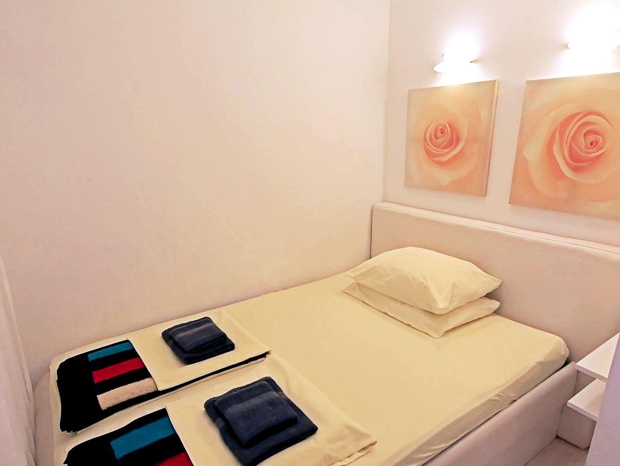 Ferienwohnung bietet Platz für 4 Gäste. Die Betten sind in Schlafzimmern, die es 2 gibt, innerhalb einer Gesamtfläche von 60m2, angeordnet. Die Gäste haben eine eigene Terrasse zur Verfügung, auf der sie in warmen Sommernächten genießen können. Das Apartment bietet Meerblick. Es ist erlaubt, Speisen auf dem Gemeinschafts-Grill vorzubereiten. Während ihres Aufenthalts können Gäste das gemeinsam zur Nutzung stehende Schwimmbad benutzen. In der Unterkunftseinheit besteht die Möglichkeit des Mitbringens von Haustieren gegen Aufpreis. In der gebuchten Unterkunftseinheit zahlt man am Ort ein Depositum ( der Preis ist an der Internetseite angeführt ). IM PREIS INBEGRIFFEN: Kurtaxe, Endreinigung, Klimatisierung, Pool, Parkplatz, Internet, Wäschewaschen, Kinderbett, Bügeleisen, Bügelbrett, Föhn. VERBINDLICHE ZUSÄTZLICHE KOSTEN: Kaution (100,00 € Einmalzahlung), Aufzahlung für Kurzaufenthalte (prozentualer Zuschlag pro Nächtigungsanzahl: 30% - 1, 20% - 2, 10% - 3). UNVERBINDLICHE ZUSÄTZLICHE KOSTEN: Haustiere (10,00 € pro Nacht). Die Verfügbarkeit zusätzlicher Dienstleistungen in Ihrem reservierten Termin und die Preise derselben (falls nicht aufgeführt) müssen im Voraus überprüft werden. Zusätzliche Dienstleistungen die in der Zahlungsaufforderung nicht aufgeführt sind werden direkt beim Vermieter bezahlt, angenommen der Gast nutzt auch diese.