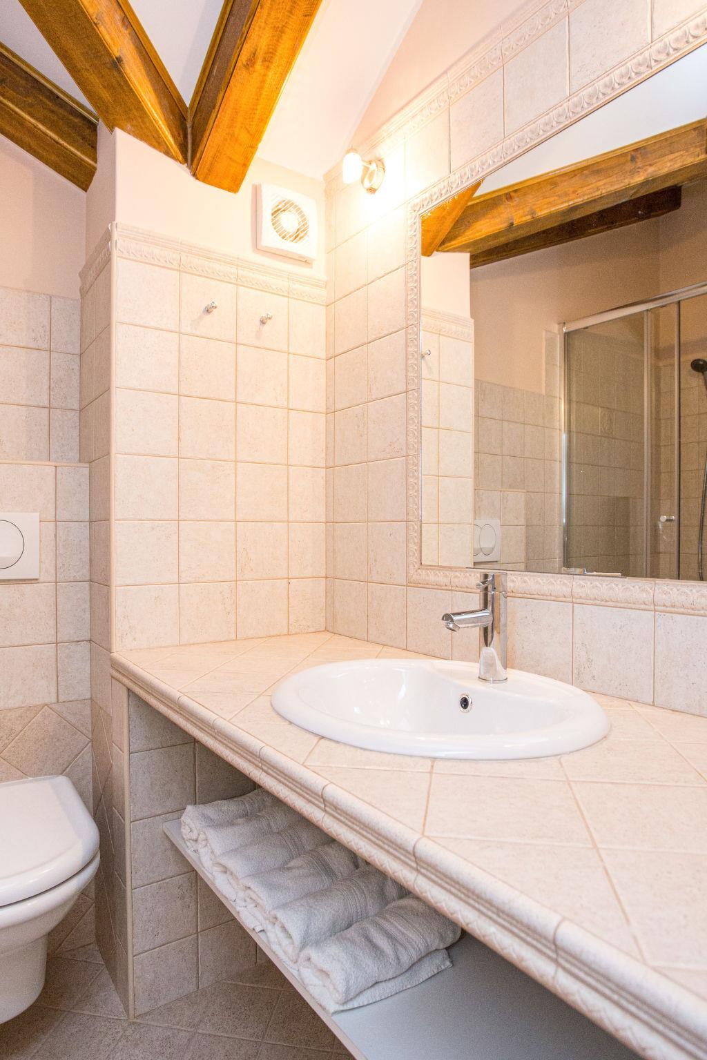 6-room house 165 m2 on 2 levels. Living/dining room with 1 double sofabed (140 cm, length 200 cm), satellite TV (flat screen), air conditioning. Exit to the terrace. 1 room with 1 french bed (160 cm, length 200 cm). Living/dining room with open-hearth fireplace (only for decoration), kitchen corner and satellite TV (flat screen), air conditioning. Exit to the balcony. Open kitchen (oven, dishwasher, 4 induction hot plates, toaster, kettle, freezer, electric coffee machine). Shower/WC, sep. WC. Electric heating, forced-air heating. Upper floor: with sloping ceilings, 3 rooms, ceiling height 170 - 210 cm, each room with 1 french bed (160 cm, length 200 cm), shower/WC and satellite TV (flat screen), air conditioning. Balcony 13 m2, terrace 50 m2. Terrace furniture, deck chairs (10). Panoramic view of the countryside. Facilities: Internet (WiFi, free). 1 small pet/ dog allowed. Semi-detached house: living/dining area and open kitchen on the ground floor, 3 bedrooms on the first floor. Separate house: living/dining area, open kitchen and one bedroom on the ground floor.